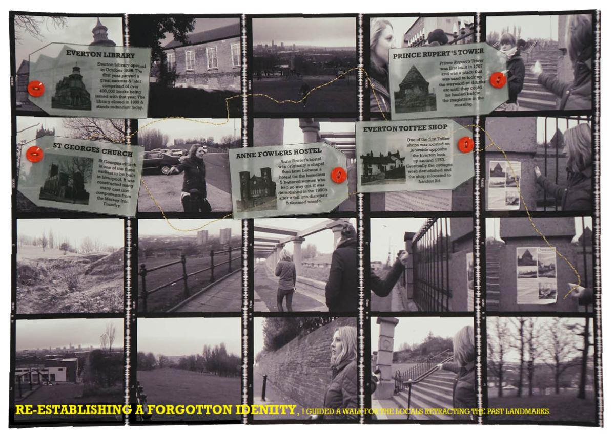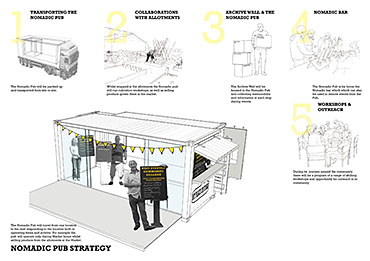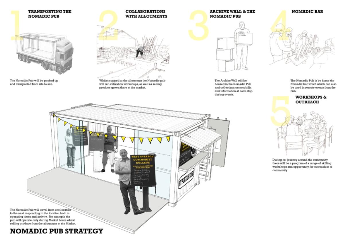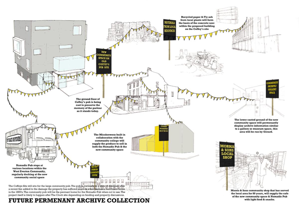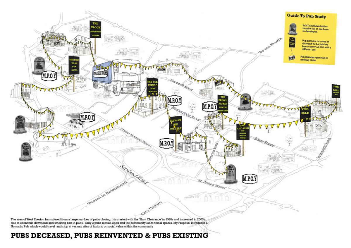 My Place or Yours? Part 1 Project 2012 Lauren Campany London Metropolitan University | UK This project is a student initiated Live Project with real clients located within the West Everton Community, Liverpool. Despite being located approximately 1 mile from Liverpool City Centre, Everton is the poorest ward out of 30 making up the city of Liverpool; this is due to many political and economical set backs over the past 50 years.My project deals with this deprived urban context and develops a strategy for community regeneration, which consists of a series of strategic proposals at varying scales: some of which I have been implementing and some which are proposed for the future.A large part of West Everton is taken up by a mass of green space known asEverton Park. This land which is a result of “the slum clearance” of the1960’s was never developed and turfed instead. I found that this green land never had park status and was never part of the city’s public realm. I shared this with West Everton community council in 2011 and they asked the council to change this status. In 2012 Everton park became officially a park. I also mapped and undertook a Walk that traced the past significance of the area and its characteristics, such as exposed building foundations and dramatic changes in terrain.Throughout the past twenty years Everton has seen a vast decline in the number of local pubs, which has led to drinking at home, depression and lack of social hubs to replace this void. Pubs were major social spaces within the community. My strategy for West Everton includes a “Nomadic Public House” made from readily available shipping container which will host outreach programs by West Everton community council, deliver skilling programs in collaboration with Shewsbury house youth centre, food production workshops, a temporary archive of everyday life in the old pubs and sale of drinks at major events in Liverpool to raise money for the project. The mobile structure will be constructed in collaboration with Liverpool Community College staff and students which is already agreed. Building into the Liverpool Community College curriculum we will construct a local microbrewer¬¬y on one of the old pub sites – Clock Works, which will barter berries from a local community allotment in exchange for discounted beer for the “Nomadic Pub” to sell at major events to create a revenue for the project. West Everton community council and Liverpool Biennial arts organisation have put a bid to the arts council to realise the “Nomadic pub”. Tutor(s) Sandra Denicke-Polcher Torange Khonsari