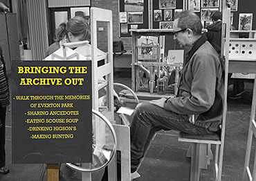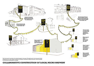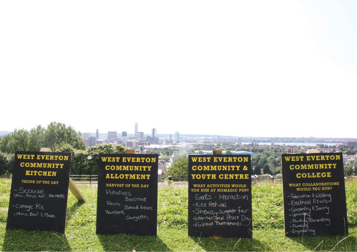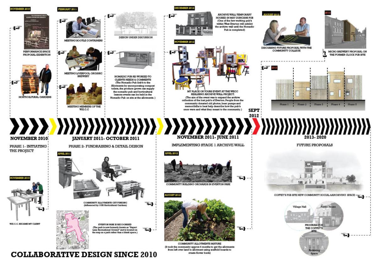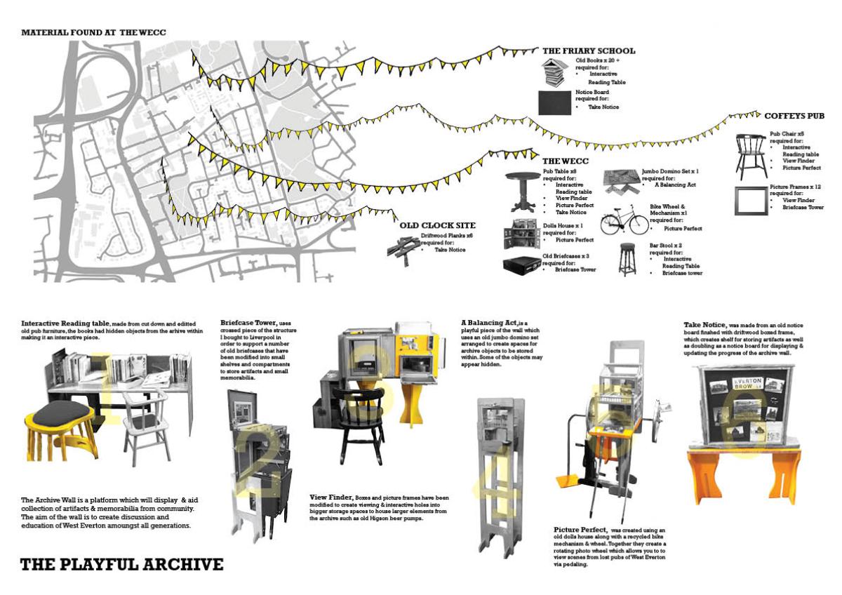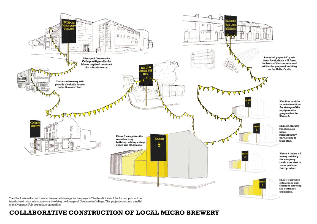 My Place or Yours? Part 1 Project 2012 Lauren Campany London Metropolitan University | UK This project is a student initiated Live Project with real clients located within the West Everton Community, Liverpool. Despite being located approximately 1 mile from Liverpool City Centre, Everton is the poorest ward out of 30 making up the city of Liverpool; this is due to many political and economical set backs over the past 50 years.My project deals with this deprived urban context and develops a strategy for community regeneration, which consists of a series of strategic proposals at varying scales: some of which I have been implementing and some which are proposed for the future.A large part of West Everton is taken up by a mass of green space known asEverton Park. This land which is a result of “the slum clearance” of the1960’s was never developed and turfed instead. I found that this green land never had park status and was never part of the city’s public realm. I shared this with West Everton community council in 2011 and they asked the council to change this status. In 2012 Everton park became officially a park. I also mapped and undertook a Walk that traced the past significance of the area and its characteristics, such as exposed building foundations and dramatic changes in terrain.Throughout the past twenty years Everton has seen a vast decline in the number of local pubs, which has led to drinking at home, depression and lack of social hubs to replace this void. Pubs were major social spaces within the community. My strategy for West Everton includes a “Nomadic Public House” made from readily available shipping container which will host outreach programs by West Everton community council, deliver skilling programs in collaboration with Shewsbury house youth centre, food production workshops, a temporary archive of everyday life in the old pubs and sale of drinks at major events in Liverpool to raise money for the project. The mobile structure will be constructed in collaboration with Liverpool Community College staff and students which is already agreed. Building into the Liverpool Community College curriculum we will construct a local microbrewer¬¬y on one of the old pub sites – Clock Works, which will barter berries from a local community allotment in exchange for discounted beer for the “Nomadic Pub” to sell at major events to create a revenue for the project. West Everton community council and Liverpool Biennial arts organisation have put a bid to the arts council to realise the “Nomadic pub”. Tutor(s) Sandra Denicke-Polcher Torange Khonsari