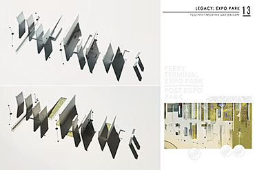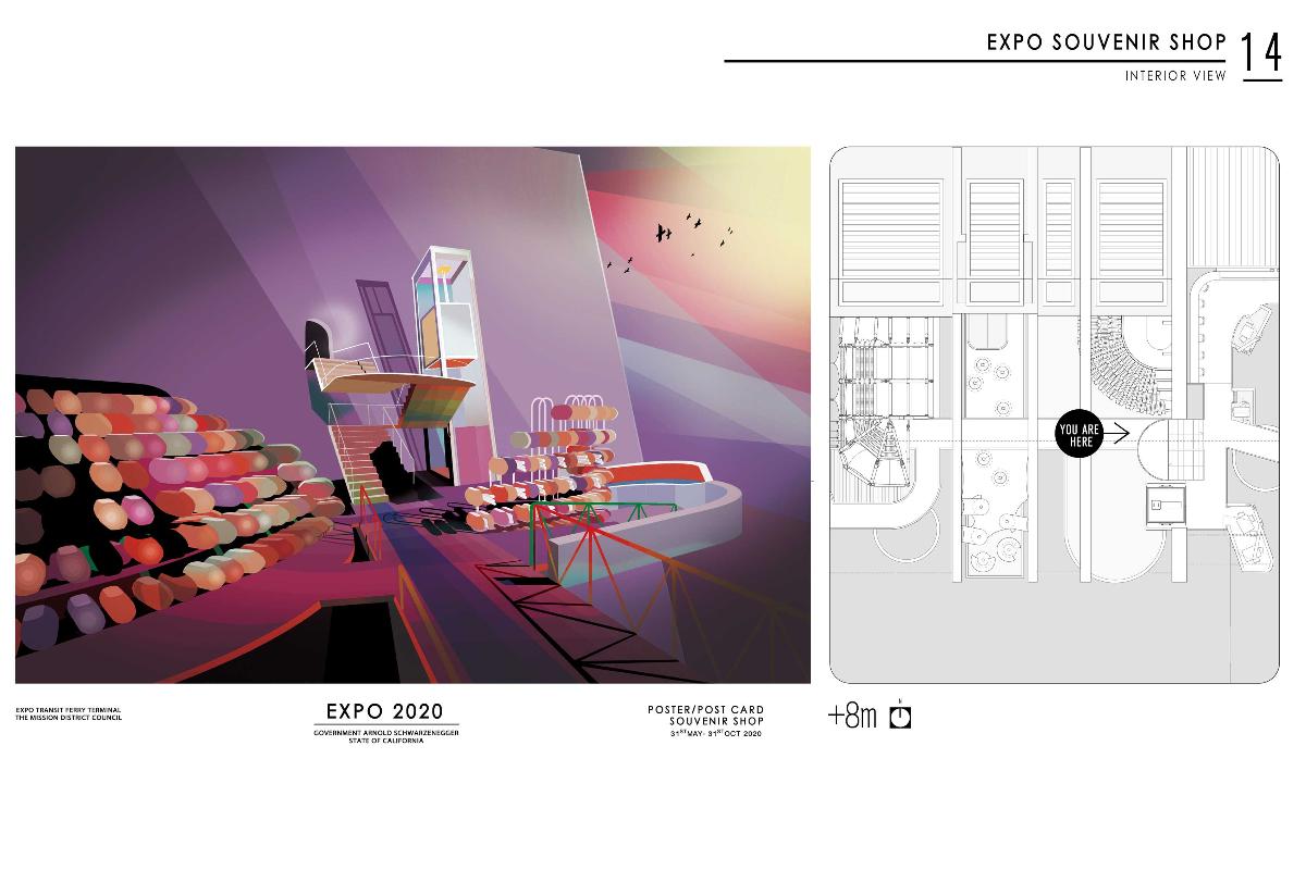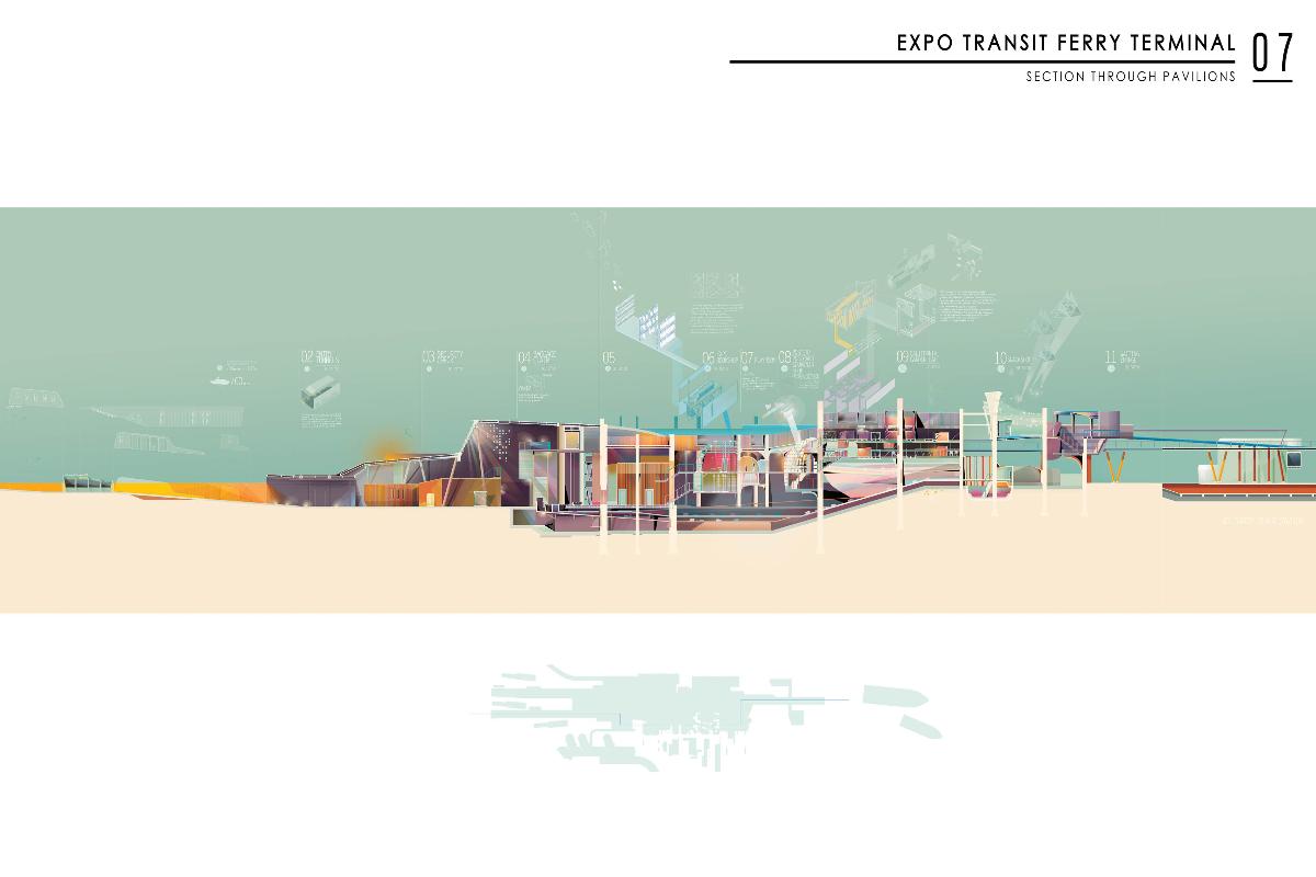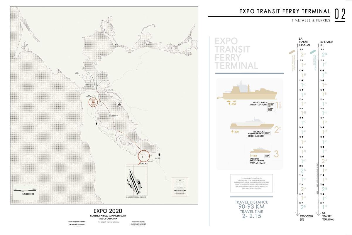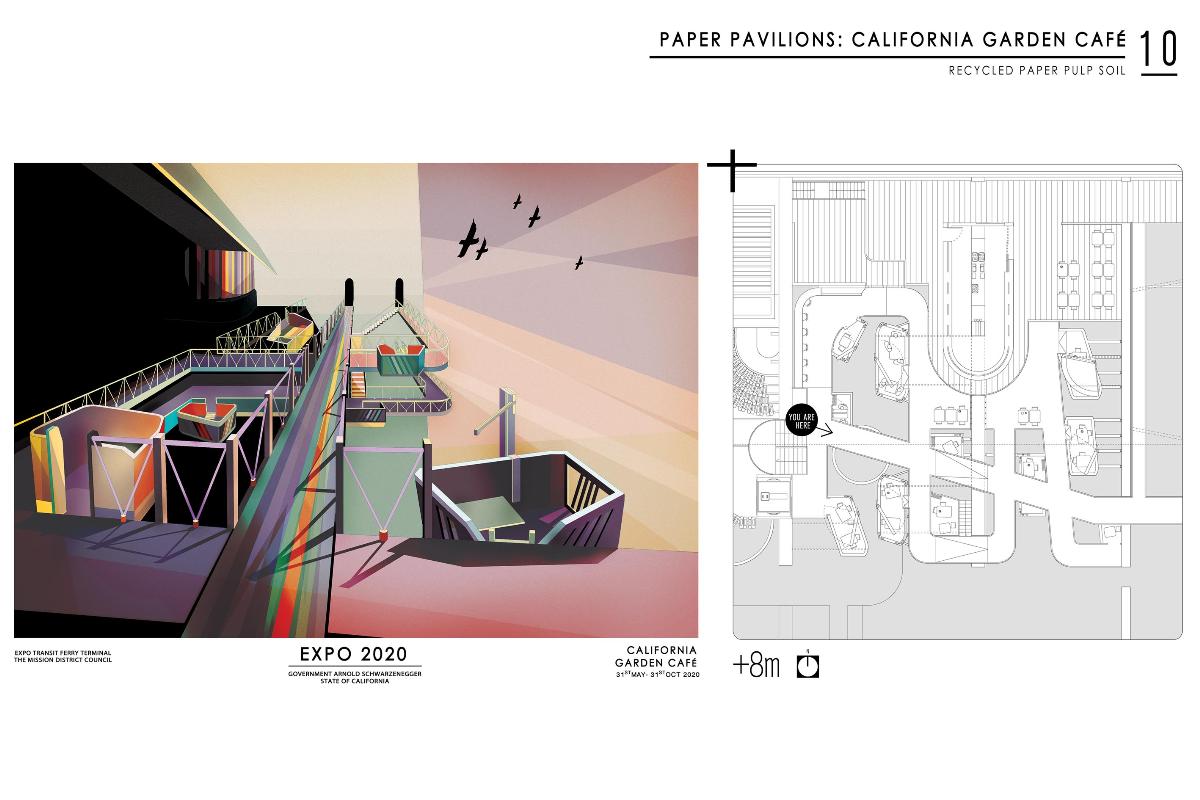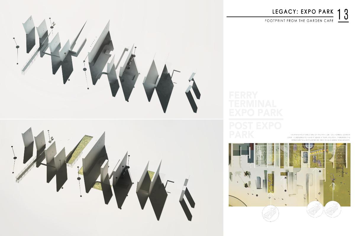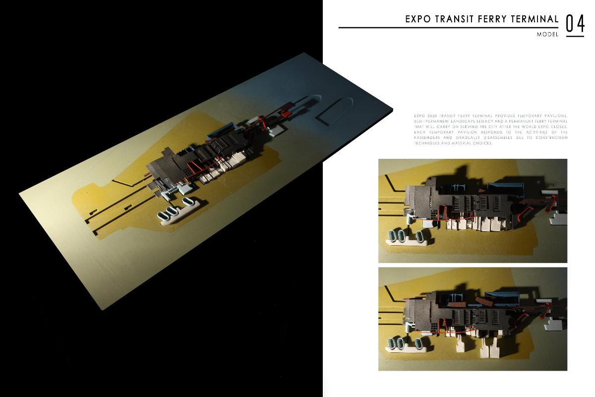 EXPO[SÉ]: S.F. Expo 2020 Transit Ferry Terminal Part 1 Project 2012 Brook [T.J.] Lin The Bartlett School of Architecture, UCL | UK In 2020 Silicon Valley had hoped to hold an International Exposition, which would have been the third such event in the San Francisco area’s lifetime. The Bay Area is now investigating an application for Expo 2025.An international event series held in the interest of promoting national assets; technological, cultural and economic, the built construct of the Expo has historically provided a playground for architectural innovation; the individual pavilions of the fair exemplars of experimental and speculative systems for the built environment. The fair exists in a dichotomy - temporary pavilions embody proposals for lasting progression, bringing into question the notion of the event, and its legacy.In response to the sudden surge in demand on the city’s transportation infrastructure, the project proposes a Ferry Terminal for the anticipated Silicon Valley Expo 2020, serving visitors travelling from the east coast of the Bay Area to the proposed site in Moffett Federal Airfield. The building experiences two conditions; providing temporary pavilions and a semi-permanent landscape for tourists in the spirit of the fair during the 6 month Expo period, woven throughout a permanent ferry terminal, a lasting intervention in the city following the events closure. Each temporary pavilion responds to the influx of passengers, gradually transforming and eventually disassembling as the event draws to a close - the inevitable temporality of the event intrinsic to way people engage with it and its materiality.Driven by experimentation with plentiful and easily attainable short-lifespan materials, such as cardboard and paper, and playful interpretations of temporary construction techniques, the building proposes an alternative to the wasteful and inefficient use of unsustainable materials typical of the Expo. Its considered breakdown into component parts begins a process of reassembly and re-application for the sites post-Expo life as the momentary hysteria of the event passes and the building settles into the urban fabric of San Francisco. Tutor(s) Ms Ana Monrabal-Cook Luke Pearson