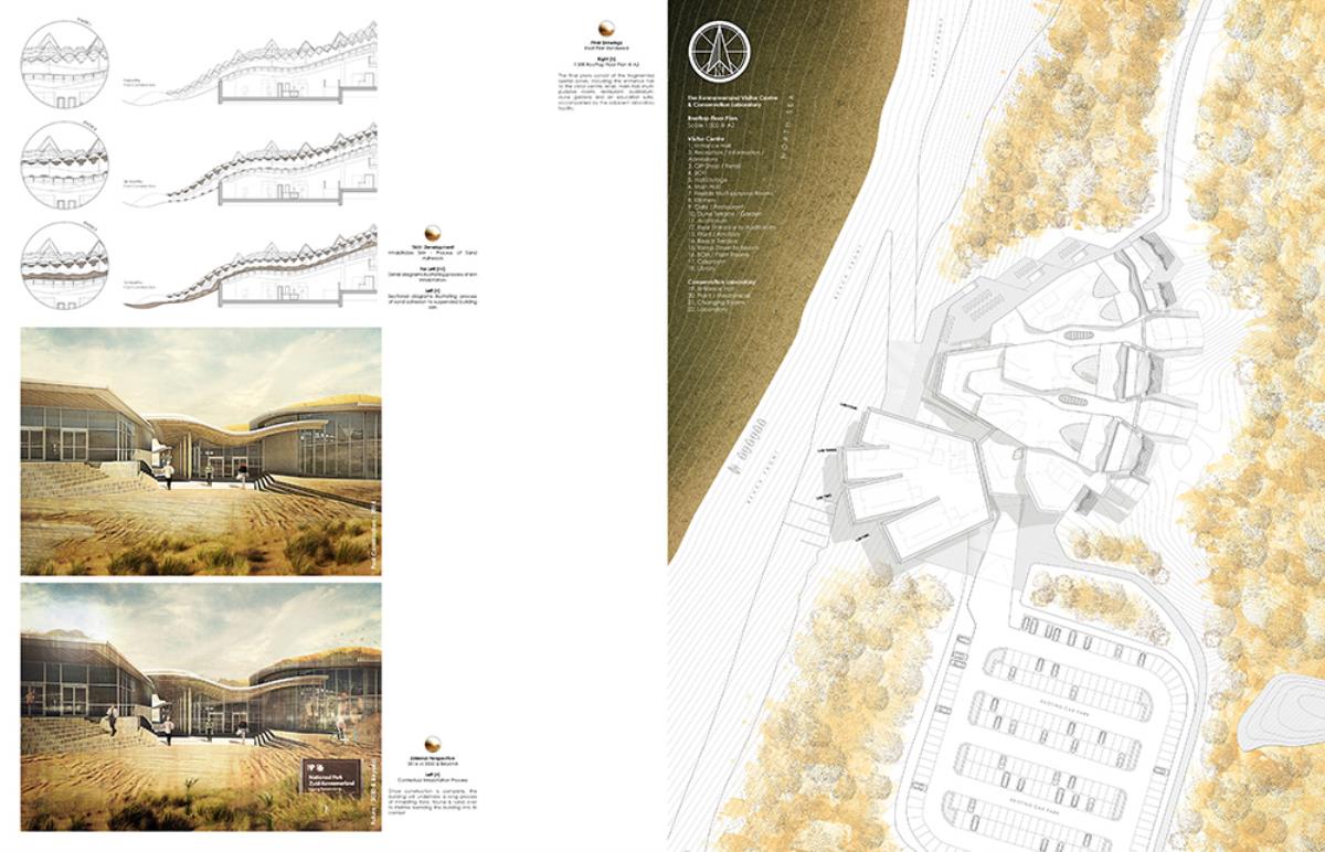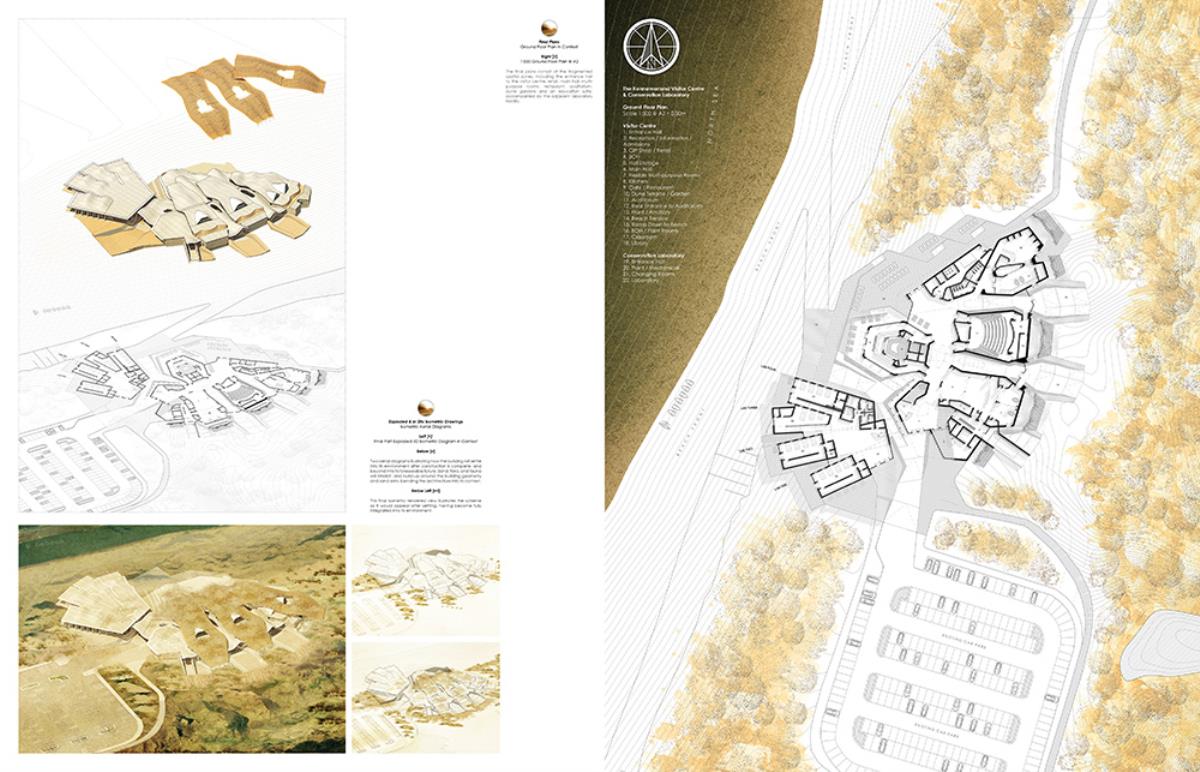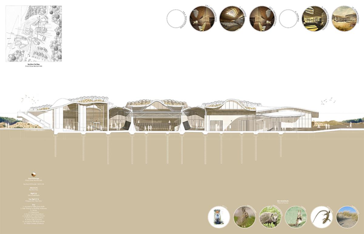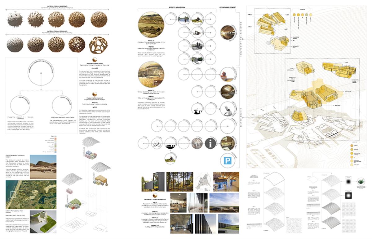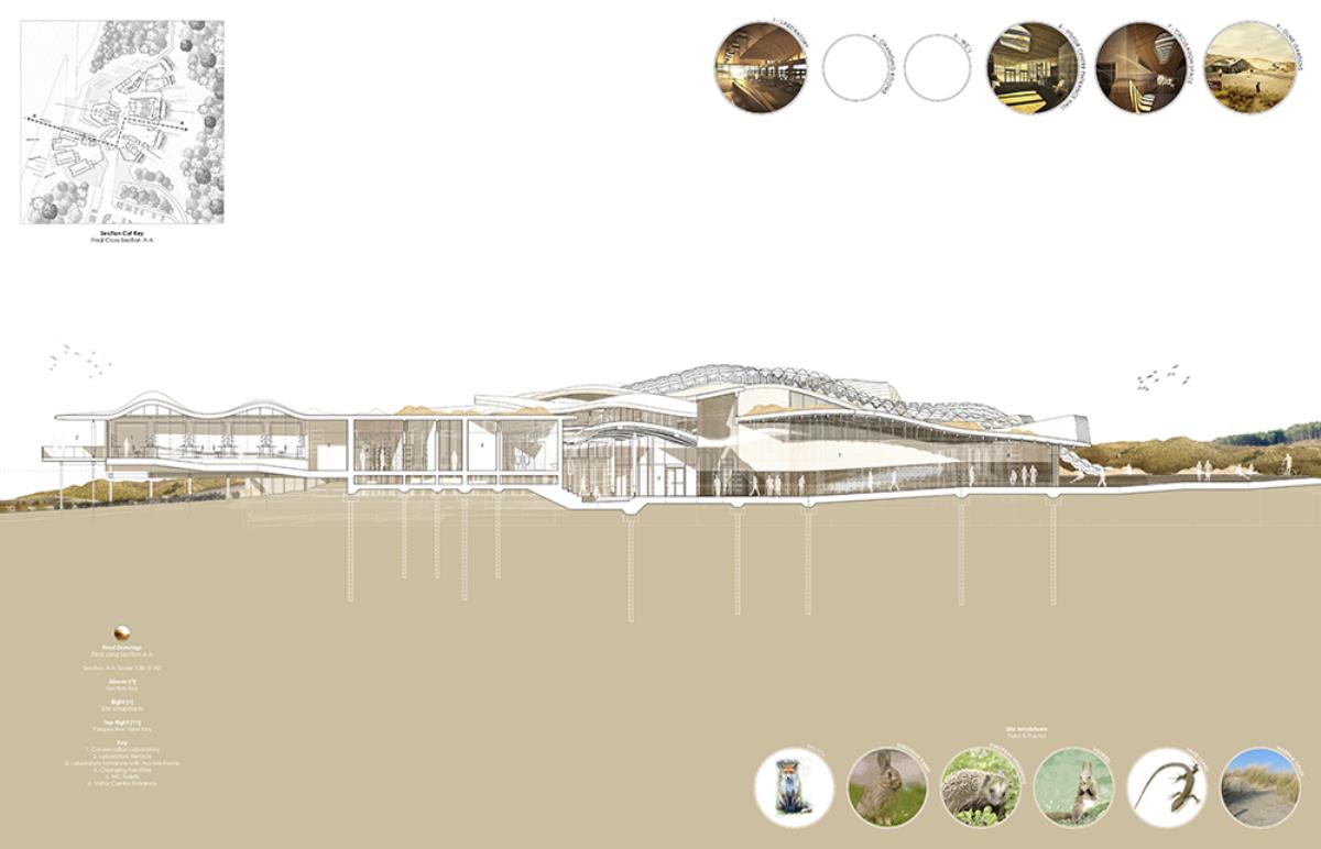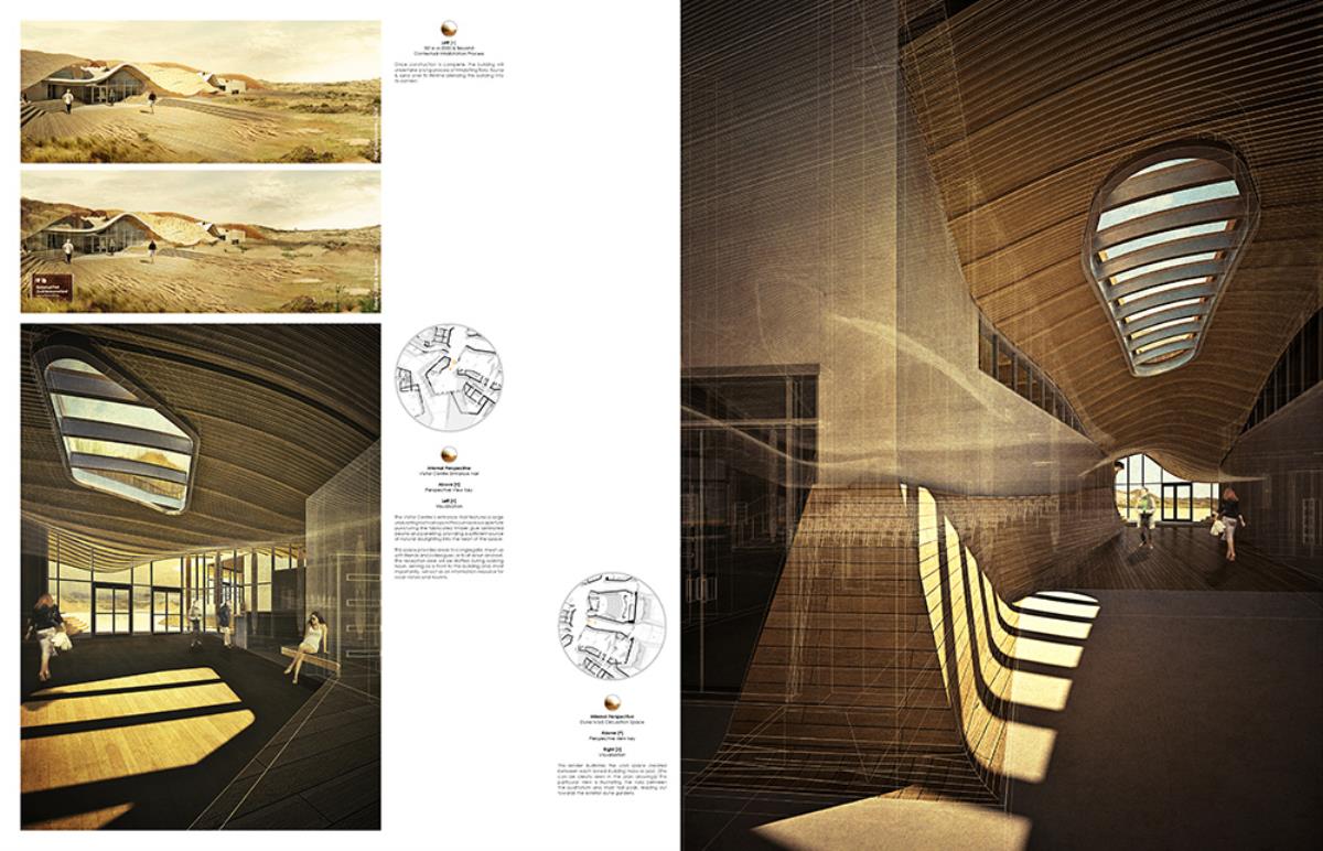 The thesis aims to investigate architectural themes such as ‘emerging’ and ‘dissolving’, through the poetic narrative of the context, and interventions such as an inhabitable skin which allows the building to merge into its surroundings over time. This provides a canvas in which the building can dynamically ‘emerge’ and ‘dissolve’ from its site throughout the different seasons, whilst providing additional areas of settlement for the great variety of flora & fauna. The proposal, a Visitor Centre and a Conservation Laboratory, provides enhanced facilities to the area, contributing to the conservation of the nature reserve and dunes, whilst serving the locals and tourists who visit this unique setting by improving the commercial and educational opportunities, through convention spaces, catering, retail, and information resources.