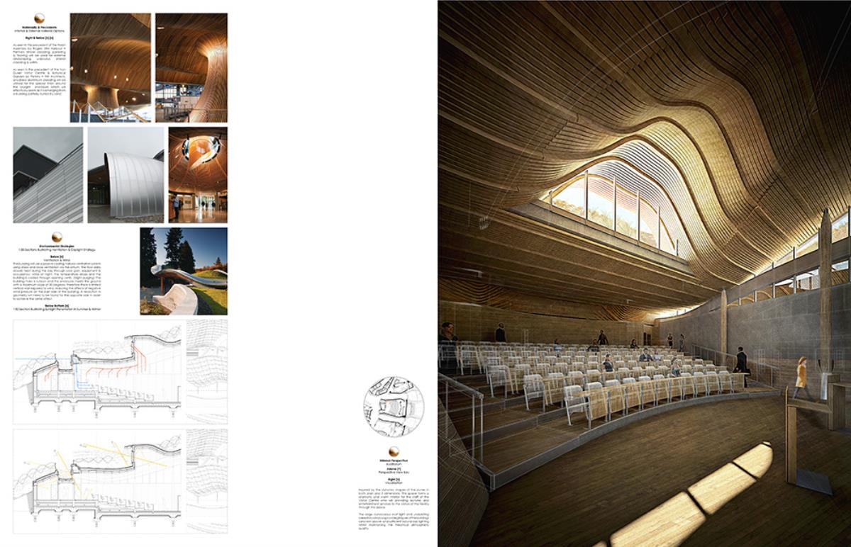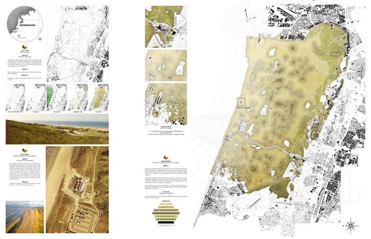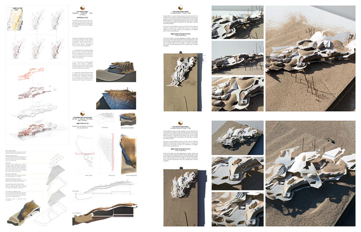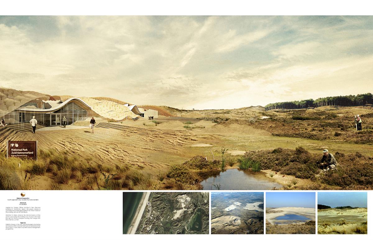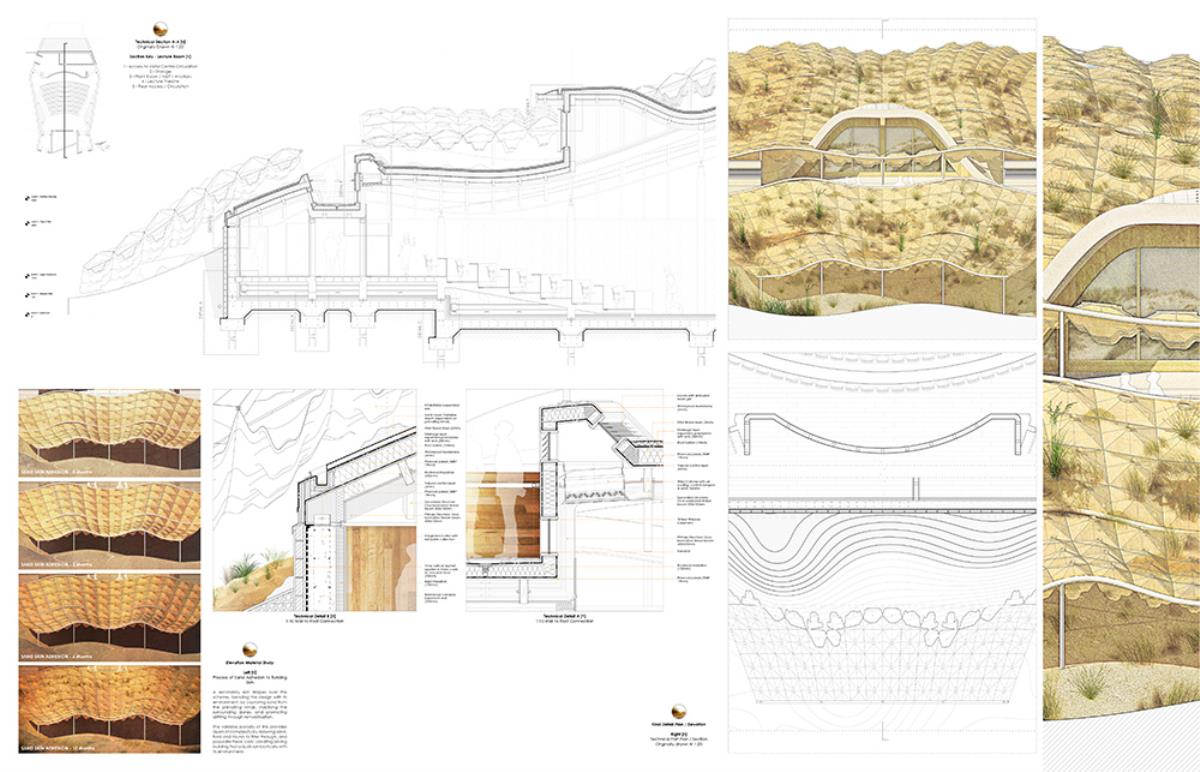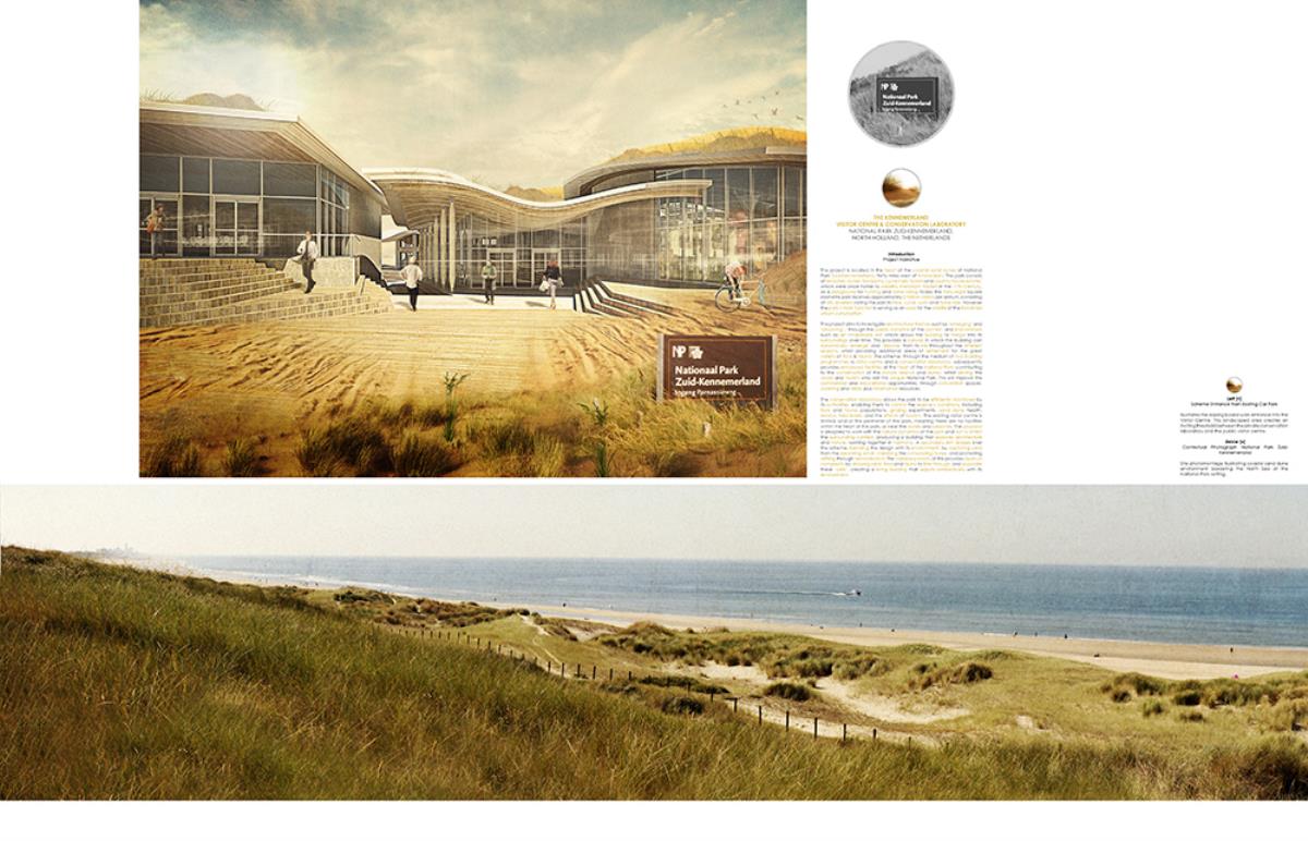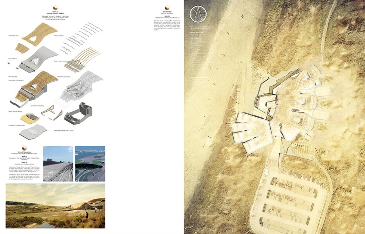 The thesis aims to investigate architectural themes such as ‘emerging’ and ‘dissolving’, through the poetic narrative of the context, and interventions such as an inhabitable skin which allows the building to merge into its surroundings over time. This provides a canvas in which the building can dynamically ‘emerge’ and ‘dissolve’ from its site throughout the different seasons, whilst providing additional areas of settlement for the great variety of flora & fauna. The proposal, a Visitor Centre and a Conservation Laboratory, provides enhanced facilities to the area, contributing to the conservation of the nature reserve and dunes, whilst serving the locals and tourists who visit this unique setting by improving the commercial and educational opportunities, through convention spaces, catering, retail, and information resources.