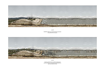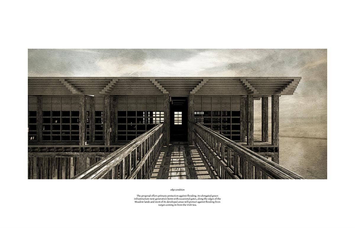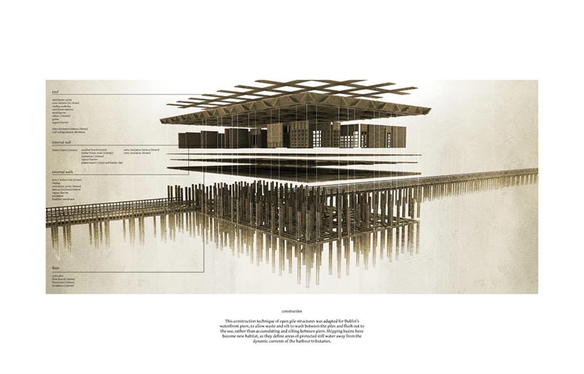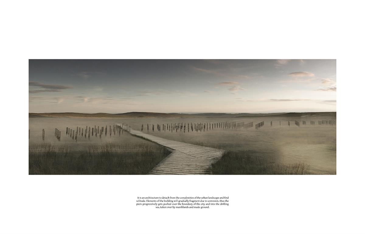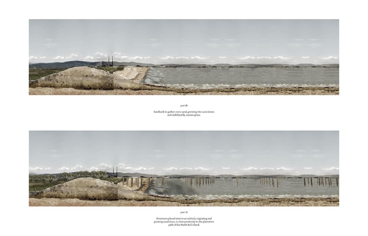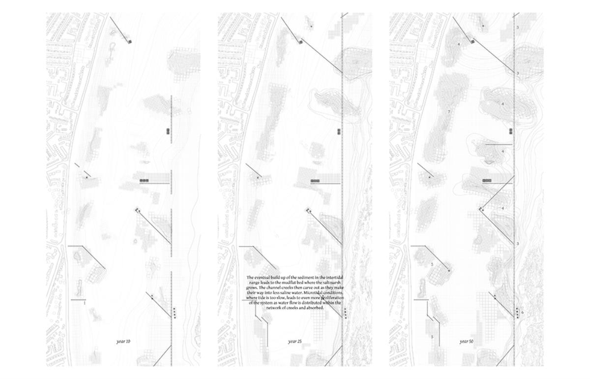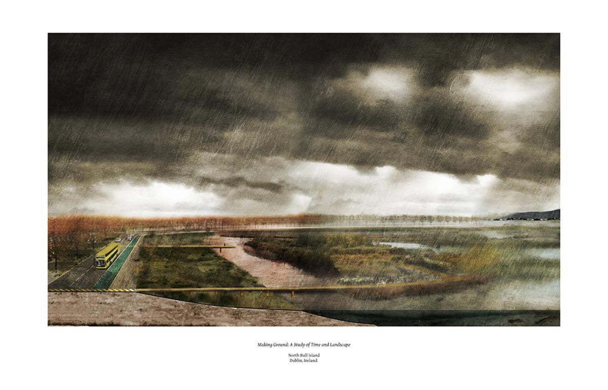 Making Ground: A study of time and landscape Part 2 Project 2014 Pow-Chween Wan Queen's University Belfast | UK “What Time is this Place?” a foretelling question asked by Kevin Lynch (1972), as he explored how communities manage environmental change. Architecture today is challenged by the need to both respect the past and confront the certainty of an uncertain future, as globalisation of societies, technologies, and economies transform the world along diverse and unforeseen pathways. The thesis aims to address the profound relationship of architecture and time. Based at North Bull Island which sits on the marginal landscape of Dublin Bay, it seeks to highlight the enigma of design in a truly dynamic landscape and the struggle to navigate timescales, natural processes, and the inevitable uncertainty of the physical world.The departure point of the thesis is triggered by thinkers who typically frame their understanding and response to landscape change as a dialogue with an evolving and emergent landscape. Alexander Pope (1731) wrote of the environmental conversation which informs landscape design, consulting an enduring genius loci—the water, topography, and vegetation. The thesis thus aims to also look into the fact that landscapes typically presuppose a relatively predictable temporal frame, which provides opportunity for careful scrutiny and leisurely exchanges with the genius loci, as the piers are scattered like abstracted forests across the shifting waters and sands of Bull Island in Dublin. ‘Making Ground’ in essence is a proposal to encourage sedimentation conditions along marshlands near North Bull Island, actively encouraging the creation, preservation and propagation of these ecologies to revert its increasing decline. The formation of North Bull Island is only a few hundred years old, essentially a drainage basin within Dublin Bay. The thesis seeks for strategies of adaptation to this evolving environment. The paradigm of order and control over nature is questioned in favour of strategies that respect, modify and engage natural processes at work. The architectural intervention acts as a combination of hard and soft engineering technique to increase accretion levels within the test site which is necessary to stabilise marsh area in risk. Tutor(s) Andrew Clancy Colm Moore