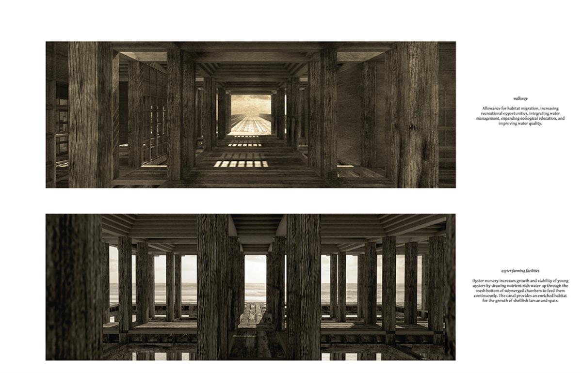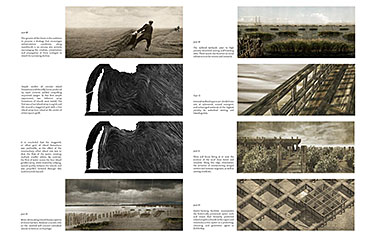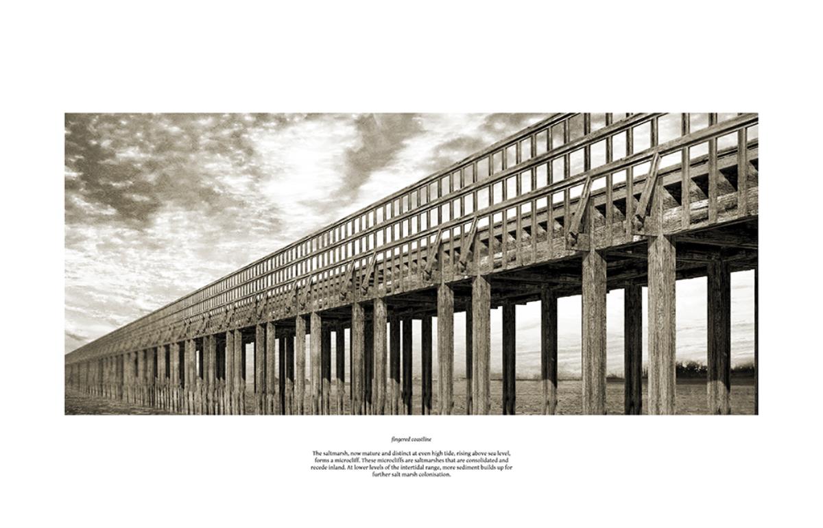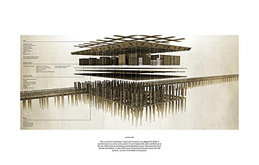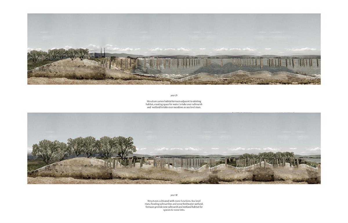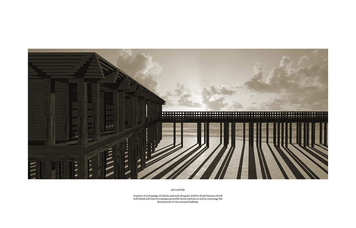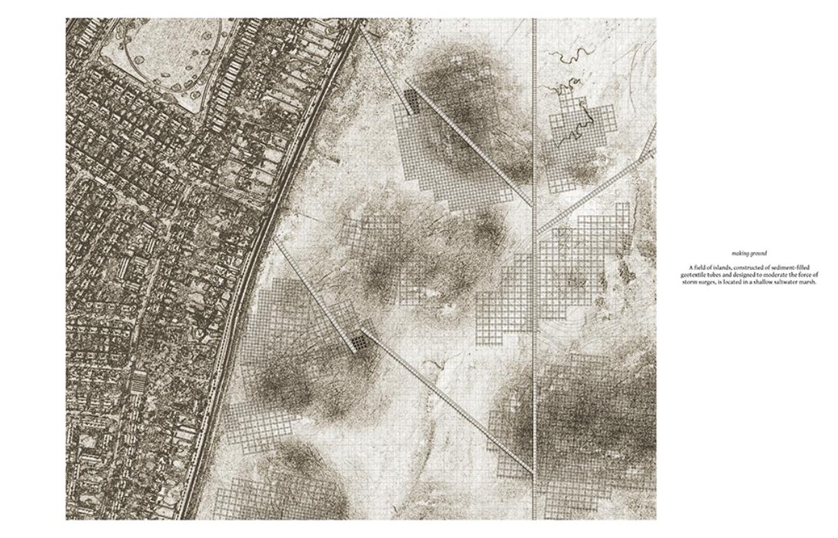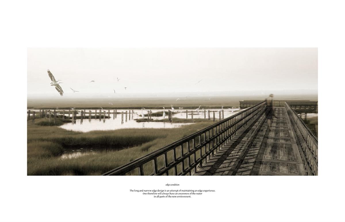 Making Ground: A study of time and landscape Part 2 Project 2014 Pow-Chween Wan Queen's University Belfast | UK “What Time is this Place?” a foretelling question asked by Kevin Lynch (1972), as he explored how communities manage environmental change. Architecture today is challenged by the need to both respect the past and confront the certainty of an uncertain future, as globalisation of societies, technologies, and economies transform the world along diverse and unforeseen pathways. The thesis aims to address the profound relationship of architecture and time. Based at North Bull Island which sits on the marginal landscape of Dublin Bay, it seeks to highlight the enigma of design in a truly dynamic landscape and the struggle to navigate timescales, natural processes, and the inevitable uncertainty of the physical world.The departure point of the thesis is triggered by thinkers who typically frame their understanding and response to landscape change as a dialogue with an evolving and emergent landscape. Alexander Pope (1731) wrote of the environmental conversation which informs landscape design, consulting an enduring genius loci—the water, topography, and vegetation. The thesis thus aims to also look into the fact that landscapes typically presuppose a relatively predictable temporal frame, which provides opportunity for careful scrutiny and leisurely exchanges with the genius loci, as the piers are scattered like abstracted forests across the shifting waters and sands of Bull Island in Dublin. ‘Making Ground’ in essence is a proposal to encourage sedimentation conditions along marshlands near North Bull Island, actively encouraging the creation, preservation and propagation of these ecologies to revert its increasing decline. The formation of North Bull Island is only a few hundred years old, essentially a drainage basin within Dublin Bay. The thesis seeks for strategies of adaptation to this evolving environment. The paradigm of order and control over nature is questioned in favour of strategies that respect, modify and engage natural processes at work. The architectural intervention acts as a combination of hard and soft engineering technique to increase accretion levels within the test site which is necessary to stabilise marsh area in risk. Tutor(s) Andrew Clancy Colm Moore