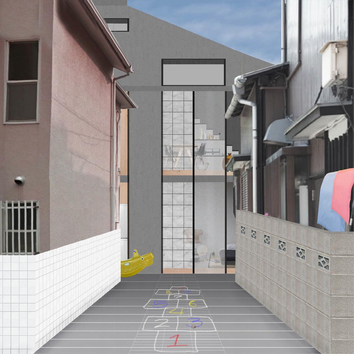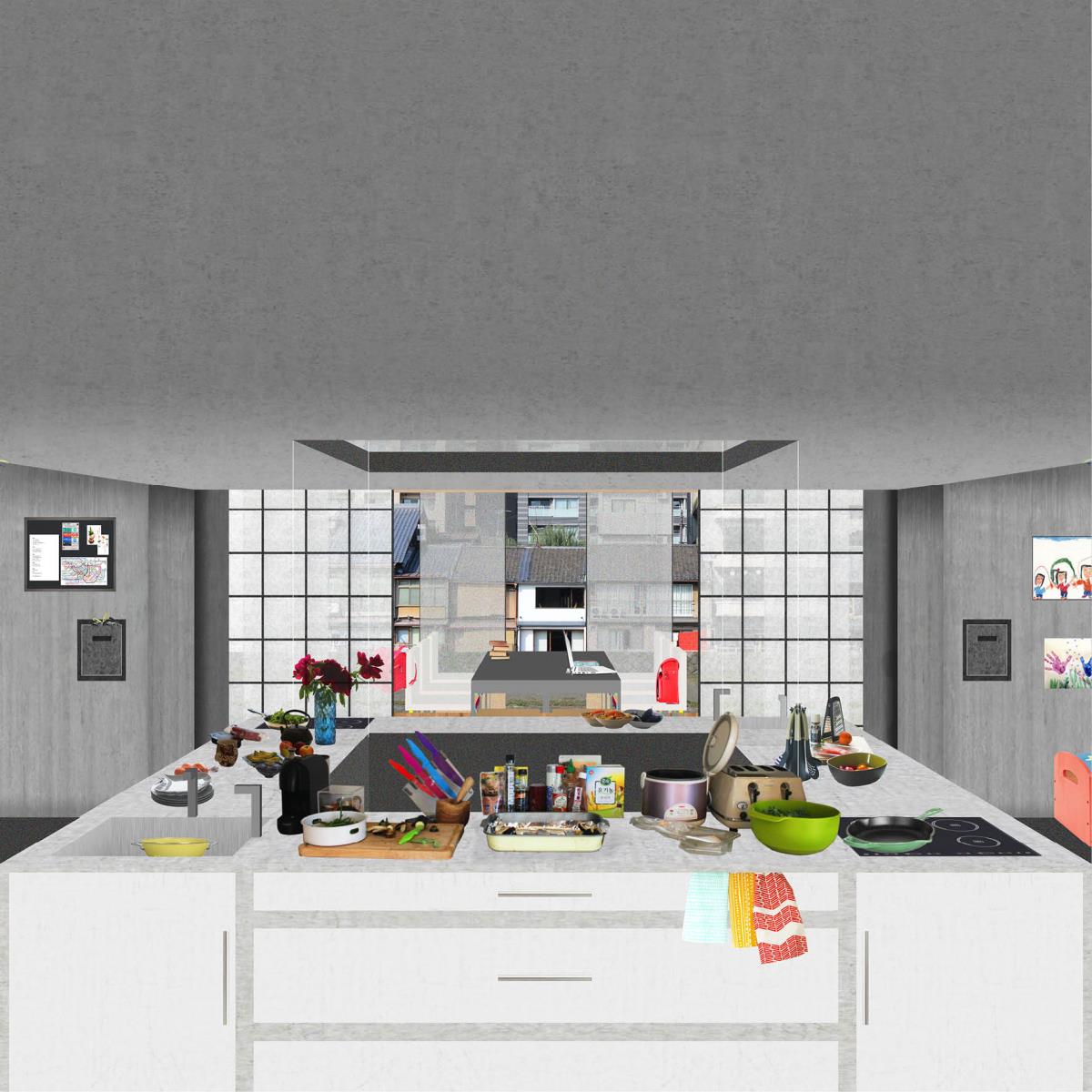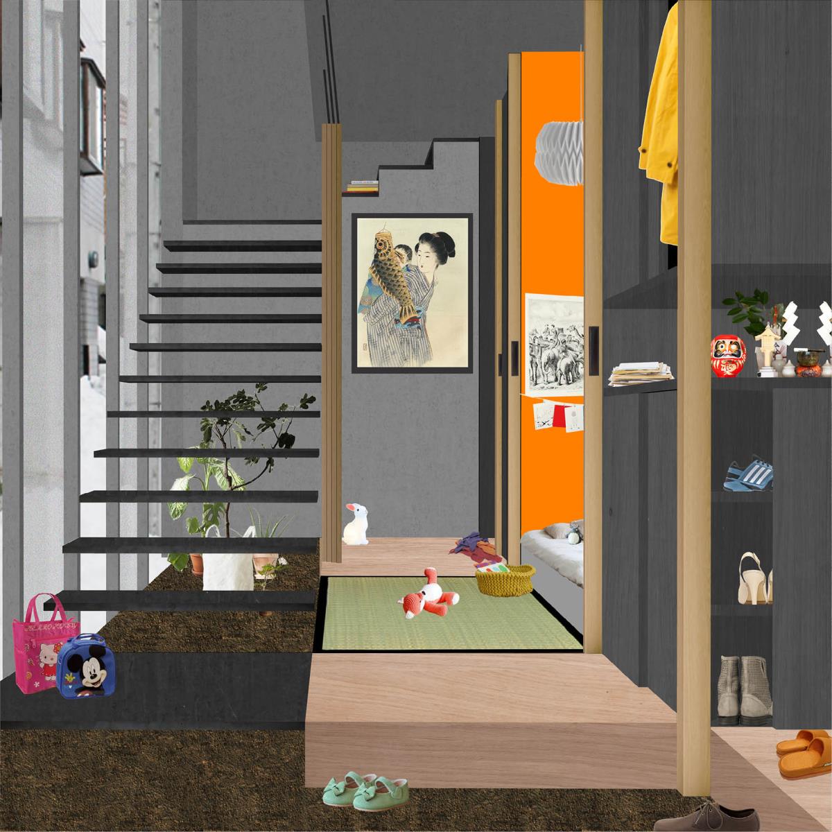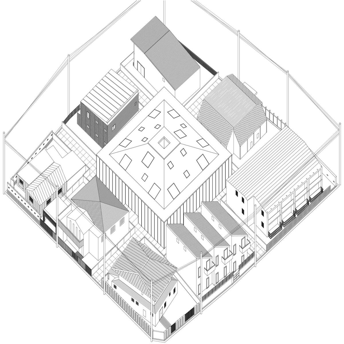 SOCKS: Collective Living for the Japanese Housewife Part 2 Project 2014 Eugénie Bliah Architectural Association London | UK ‘Cooking food, caring for children and cleaning house, tasks often thought of as “woman’s work” to be performed without pay in domestic environments, have always been a major part of the world’s necessary labour.’ – Linda Gordon, 1977In order to be productive in the work environment, the domestic must function as a space of reproduction and of rest: beds have to be made, clothes have to be washed and dinners have to be cooked. Indeed, these domestic tasks are typically perceived as the occupation of women. Christian Marazzi describes this intimacy between women and the home with his example of the ‘place for the socks’ in which the housewife naturally puts her husband’s socks ‘back where they belong’. These small gestures of affective labour – a labour of emotion and of care-giving – produce nothing yet enable the economic machine to function. In this sense, Japanese housewives are the backbone of Japan’s economy, but Tokyo’s most common domestic spaces – the single detached house and the condominium – have degraded their quality of life. These spaces not only isolate the housewife by detaching her from the public realm but also encourage autonomy among family members. More importantly, affective labour has become the ‘natural order of things’.There is an urgency to rethink ways of dwelling for the future. The ShareHouse, a collective living model for four or eight families, transforms the spatial and social design of housing. Private homes are rented out on a 10-year contract during a couple’s peak child-nurturing years. Spaces such as the kitchen, pantry, laundry area, bathhouse and children’s playroom are shared between the families. The ShareHouse acts as a machine for liberating domestic work by turning it into social work and promotes a non-gendered space with a sense of solidarity between women and men. Consequently, it releases the perceptions of affective labour by bringing it into the foreground. Tutor(s) Pier Vittorio Aureli Maria Shéhérazade Giudici