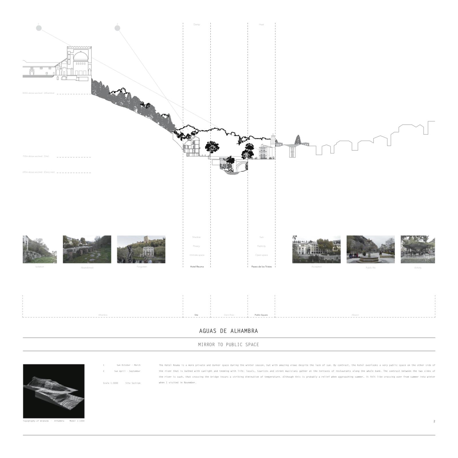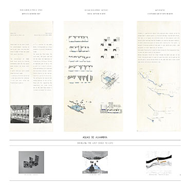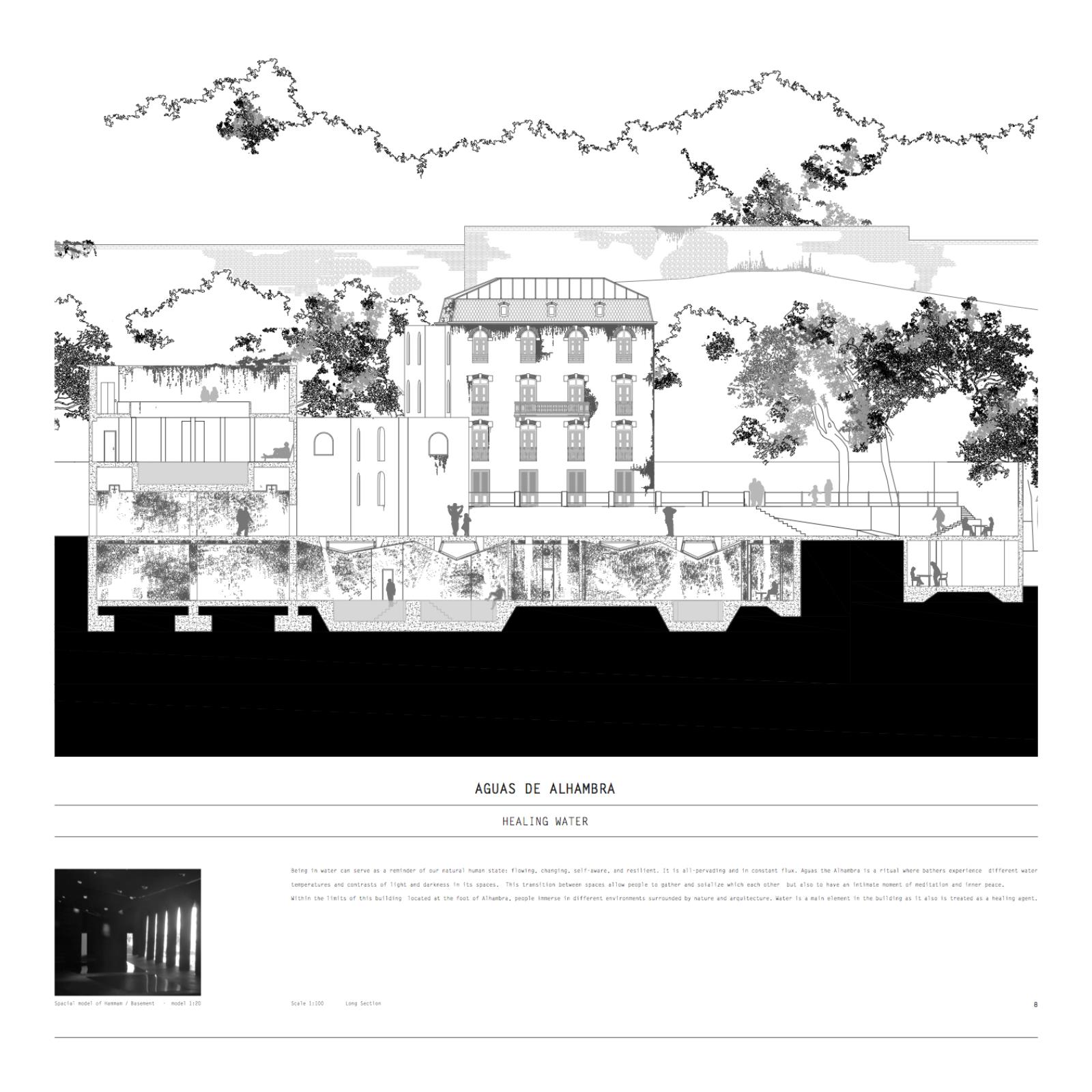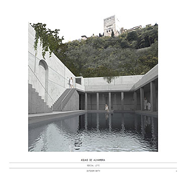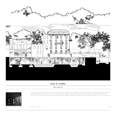 “Aguas de Alhambra” Part 1 Project 2016 Leonardo Castro Paredes University of East London London | UK The proposal, located in Granada, brings back to life an abandoned site that has been isolated for a century due to adverse climate conditions causing humidity and darkness. By taking advantage of these conditions instead of going against them, I propose to convert the existing building into public baths enhancing water, nature and historical architecture - an alternative to the other sunny 'side' of the river, devoted to tourism. Tutor(s) Isaac Cobo i Displas Mrs Claude Saint-Arroman