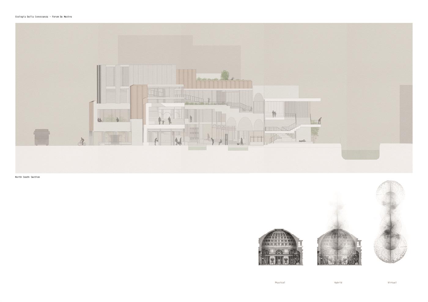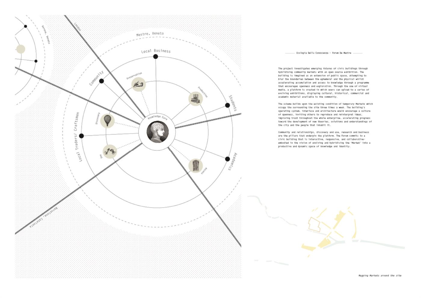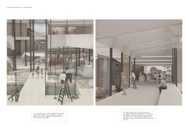 The project investigates emerging futures of civic buildings through hybridising community markets with an open source exhibition. The building is imagined as an extension of public space, attempting to blur the boundaries between the ephemeral and the physical– through the use of virtual media, a platform is created in which users can upload to a series of evolving exhibitions, displaying cultural, historical, commercial and academic material available to the community.