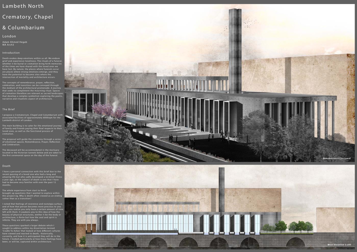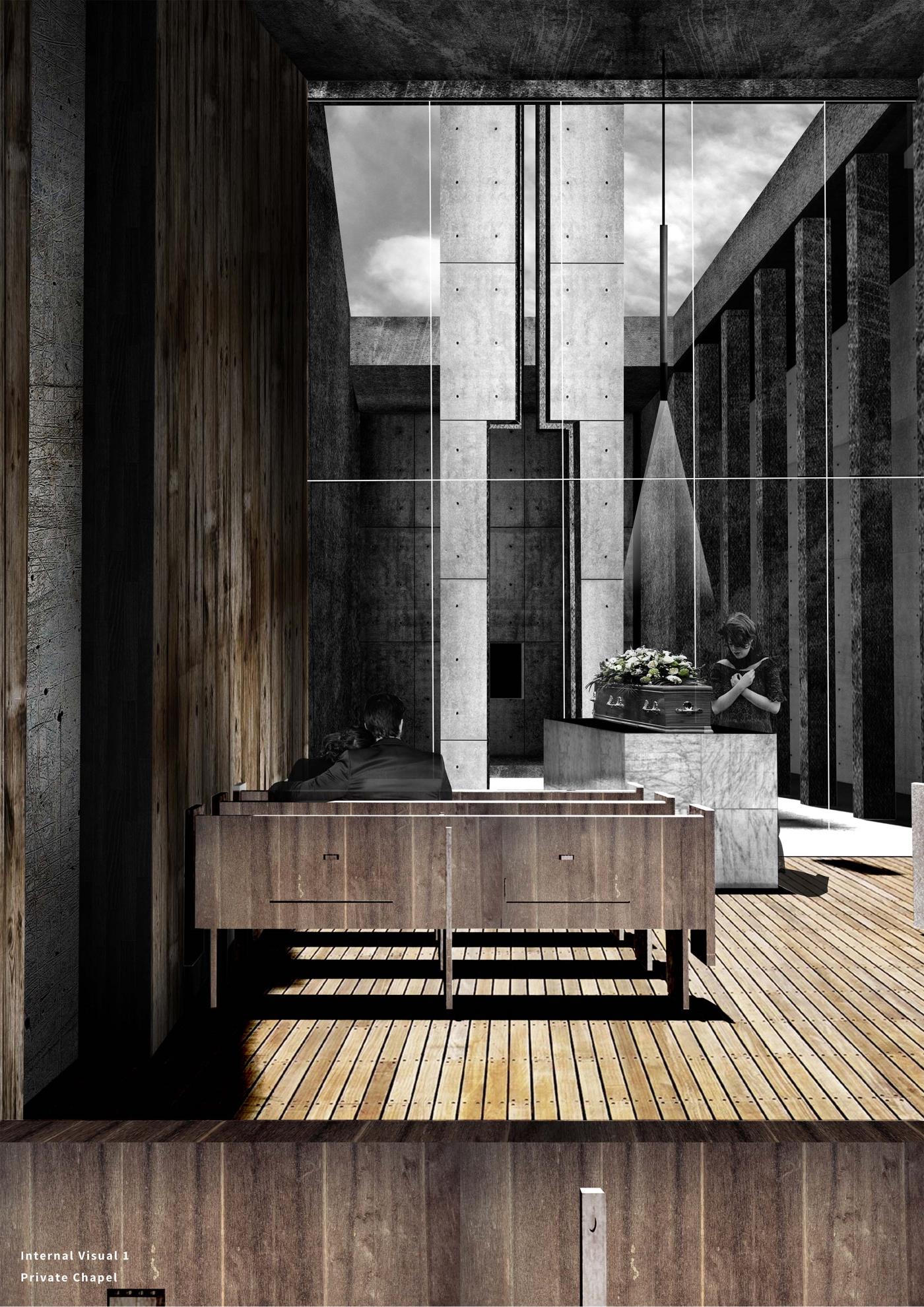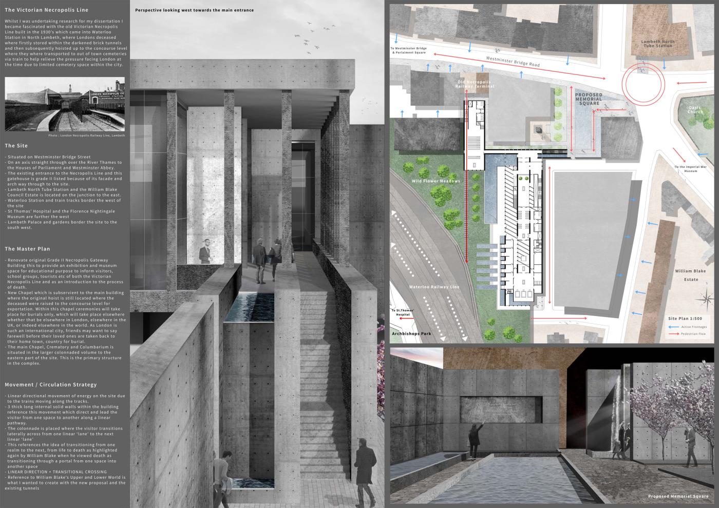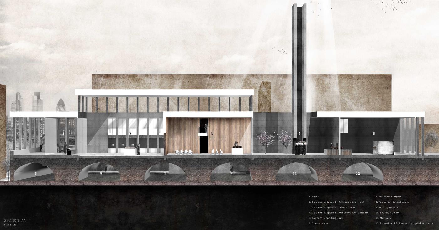 The proposal is a Crematorium, Chapel and Columbarium with associated facilities of approximately 6000sqm for the Lambeth district of London.The main building is to cater for the emotional journey of family and friends paying their final respects to their loved ones, as well as the functional process of cremation. The proposal will guide the ceremony through a series of emotional spaces; Remembrance, Prayer, Reflection and Celebration.