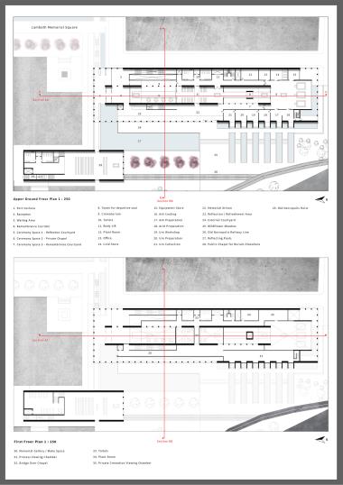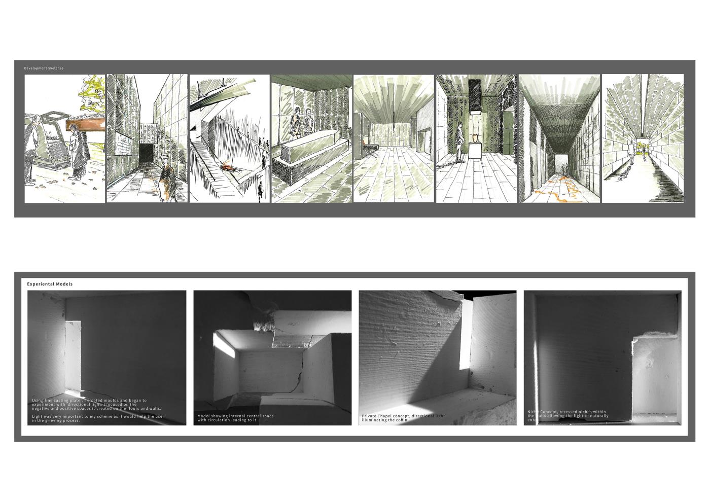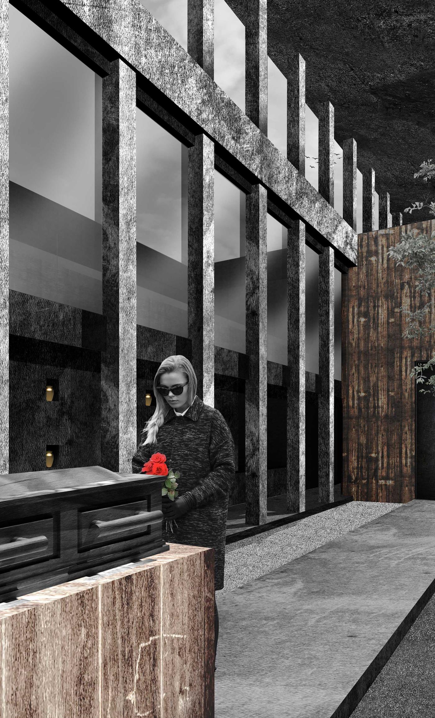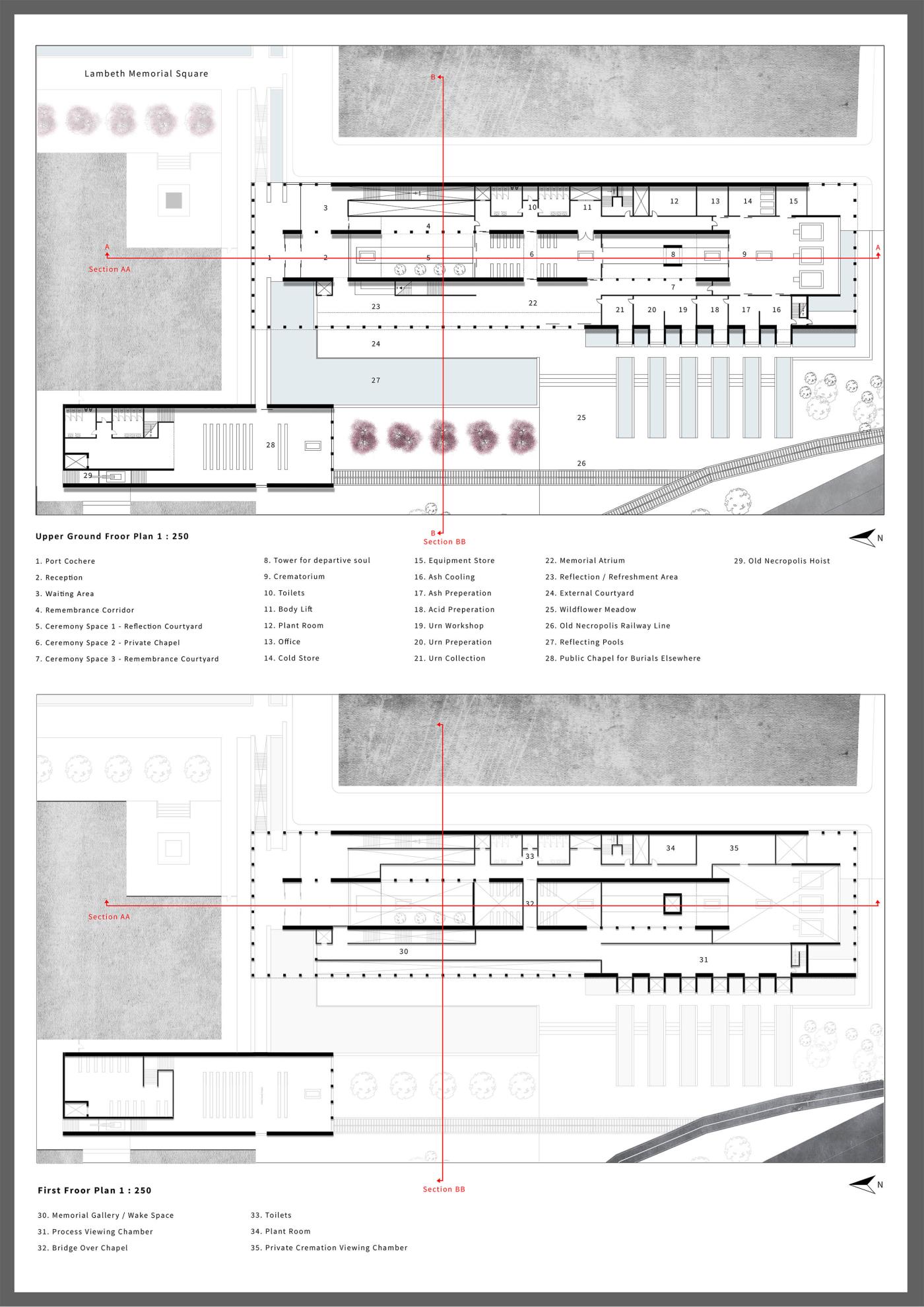 The proposal is a Crematorium, Chapel and Columbarium with associated facilities of approximately 6000sqm for the Lambeth district of London.The main building is to cater for the emotional journey of family and friends paying their final respects to their loved ones, as well as the functional process of cremation. The proposal will guide the ceremony through a series of emotional spaces; Remembrance, Prayer, Reflection and Celebration.