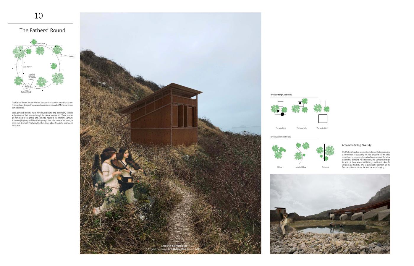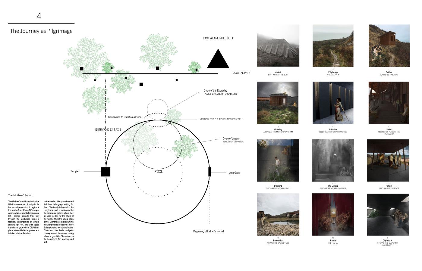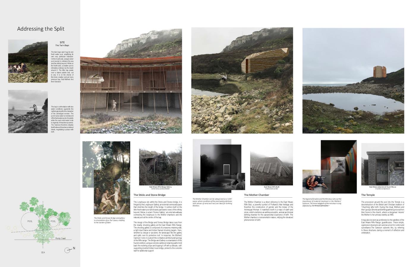 Mothers’ Sanctum Part 1 Project 2018 Sasha Mckinlay University of Bath | UK The Mothers’ Sanctum is an interrogation of contemporary birthing culture, and particularly its stubborn rejection of the bodily experience. This project reengages with the mythology, ritual and tradition circumscribing primal birth to amplify this extraordinary phenomenon. The resulting retreat is nestled into the elemental coast of Portland, primarily consisting of a communal longhouse and a necklace of anthropomorphic birthing chambers, which stand tribute to the unique journey of birth. Tutor(s) Jayne Barlow