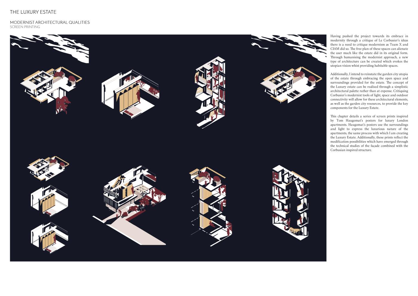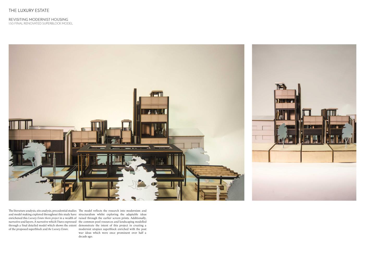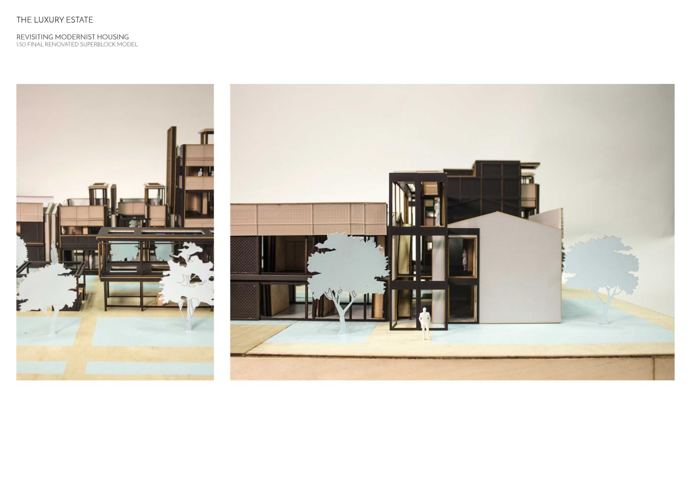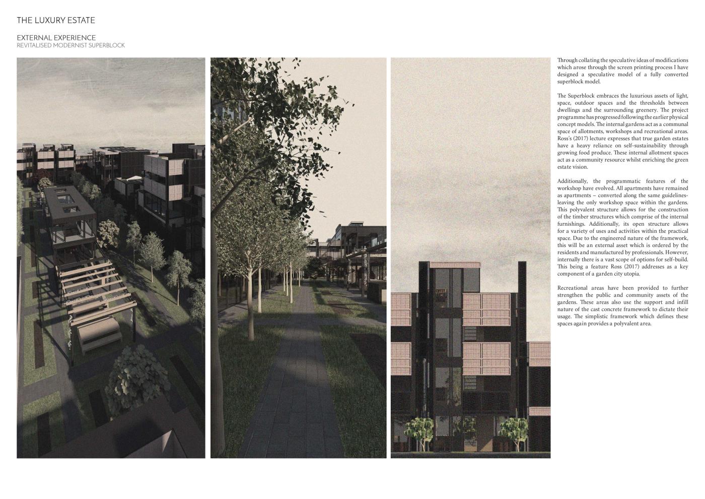 The Luxury Estate – Revisiting Modernist Housing, Chelmsley Wood Part 2 Project 2018 Ryan Gormley Birmingham City University | UK The Luxury Estate critiques the modernist principles which underpinned the initial 1960s Post War Council Estate development of Chelmsley Wood through reimaging the estate as a development of modernity enriched in the architectural aspirations of Post War Britain. Through a romantic analysis of the estate’s modernist housing and rich context, an alternative future for the estate’s declining housing was proposed which uses the existing site as a tool for regeneration. Tutor(s) Robert Annable Michael Dring