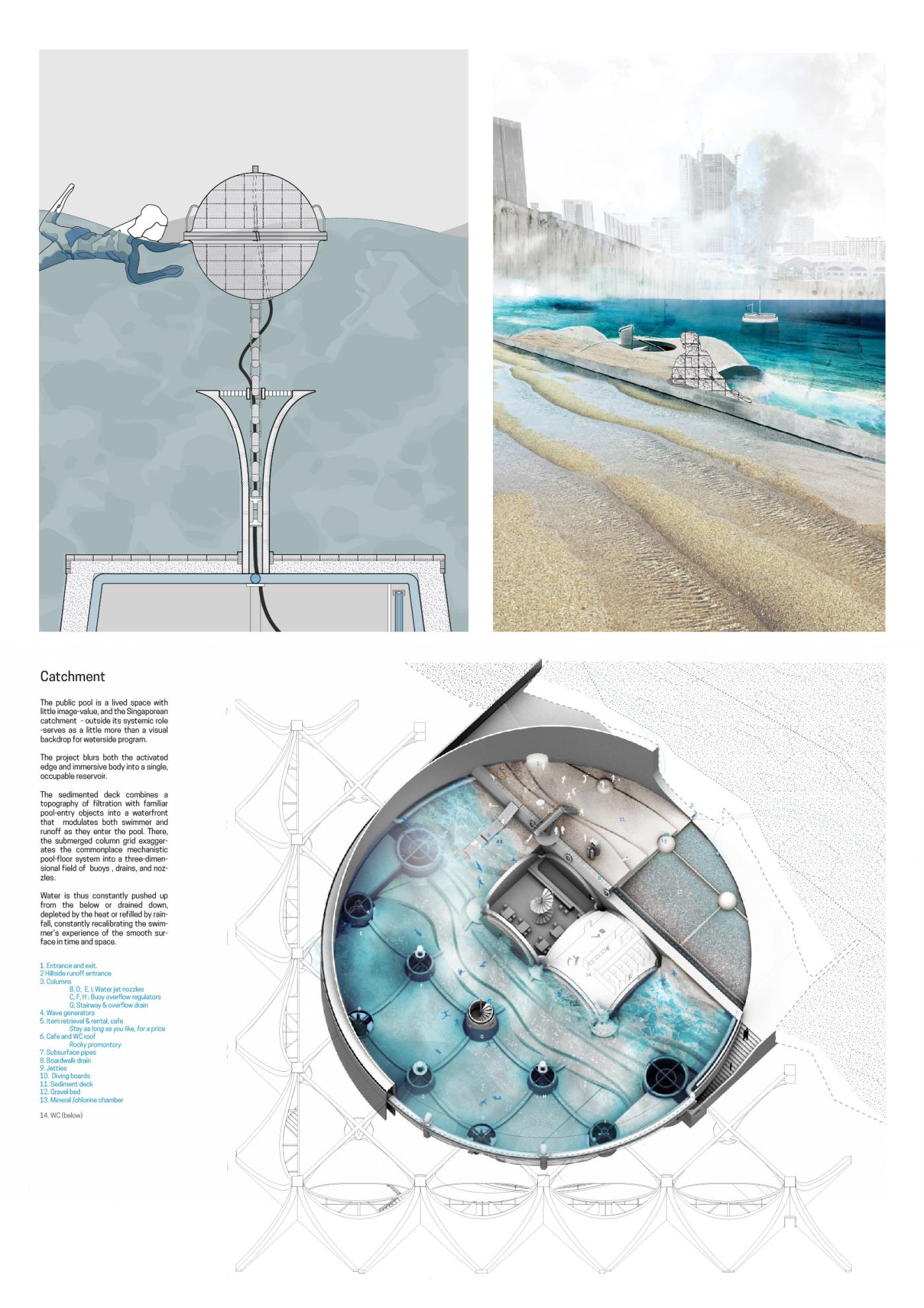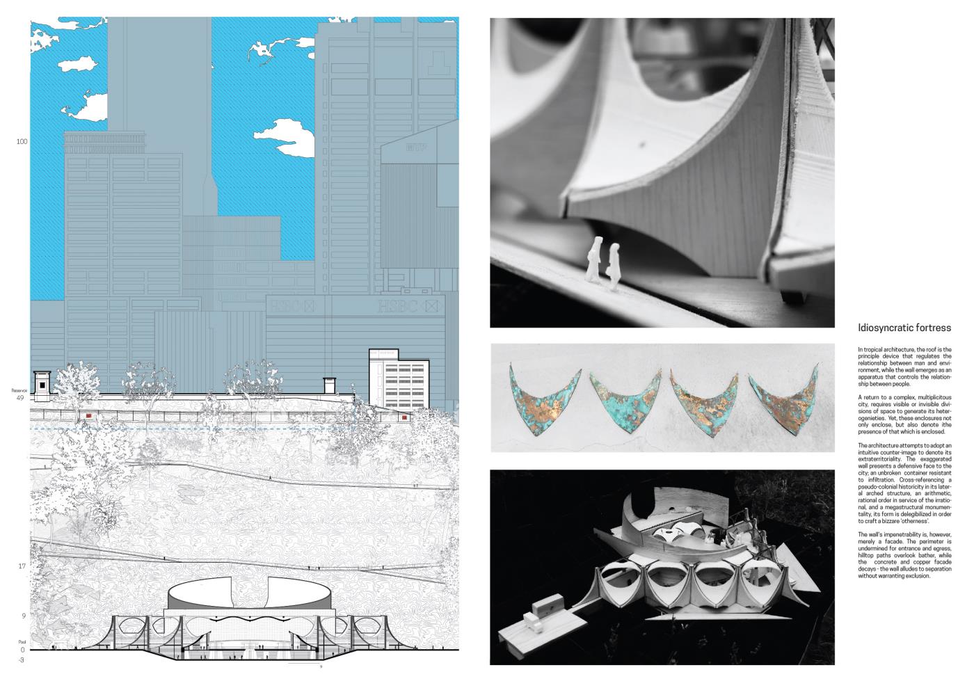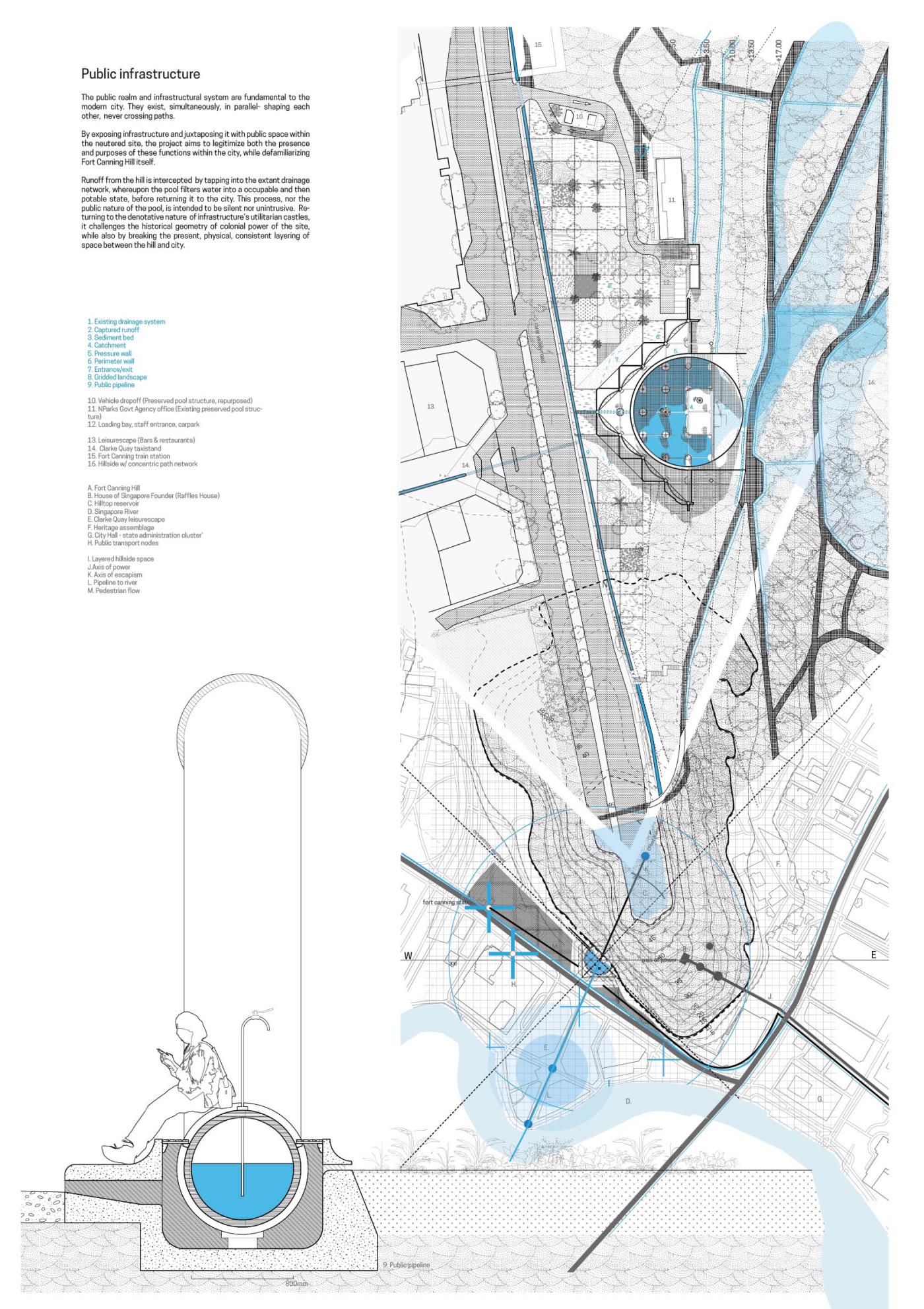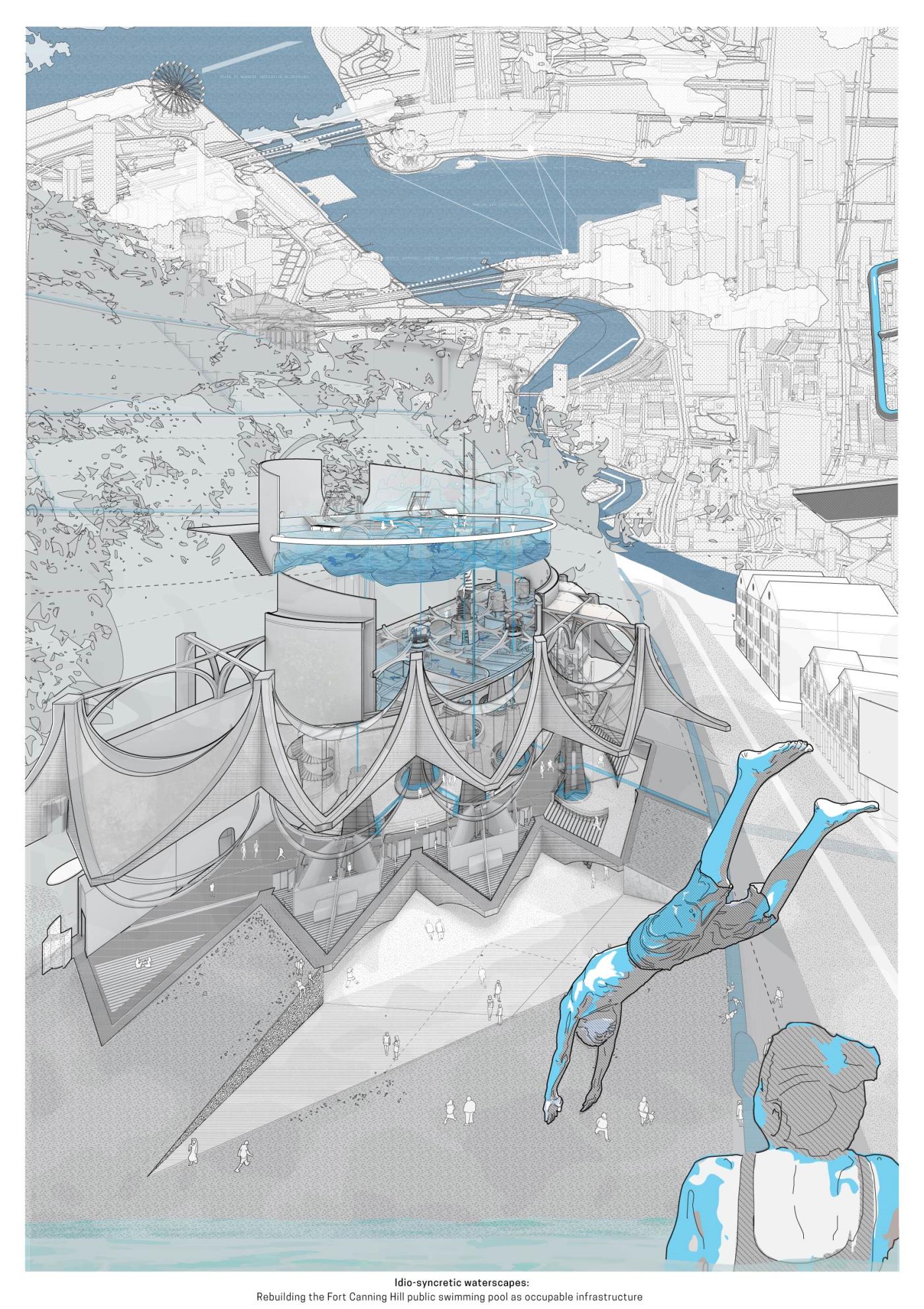 Idio-syncretic Waterscapes Part 1 Project 2019 Yong Chern Goi National University of Singapore | Singapore In the post-independence scramble for survival, an emergent Singapore has recast itself as a paragon of prudent policy.Its success has been a strange, recursive paradox- dependent on the continual manufacture of this image of success to a global audience of state, corporate, and individual actors. A city-state with no hinterland, it is entirely dependent on its own depiction to survive. The form of the physical city is thus irrevocably overwritten in the quest to identify and market an idealised self-representation.Fort Canning Hill, like the waterfront once overlooked, has thus fallen victim to hyperlegibility. Once a heterogeneous site of complex and contradiction, its rich cultural, political, and architectural topography has been flattened into an inoffensive, sterile projection of heritage.This project posits the reopening of the old swimming pool at Fort Canning in the form of occupable infrastructure, to reclaim for the public domain a refuge - a part of the richer space of a messier past.This symbolic, idiomatic and utilitarian superimposition hopes, in integrating with the wider systems of the city, to disrupt the established, unquestioned methods that govern urban order. Tutor(s) Prof. John Chye Fung