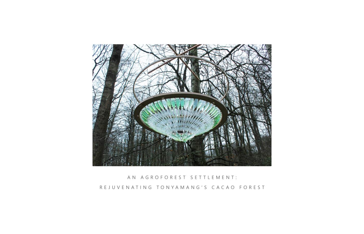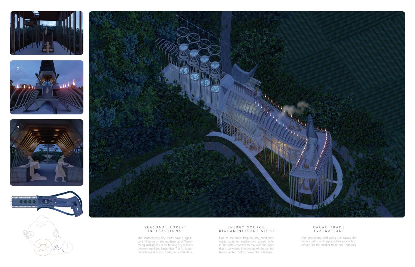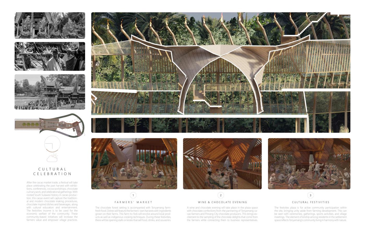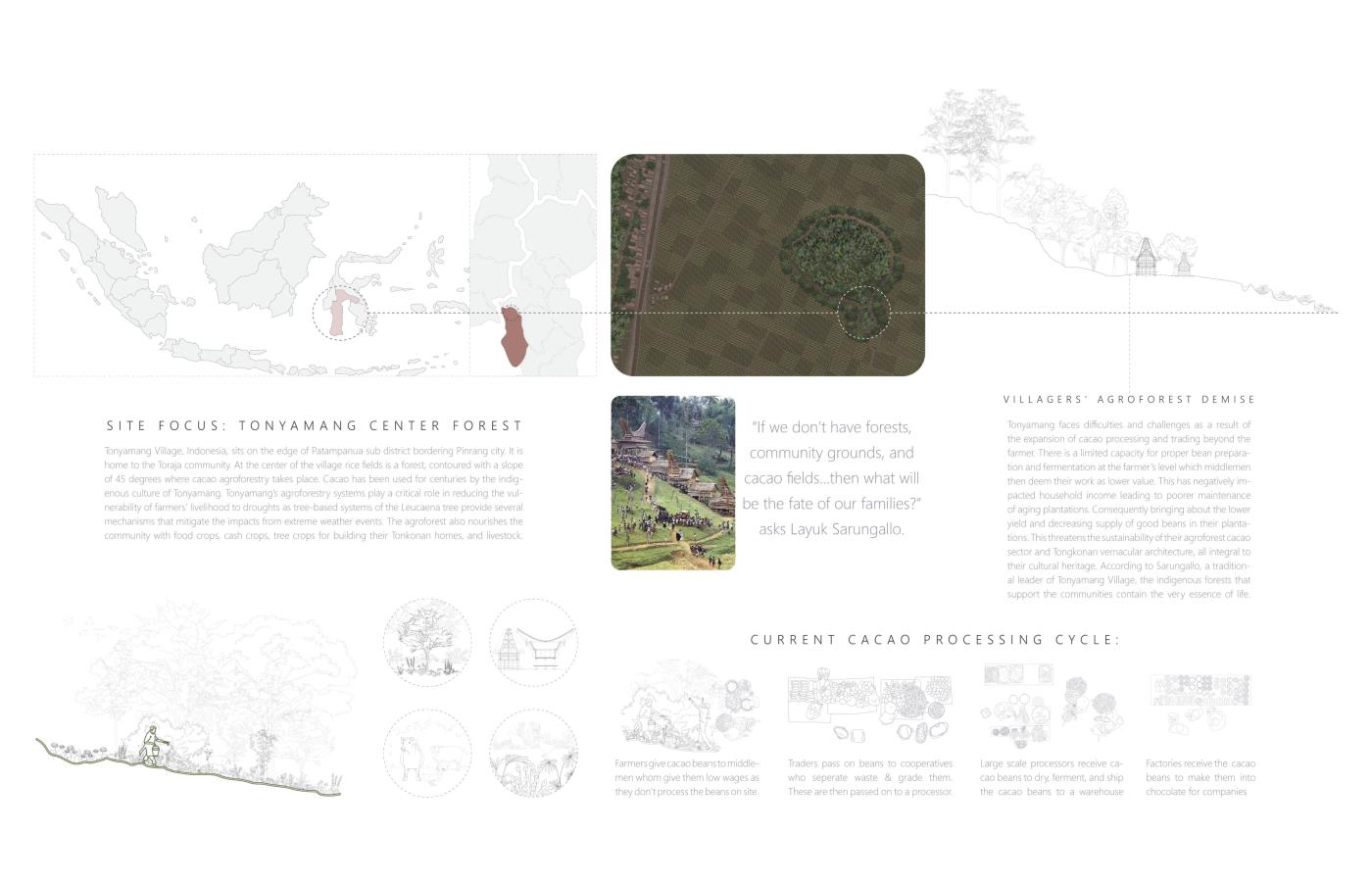 This project is an examination of the opportunity to restore the agroforest values and traditions of the Toraja people in Tonyamang, Indonesia, diminished by the detrimental cycle of corporate exportation. The settlement rejuvenates the community and its agroforestry by providing the facilities for local farmers to process cacao, sell their products on site without needing exportation middlemen, and celebrating the process of harvesting/irrigation as a spectacle to be admired. The combination of both spectacles link to a market place, eatery, education centre, and community meeting zones where the cacao is sold and organized for continuing its sustainable production. The settlement gathers farmers, traders, educators, tourists, and community people to participate in the planning of cacao growth and trade, as well as the evaluation of cacao in festivals and chocolate industry events. Such a forest settlement honours Tonyamang farmers' tremendous contribution to South Sulawesi and expands its agroforestry practices.