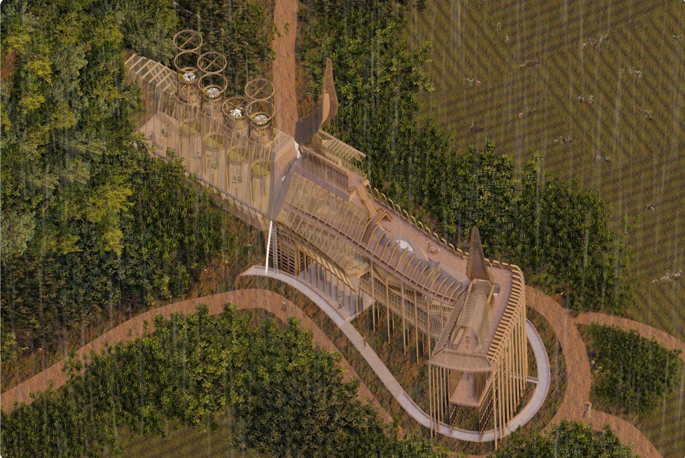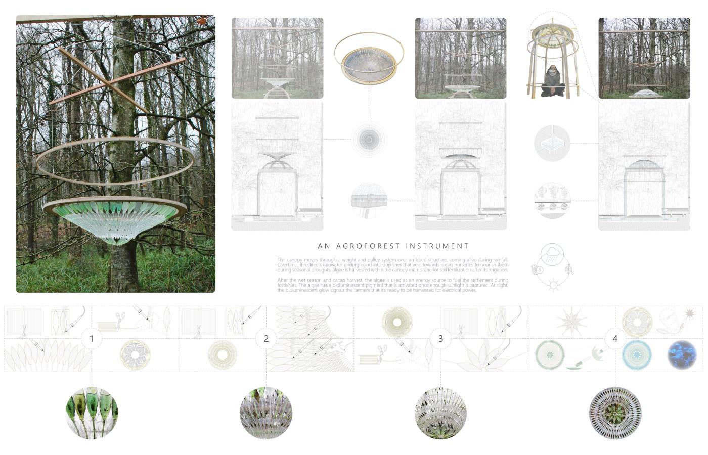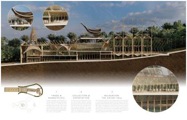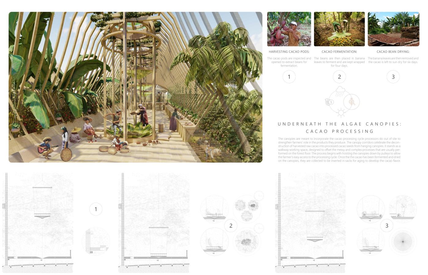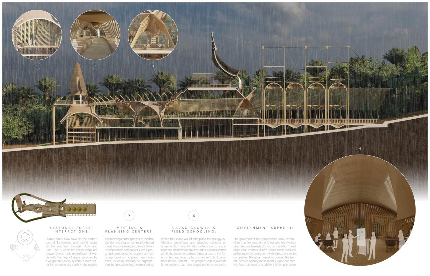 This project is an examination of the opportunity to restore the agroforest values and traditions of the Toraja people in Tonyamang, Indonesia, diminished by the detrimental cycle of corporate exportation. The settlement rejuvenates the community and its agroforestry by providing the facilities for local farmers to process cacao, sell their products on site without needing exportation middlemen, and celebrating the process of harvesting/irrigation as a spectacle to be admired. The combination of both spectacles link to a market place, eatery, education centre, and community meeting zones where the cacao is sold and organized for continuing its sustainable production. The settlement gathers farmers, traders, educators, tourists, and community people to participate in the planning of cacao growth and trade, as well as the evaluation of cacao in festivals and chocolate industry events. Such a forest settlement honours Tonyamang farmers' tremendous contribution to South Sulawesi and expands its agroforestry practices.