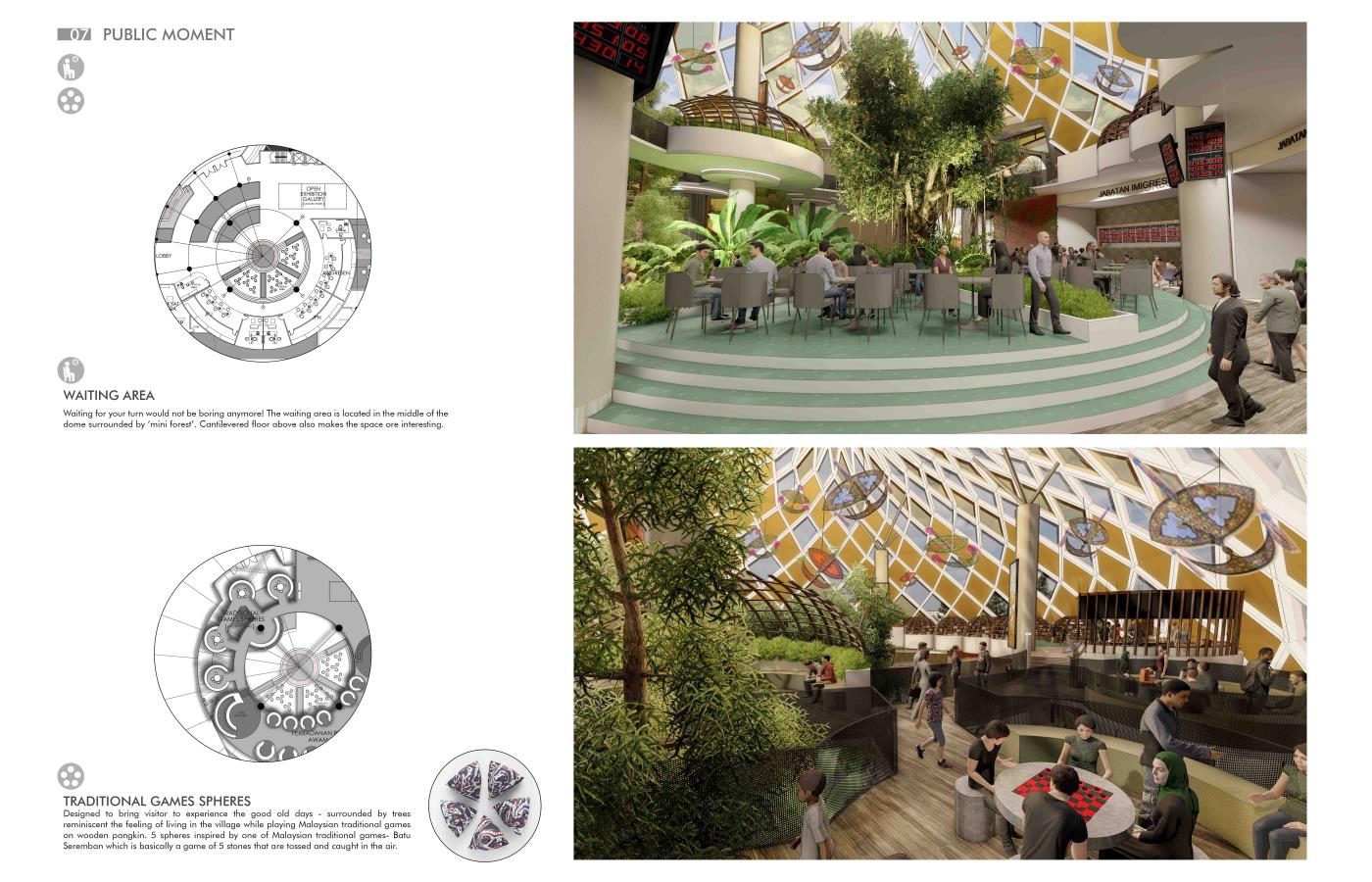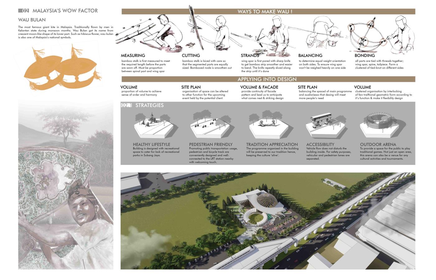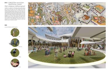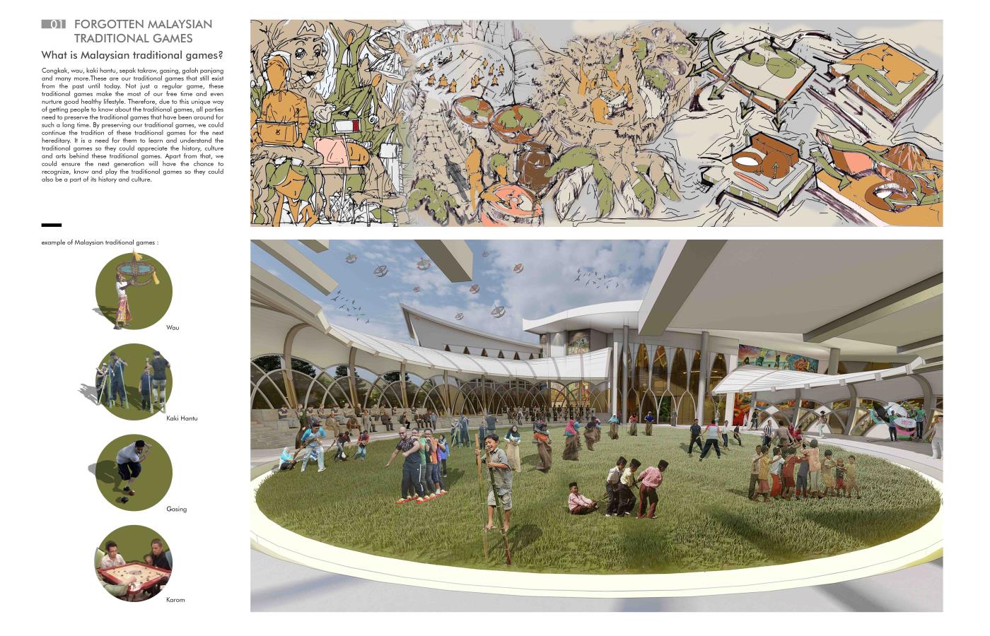 Kenyalang is an urban transformation centre that elevates the forgotten traditional games of Malaysia. Strategically located in an urban site, Kenyalang incorporates intangible values through public activities, spaces and elements of preserving the traditional games. It is conceptually generated from the making of Wau Bulan - the most famous moon-kite that is traditionally flown in the state of Kelantan. Spaces and programmes are provided in workshops for Wau Bulan making whilst outdoor arenas are designed for playing wau and other traditional games. Overall structure, form and façade are also wau inspired.