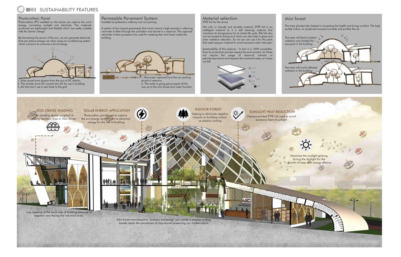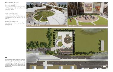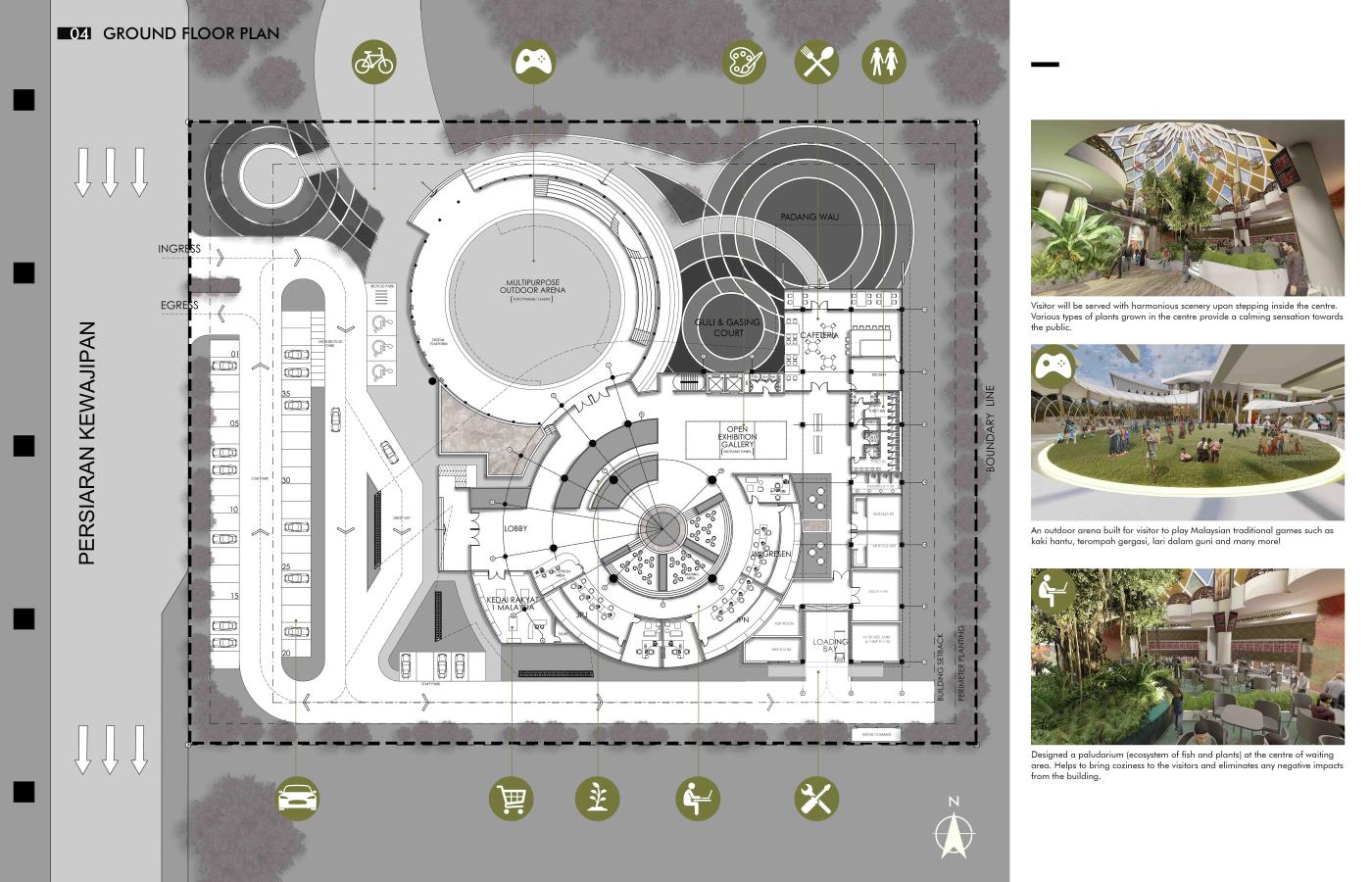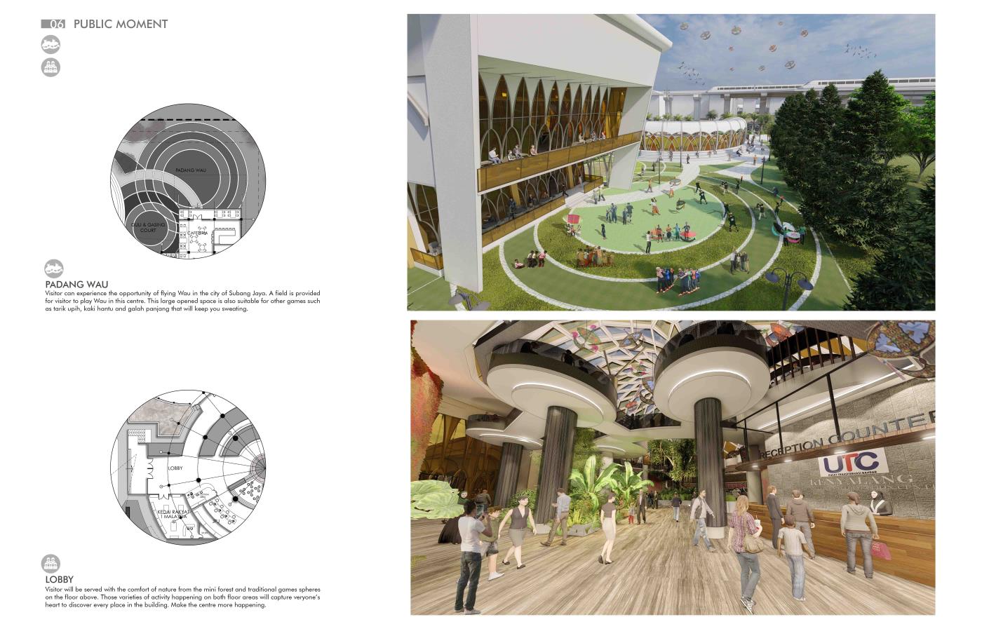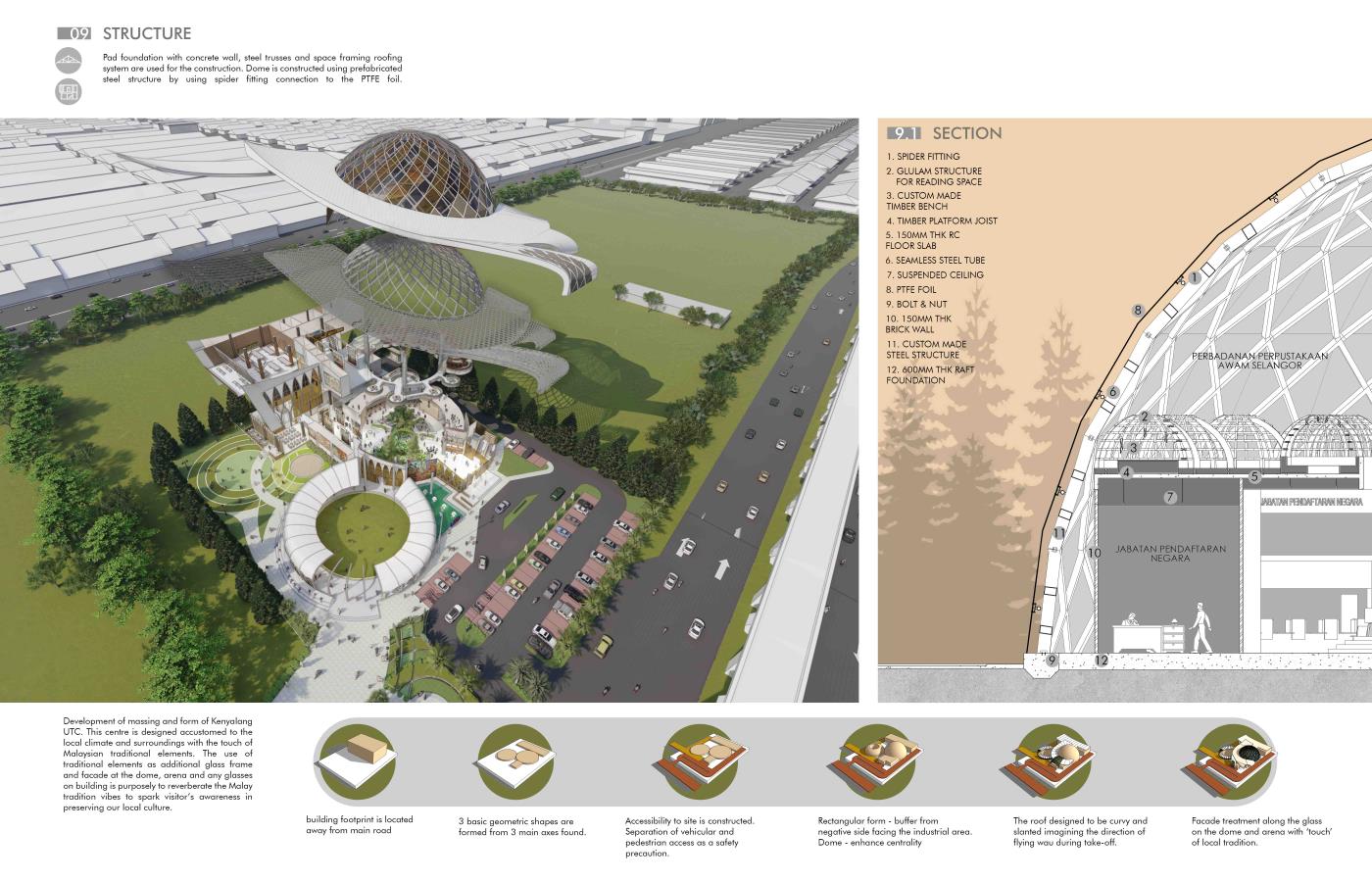 Kenyalang is an urban transformation centre that elevates the forgotten traditional games of Malaysia. Strategically located in an urban site, Kenyalang incorporates intangible values through public activities, spaces and elements of preserving the traditional games. It is conceptually generated from the making of Wau Bulan - the most famous moon-kite that is traditionally flown in the state of Kelantan. Spaces and programmes are provided in workshops for Wau Bulan making whilst outdoor arenas are designed for playing wau and other traditional games. Overall structure, form and façade are also wau inspired.