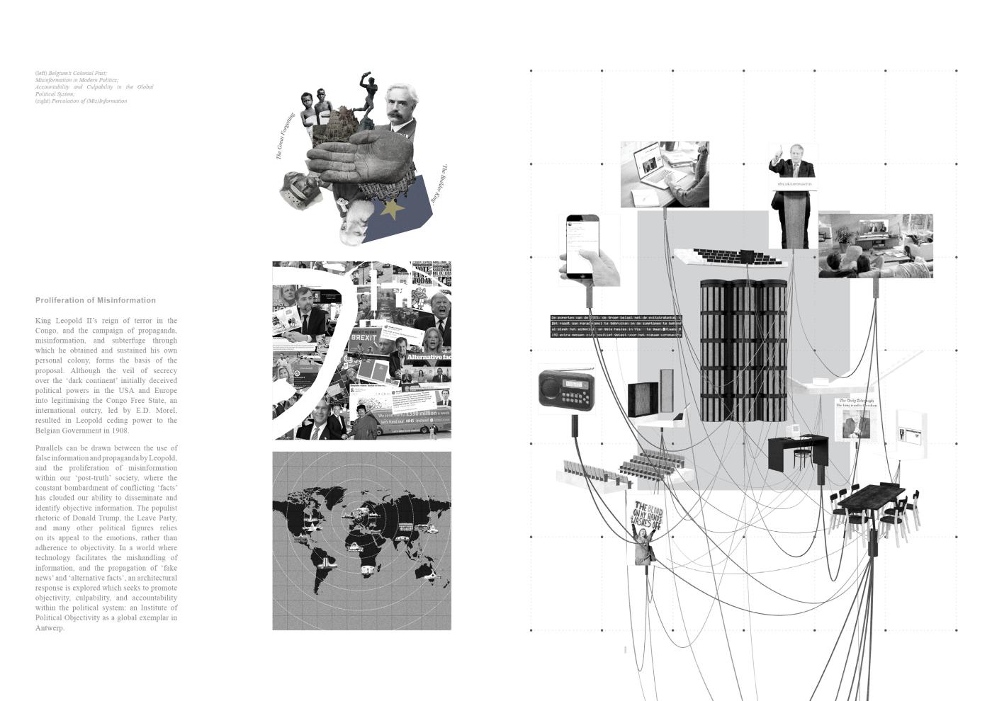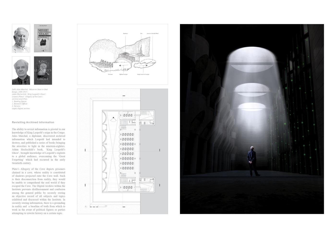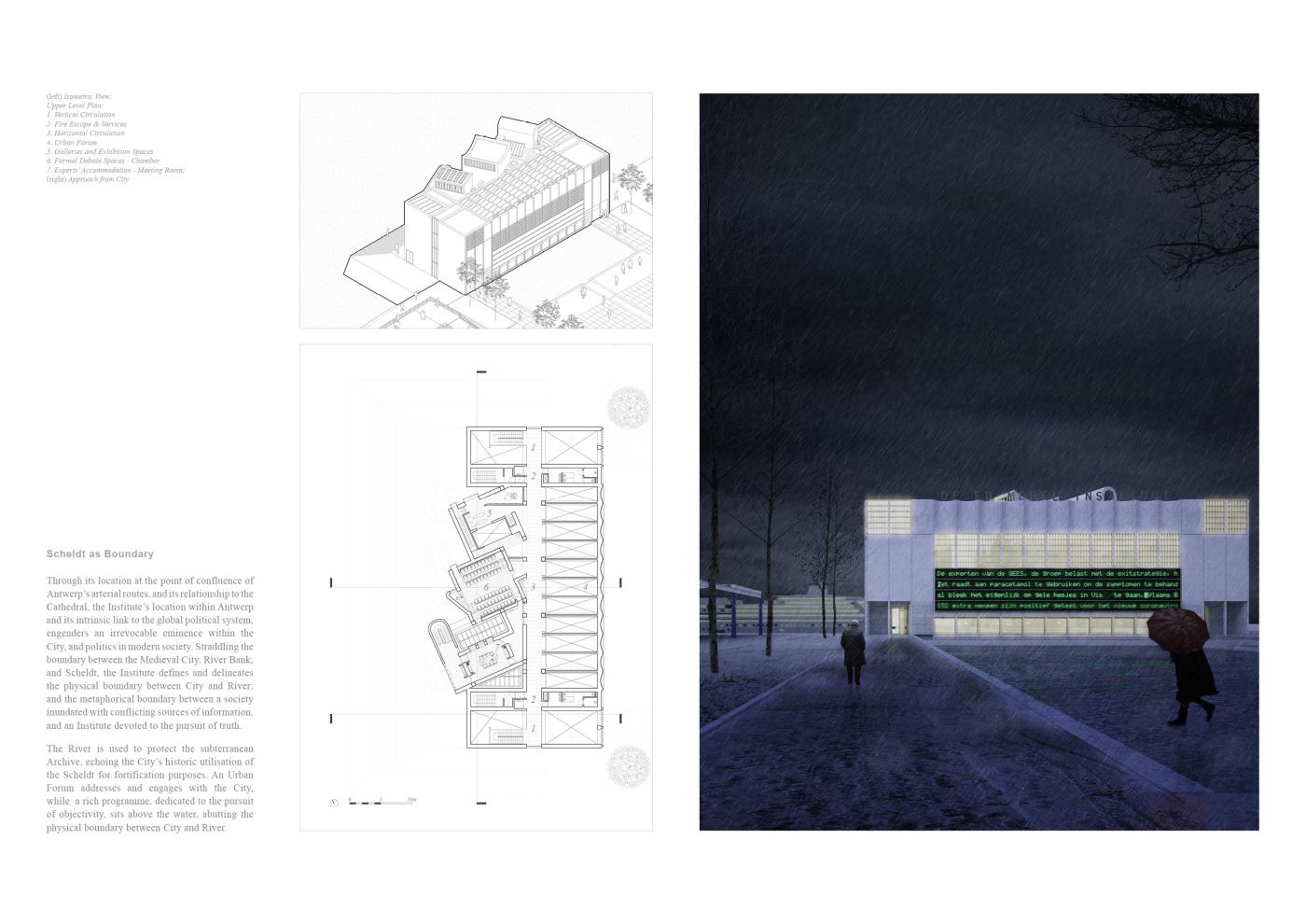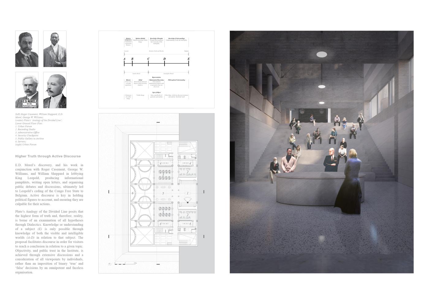 An Absolute Truth? Part 2 Project 2020 Matt McCluskey Mackintosh School of Architecture | UK In a near and not implausible future where society’s descent into a maelstrom of misinformation has obliterated the boundary between fact and fiction, an Institute of Political Objectivity is proposed as a global exemplar in Antwerp. The international outcry against King Leopold II’s abhorrent reign over the Congo Free State informs the proposal’s objectives: the holding of political parties and figures to account; and the promotion of objectivity within the global political system through dialectic teaching, active discourse, and procedural transparency.Intrinsically linked volumes comprised of Accommodation for Visiting Experts, Galleries and Exhibition Spaces, and Debate Spaces, facilitate discourse and the pursuit of objective truth through the examination of all hypotheses, as asserted in Plato’s Analogy of the Divided Line. A subterranean, digital archive holds a record of all events within the building, in order to safeguard objective information and hold the Institute itself to account. Tutor(s) Neil Simpson