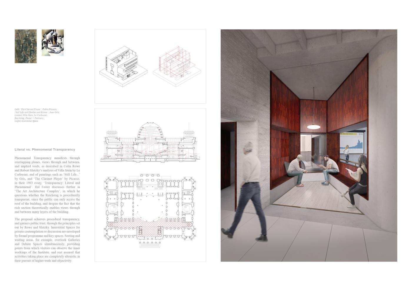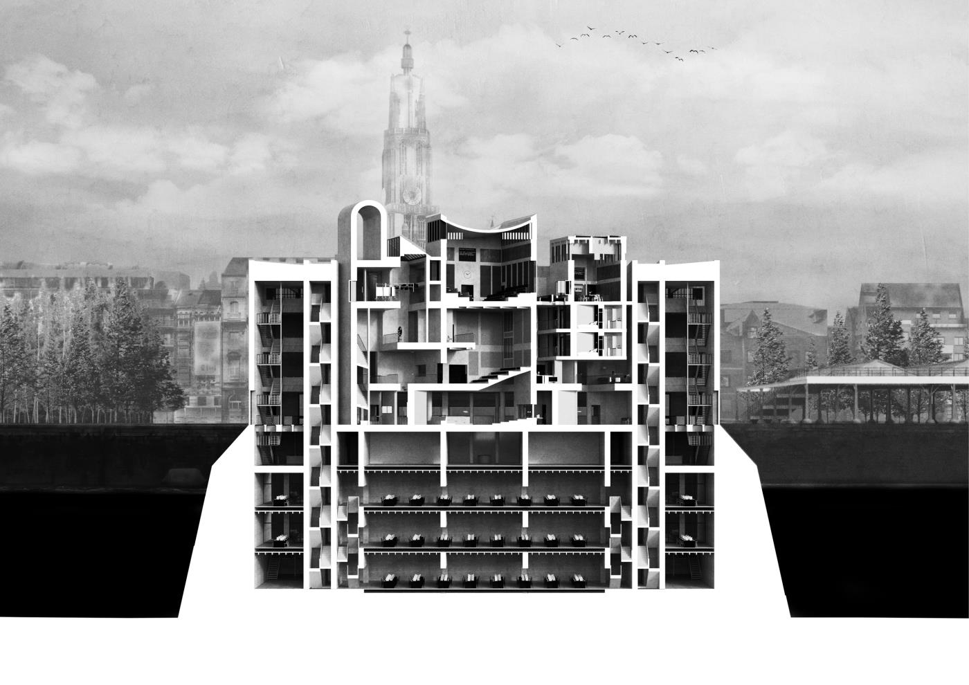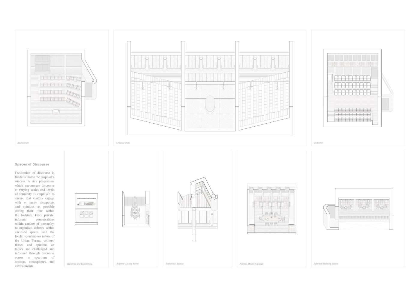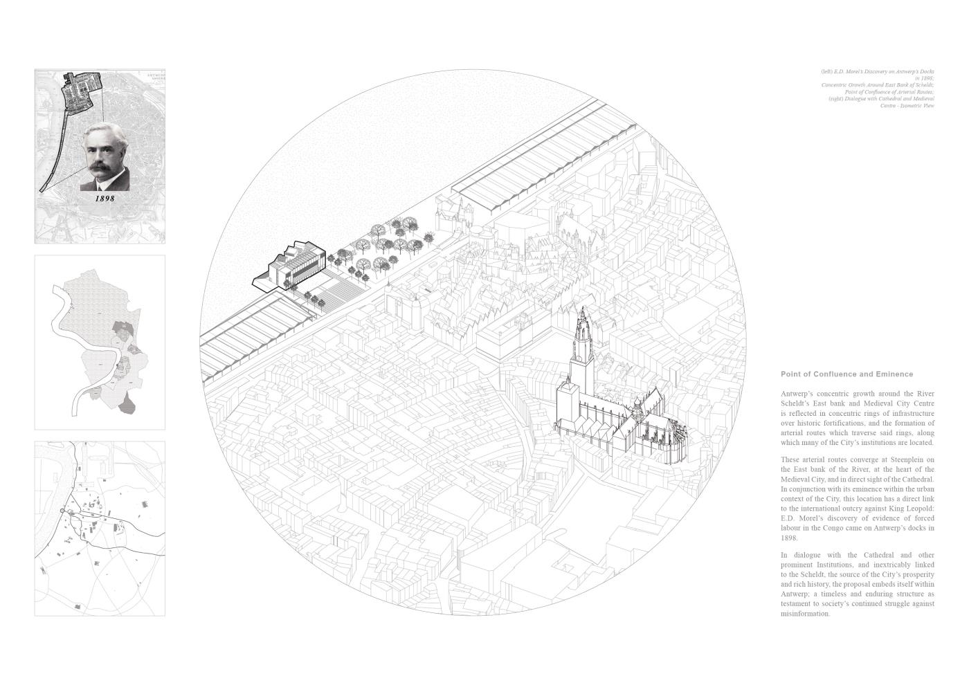 An Absolute Truth? Part 2 Project 2020 Matt McCluskey Mackintosh School of Architecture | UK In a near and not implausible future where society’s descent into a maelstrom of misinformation has obliterated the boundary between fact and fiction, an Institute of Political Objectivity is proposed as a global exemplar in Antwerp. The international outcry against King Leopold II’s abhorrent reign over the Congo Free State informs the proposal’s objectives: the holding of political parties and figures to account; and the promotion of objectivity within the global political system through dialectic teaching, active discourse, and procedural transparency.Intrinsically linked volumes comprised of Accommodation for Visiting Experts, Galleries and Exhibition Spaces, and Debate Spaces, facilitate discourse and the pursuit of objective truth through the examination of all hypotheses, as asserted in Plato’s Analogy of the Divided Line. A subterranean, digital archive holds a record of all events within the building, in order to safeguard objective information and hold the Institute itself to account. Tutor(s) Neil Simpson