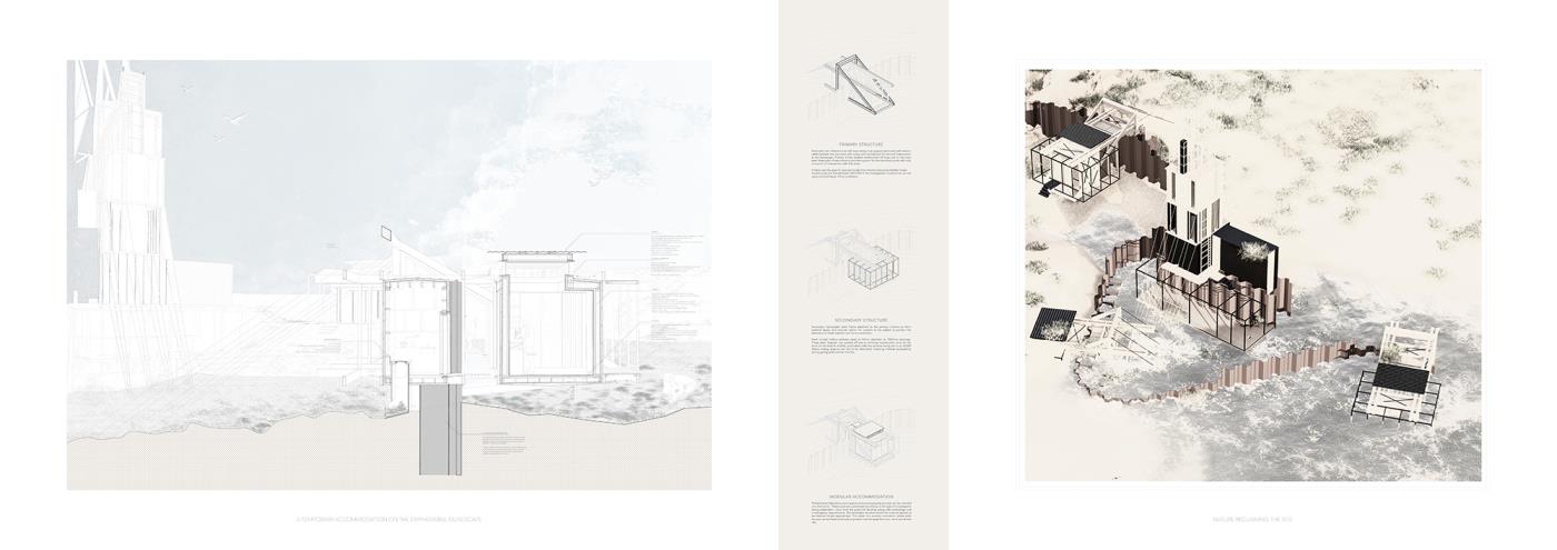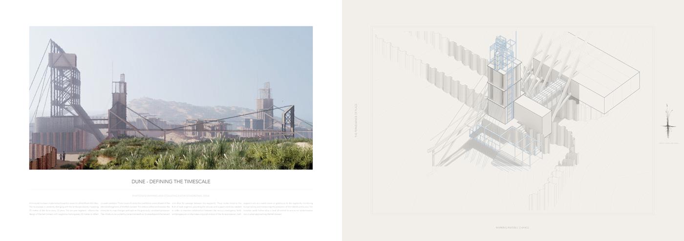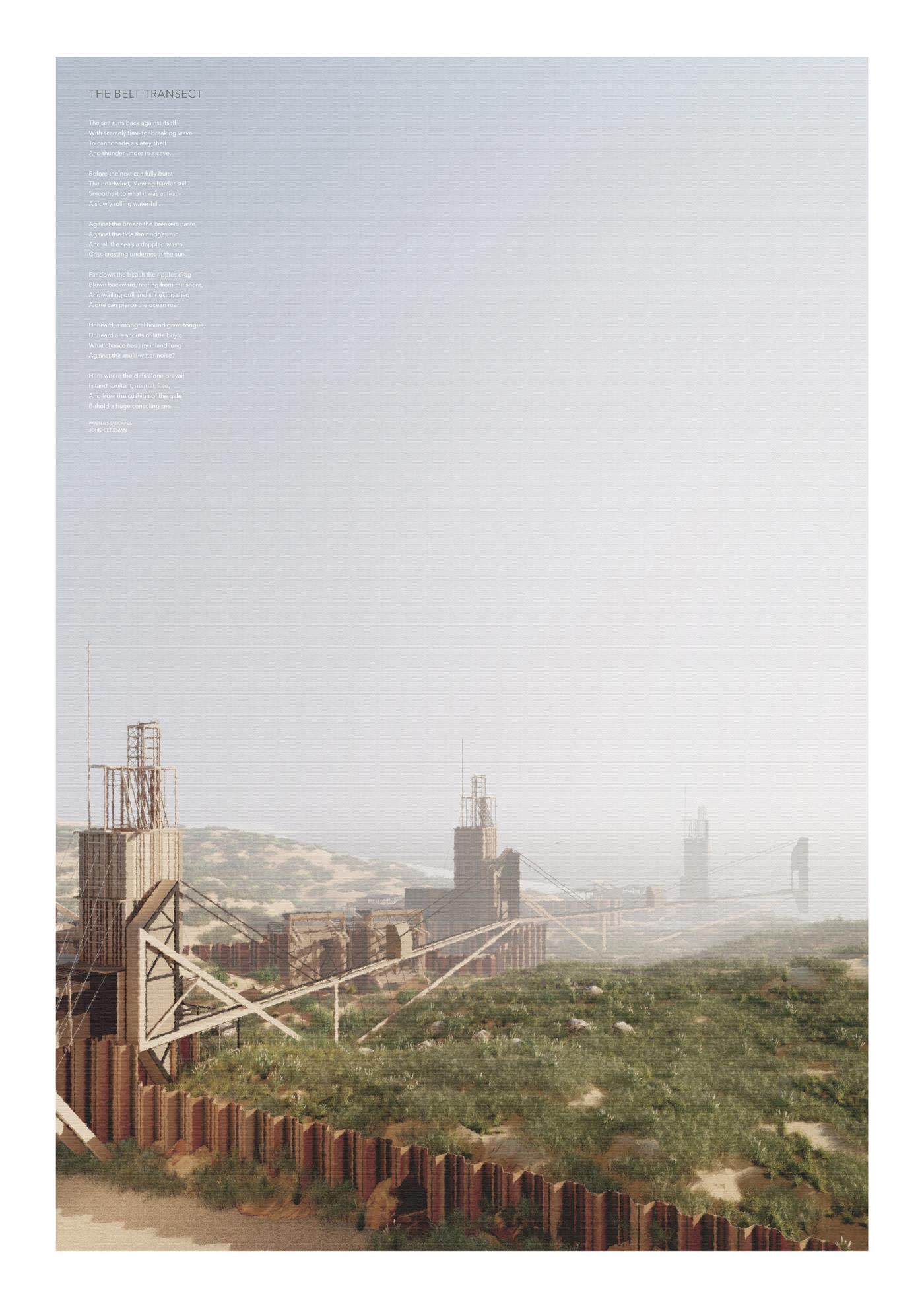 The Belt Transect Part 2 Project 2020 Jessica Leggett Northumbria University Newcastle | UK This thesis investigates the processes evident within the dune-scapes’ coastal conditions, highlighting the importance of revealing the invisible. Set within the strong character of Bamburgh, the intervention creates insight to the ‘hidden’ processes and histories that lie beneath its cascading dunes. Through analysis of place, using methodologies from the processes of archaeology and geography, the proposal seeks to question the affect of the Anthropocene on our landscapes edges, and propose a ‘belt transect’ in order to measure and bring about awareness to the unnoticed affects of climate change through the archiving of curios found in the dune. The scheme will provide a place experience, measure and analyse the landscape, providing education and joy of nature to people of today, whilst defending its legacy for the future. The scheme challenges the British relationship with landscape, the coast, our nostalgic tendencies, and the anthropogenic impacts of over the last centuries assault on the atmosphere. By implementing an architectural device within the dune to monitor and express the invisible processes within the protected natural setting, the scheme will illustrate the loss that could incur as a result of coastal changes in sea, edge, dune and land as a result of our negligence. Tutor(s) Lesley McIntyre Stephen Roberts