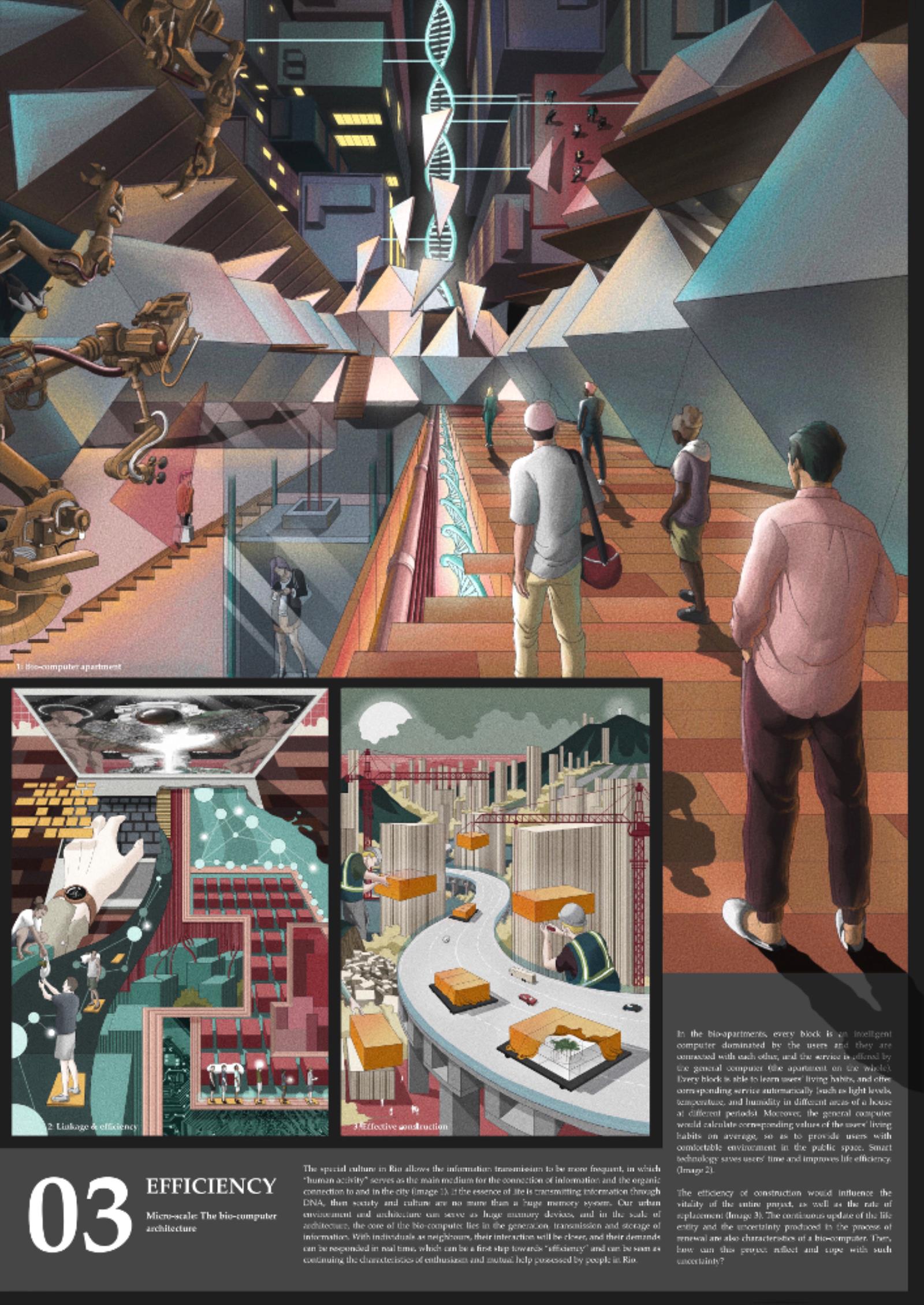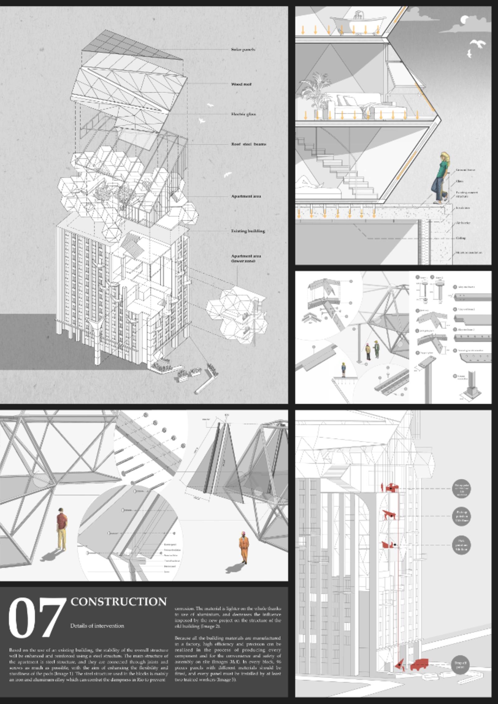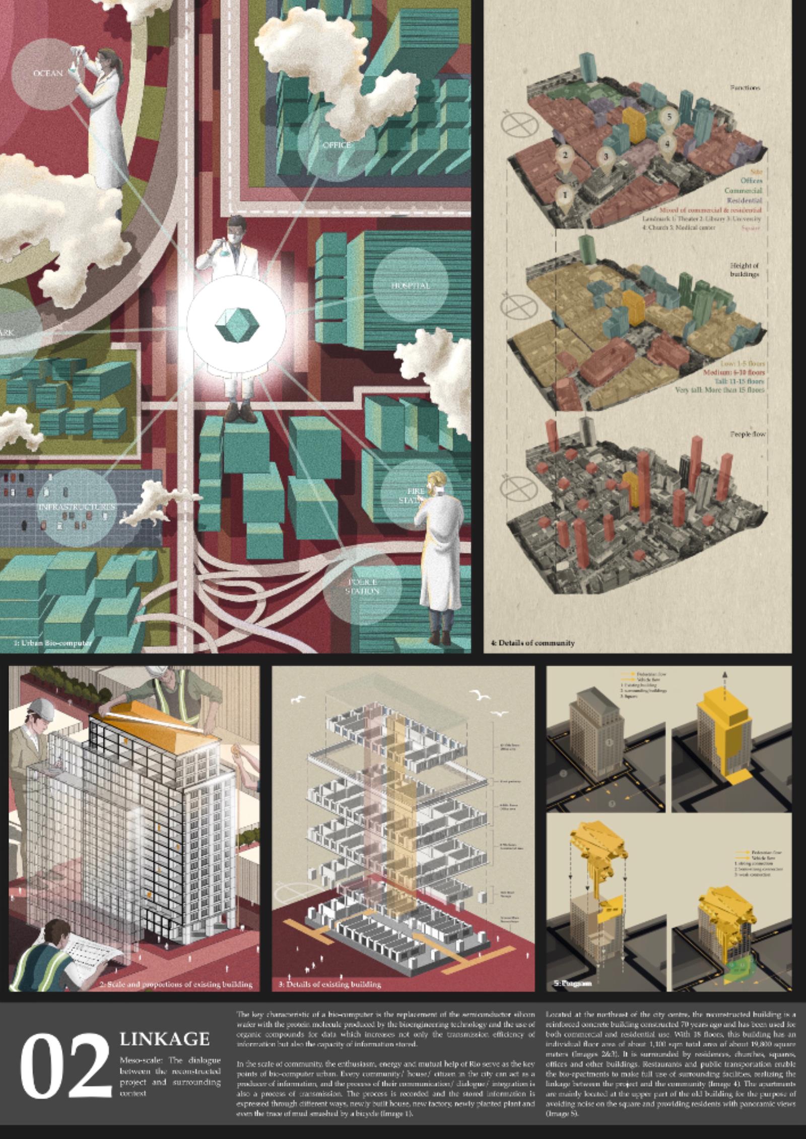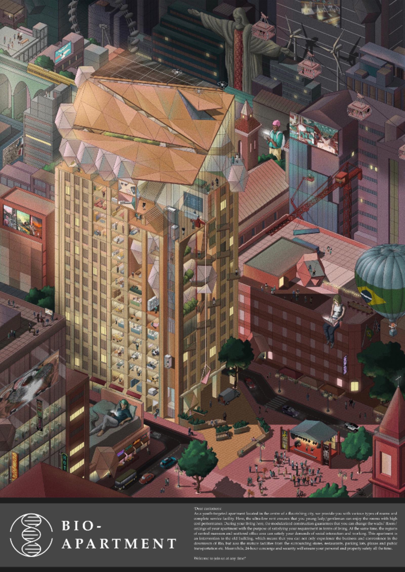 With “bio-computer” as the basic concept, this project is about the refurbishment and extension of a concrete frame building in Rio de Janeiro, enabling the newly built part to be an apartment complex developed to reveal a key characteristic of Rio — connection. As a supercomputer that uses biology as the medium for information transmission, bio-computer reveals the key to connection in the scale of a building – individuals. Users are deemed as the main carriers for the generation, transportation, and storage of information. Among these individuals, the young, who are equitable to the most dynamic DNA chain in a bio- computer, are also very fragile, and they are subject to the deepest influence imposed by the housing crisis. Therefore, the project is aimed at developing an affordable housing option for the young. The design allows users to customise every room to express their personality and the building material can be purchased freely with the use of a prefabricated system. With the renovation of an existing building, it displays the contrast between new rules and old rules, as well as the connection and interaction between the new and the old.