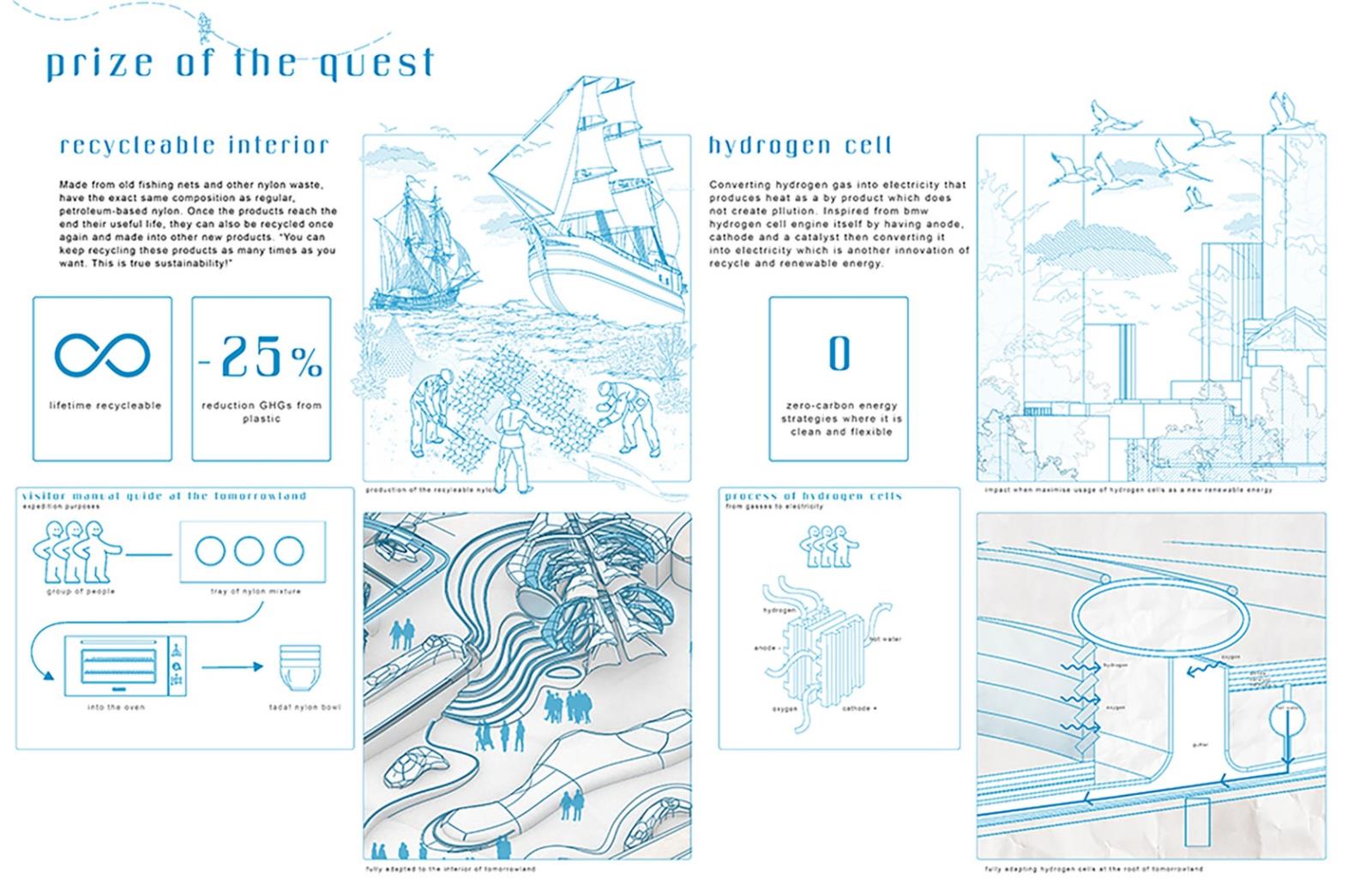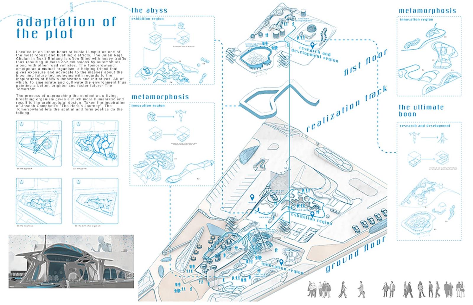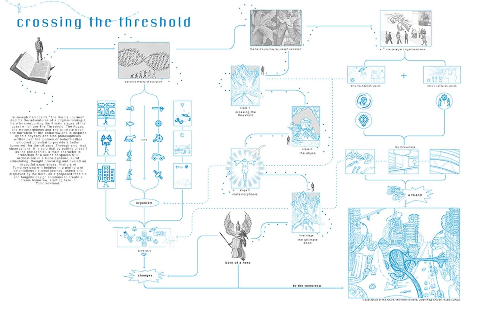 The narration is inspired by Joseph Campbell’s “The Hero’s Journey”, the adventures of a pilgrim- turning-a hero. This odyssey and philosophises written over the journey of today’s cities unlocked potential to provide a better tomorrow. Visitors will indulge in a fictional journey displayed by the hero on a proposed tangible design solution here in Tomorrowland.