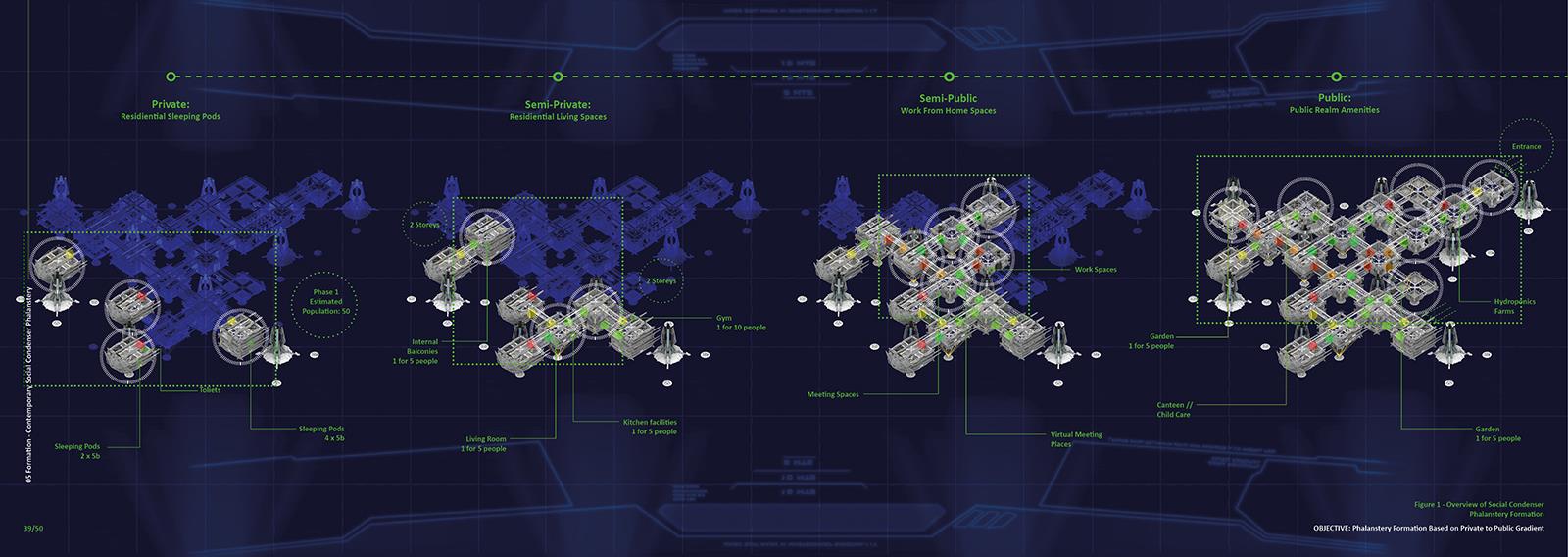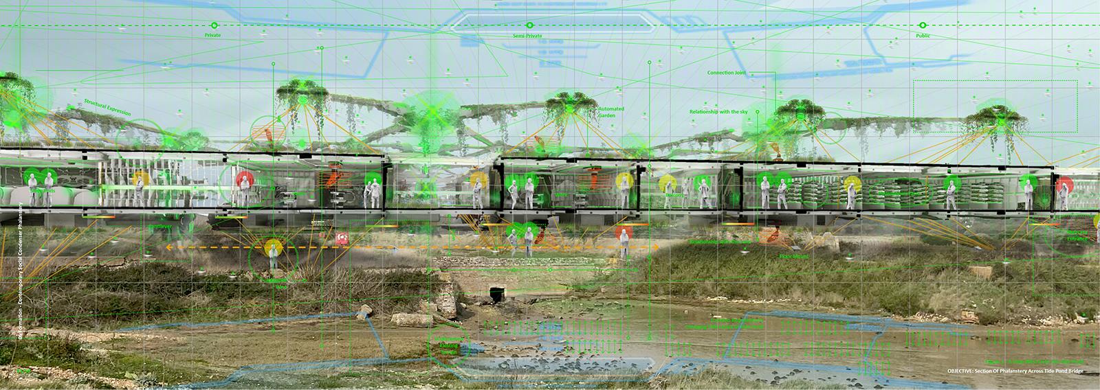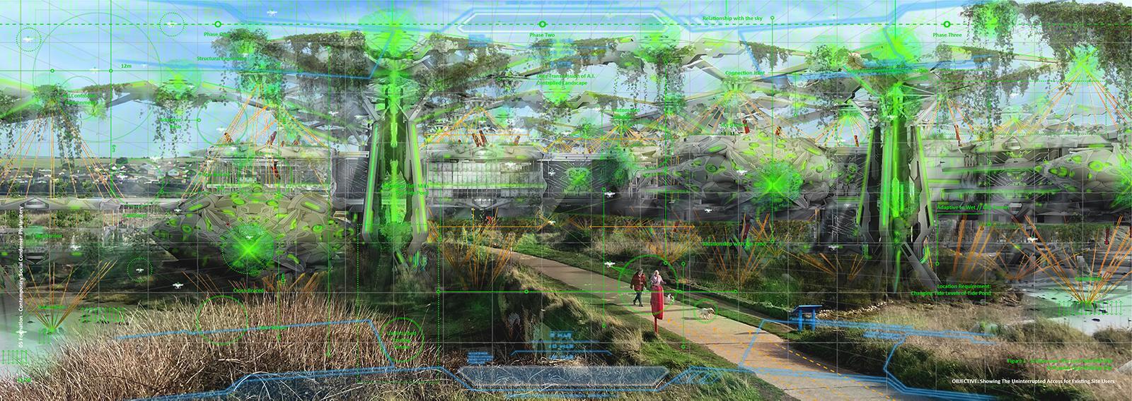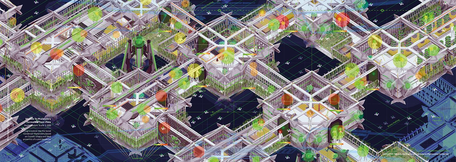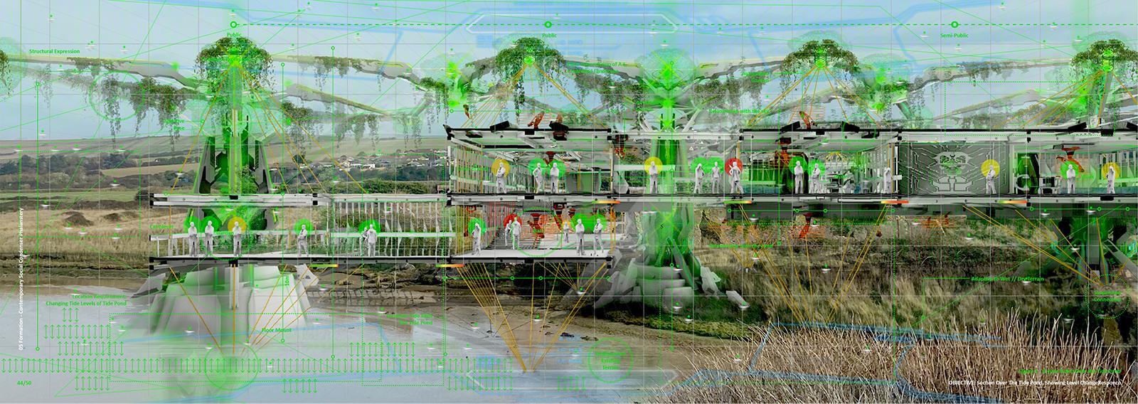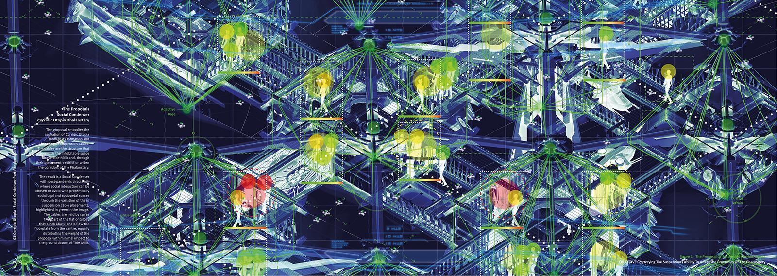 The Timely Proxemics of a Post-Human Social Condenser Phalanstery Part 2 Project 2021 Harry Harwood University of Brighton | UK The project turns to the ideology of 1920s Constructivists and the Social Condenser: buildings with an ambition to support lives through sport, culture and education. Focusing on the premise of Corridic Utopia, it sees the application of sociopetal corridors to create forced social interaction while new sociofugal routes offer places for shielding. The scheme is sited in Tide Mills, a piece of land squeezed between infrastructure, industry, suburbia and sea and looks to reinstate the culture of a Social Condenser Phalanstery – a community of collective living. The architecture embodies the idea of being a Flat Ontology through speculation of a Constructed Chimaera – the readable transformation of one object into the next. Figuration on the building’s skins interacts with its underlying form and deviates from it, creating ambiguous scale effects and links between architectural parts, essentially arguing that the beauty of tectonics is its ability to create post-human fictions. Tutor(s) Jeffrey Turko