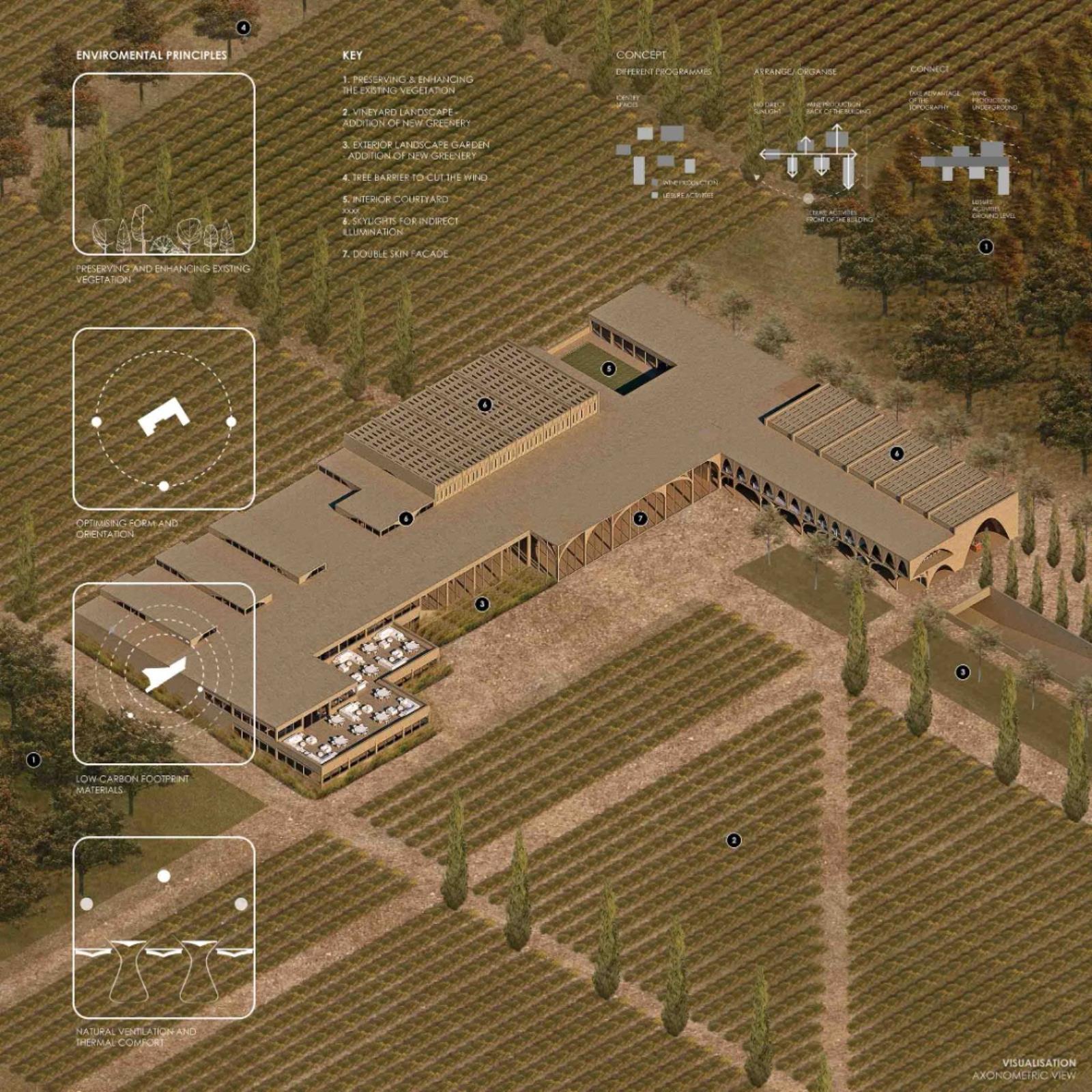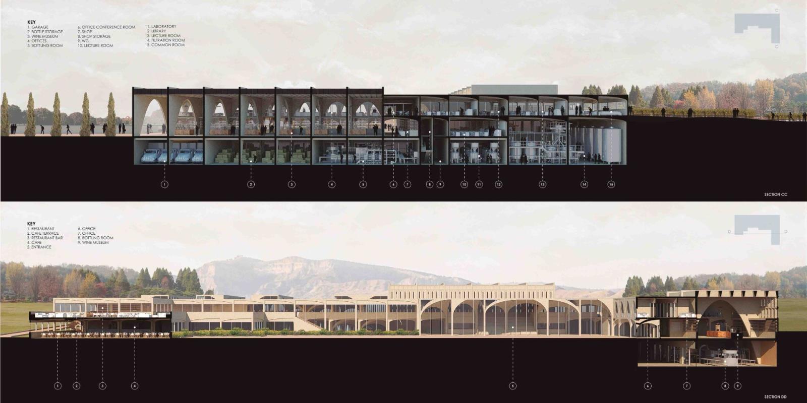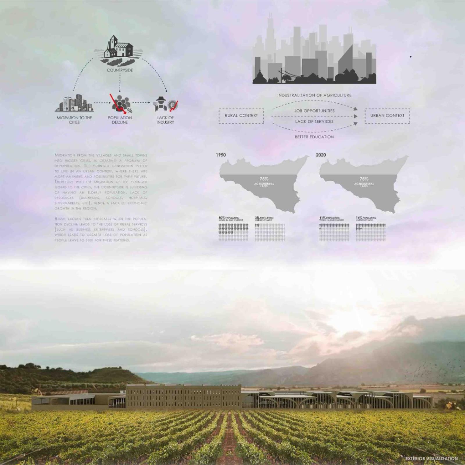 Santo Pietro’s Winery Part 2 Project 2021 Raul Mormeneo Colomer University of East London London | UK The project is located in the small village of Santo Pietro, in an extensive rural area in the Comune of Caltagirone in Sicily. Benefited from the weather, landscape and lack of urbanization on the region, the area has excellent potential to attract new agricultural related economies, adapt to new trends on tourism such as Agriturismo, and hence create an economic boost in the region which would ultimately develop the growth and expansion of Santo Prieto.The greatest problem most rural areas face is the rural-urban migration. The thesis aims to challenge this reality offering a pure agricultural experience, attracting people to the region while creating a long-lasting relationship between the visitor and the place and in turn provide rural development and employment generation while providing a positive environmental impact.Driven by the rich history and culture of Sicilian Wine manufacturing, the building’s shape and forms have been sensibly inspired by the construction techniques employed since the ancient times, from the Greeks, up to the Baroque. The ‘Arch’ and the ‘Vault’ are two elements which have been cautiously researched and experimented with in this project notonly for structural purposes, but to create extraordinary complex spaces to fit every programme. Tutor(s) Carlo Cappai Maria Alessandra Segantini