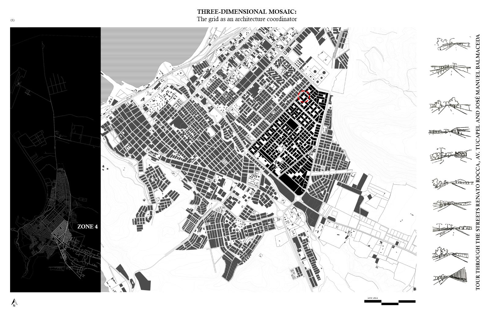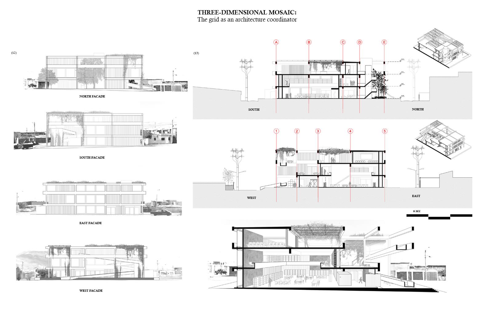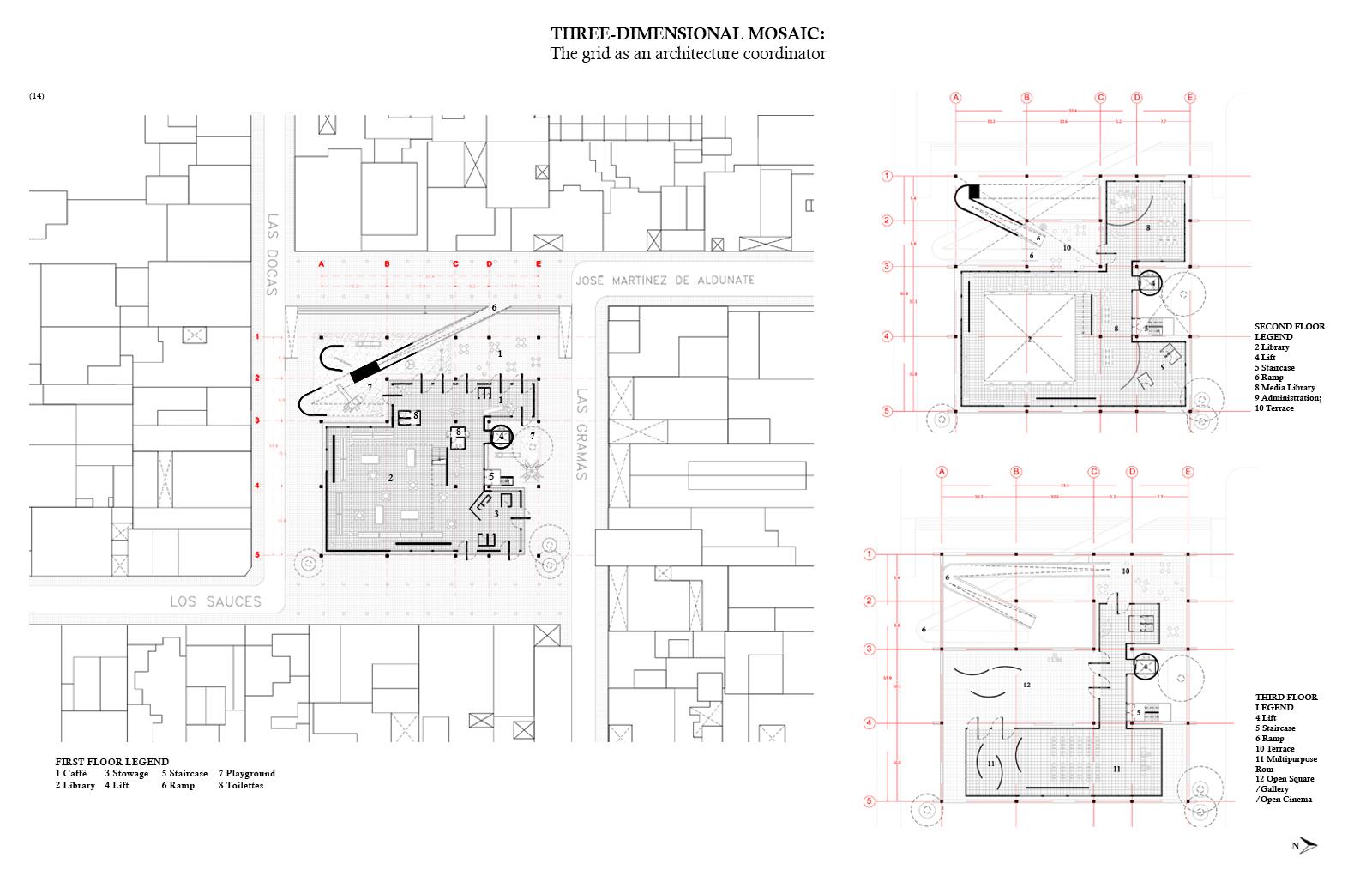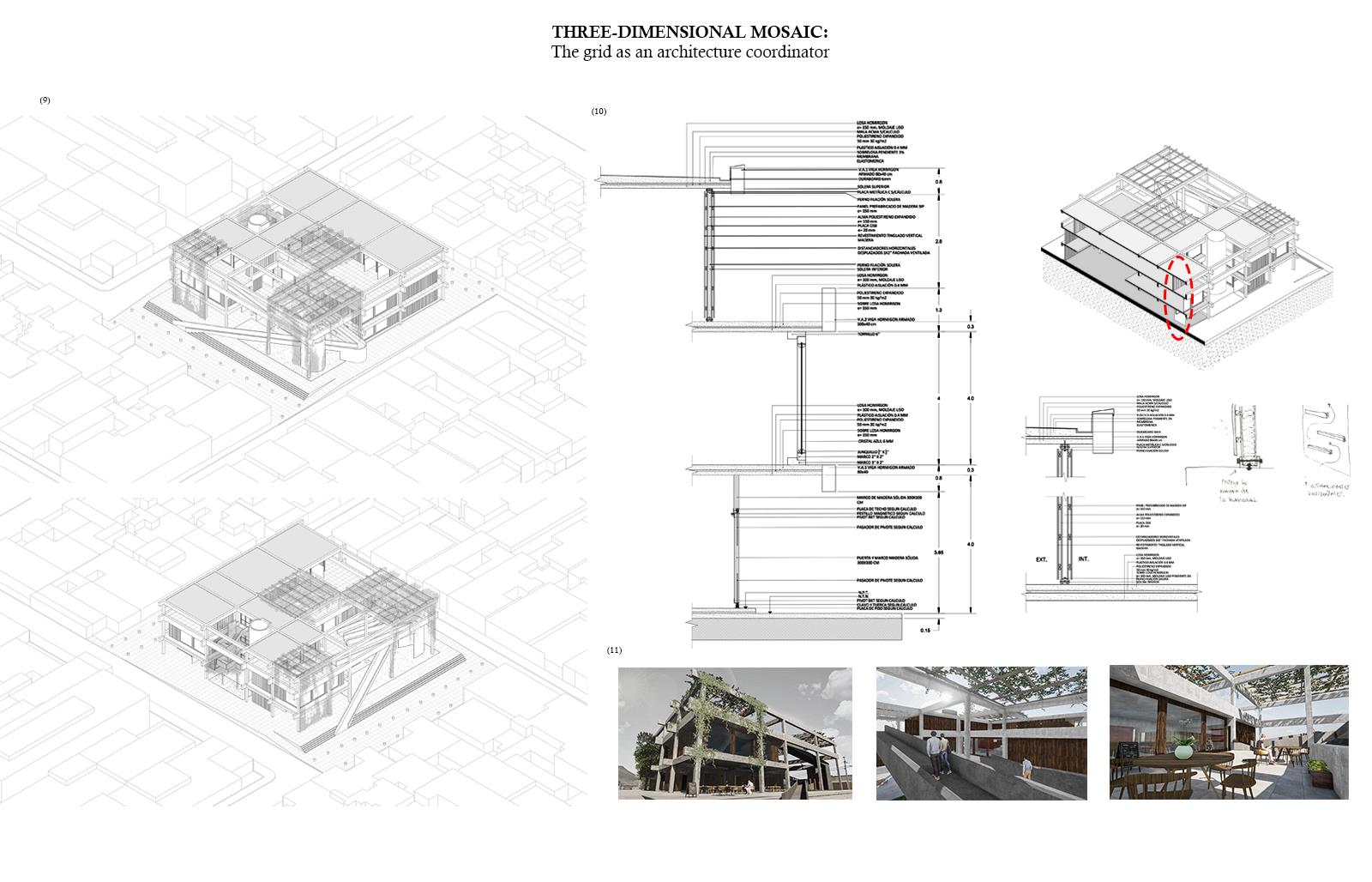 The project seeks to decipher the tools that composition can provide through its projection as a grid. The grid as a compositional tool that derives from the analysis of art, especially through mosaics and modern art, which work as a method of organization for smaller systems that are part of a bigger picture. Furthermore, the project analyzes this type of plan-making in terms of place and architectural systems, which all together can conform to a project that can be better understood as an architectural mosaic. The grid as the main tool for the unification of a multi-programmatic, architectural device that, together with the concept of open-plan postulated by Le Corbusier, as well as the correlation between both, give rise to all the systems that make up a project: structure, circulation, and enclosure. A coordination of small autonomous systems in pursuit of a larger, articulated and coordinated one.