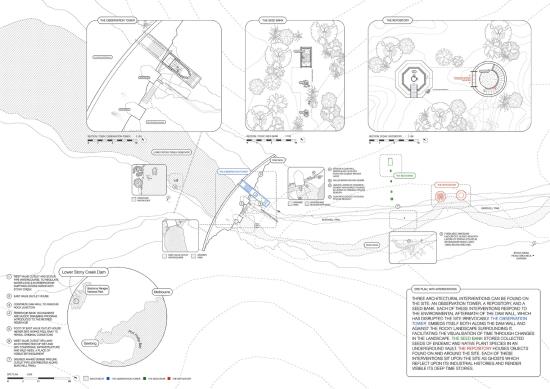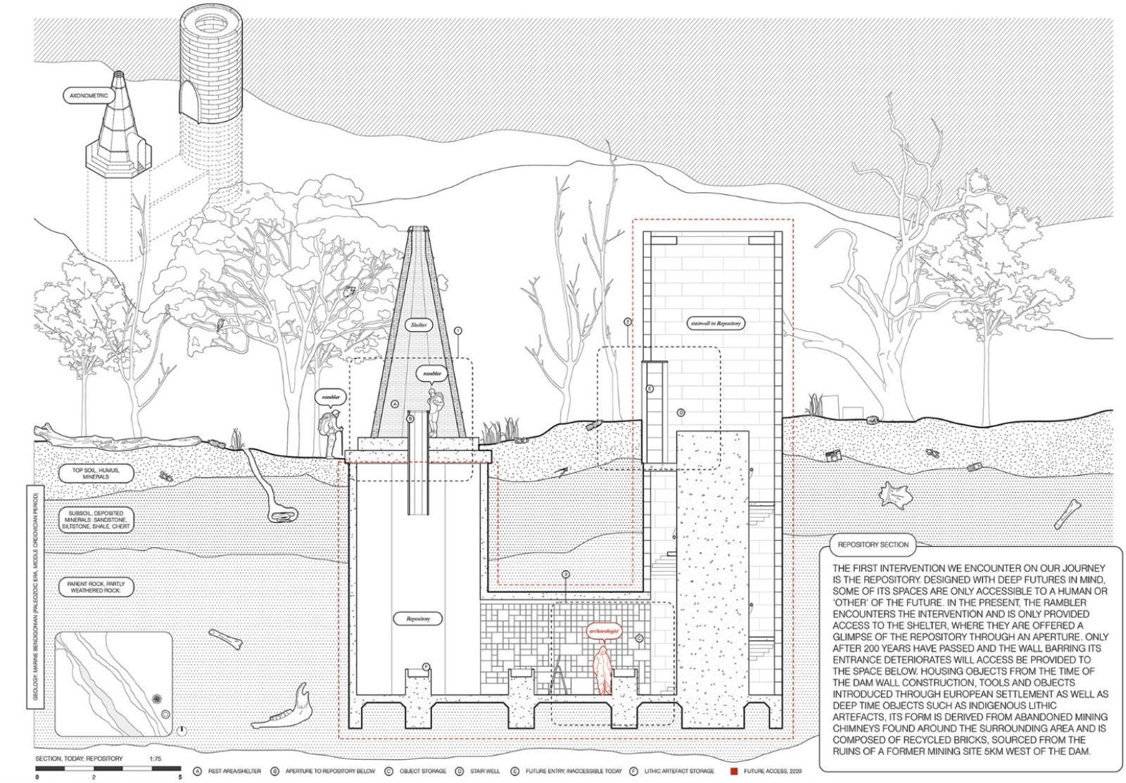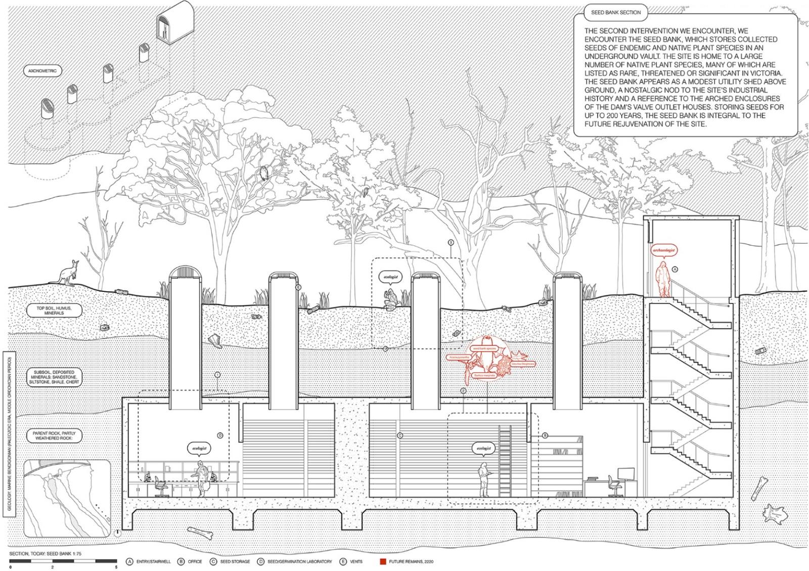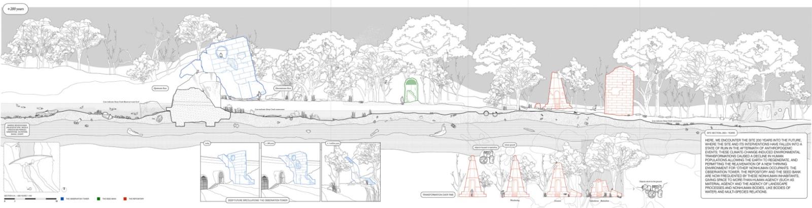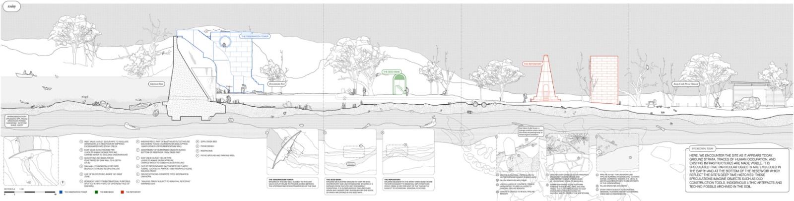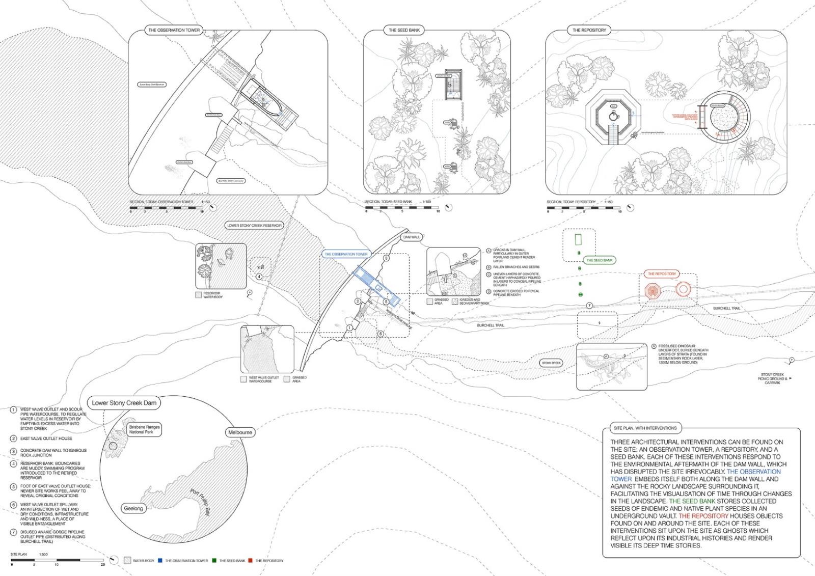 Infrastructural Remains: Caring for Anthropogenic Ruins Part 2 Project 2021 Emilie Evans University of Melbourne | Australia This speculative project renders visible environmental stories of infrastructural care by exploring the possibility of architecture amidst Anthropogenic ruins. Juxtaposing temporalities of the deep past, the present and the deep future, the project situates itself in dialogue with the oldest concrete dam in Australia: Lower Stony Creek Dam, built in 1873 and located on the Victorian Volcanic Plains. Once a site of significant industrial activity, today the Dam Wall is deemed a retired water storage facility and sits in the landscape as a post-industrial relic. A suite of interventions including an Observation Tower (composed of a conglomerate of plastic debris), a Repository (housing relics, from industrial objects to Indigenous lithic artefacts), and a Seed Bank (storing collected seeds of endemic native plant species in an underground vault), respond to the former life of the Dam and speculate upon its more-than-human futures. Multi-species relations, nonhuman agency and more-than-human bodies, like the dammed body of water itself, are foregrounded. Balancing the poetic with the pragmatic, the architectural interventions respond to environmental concerns such as loss of biodiversity and ecological devastation and engender ways in which we might care for infrastructures once they are defunct. In a time of planetary uncertainty architecture becomes the critical tool by which alternative futures might be imagined. Tutor(s) Helene Frichot
