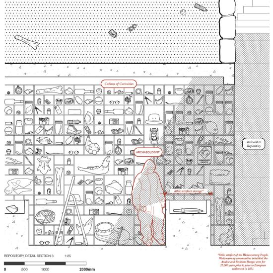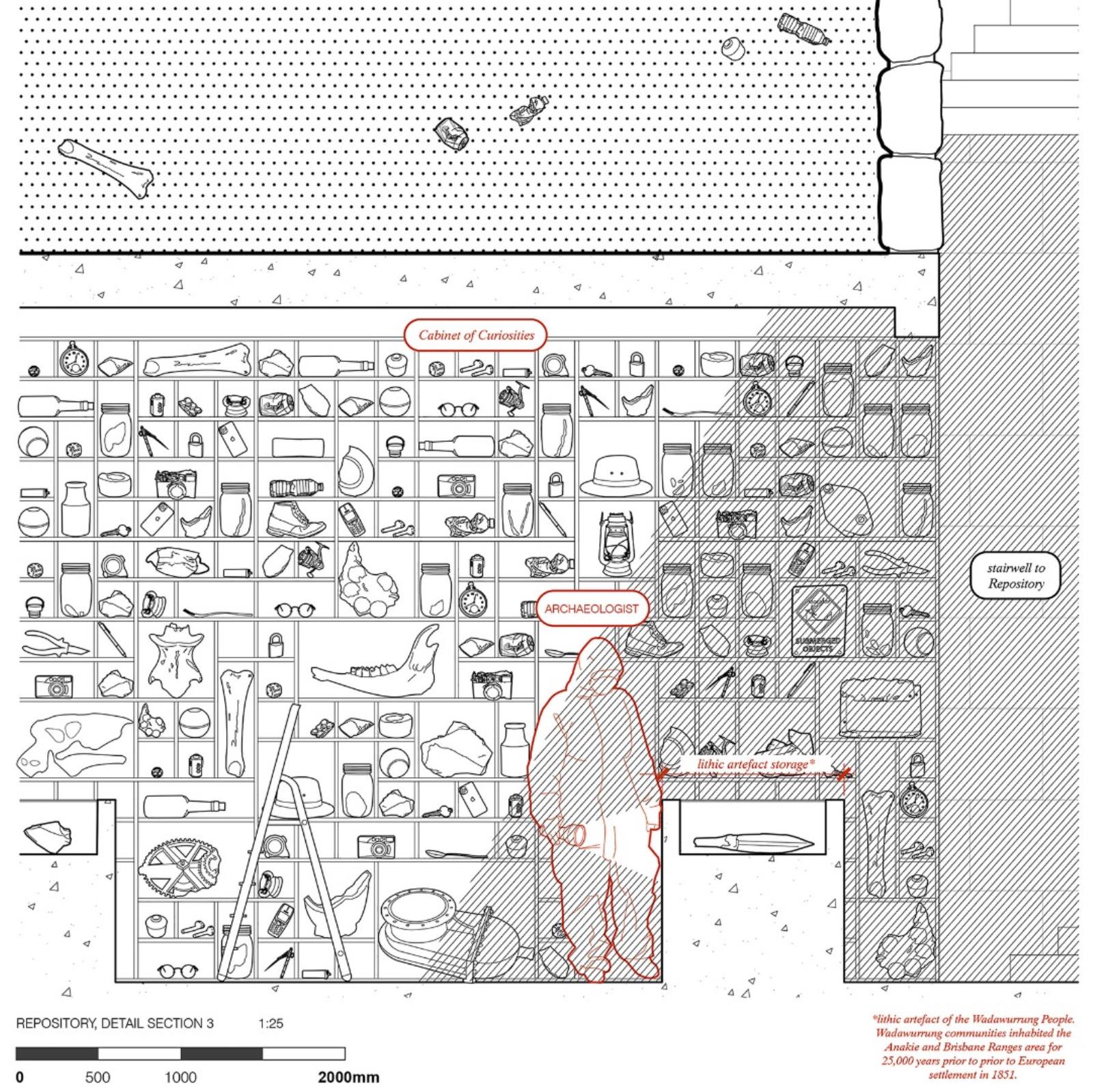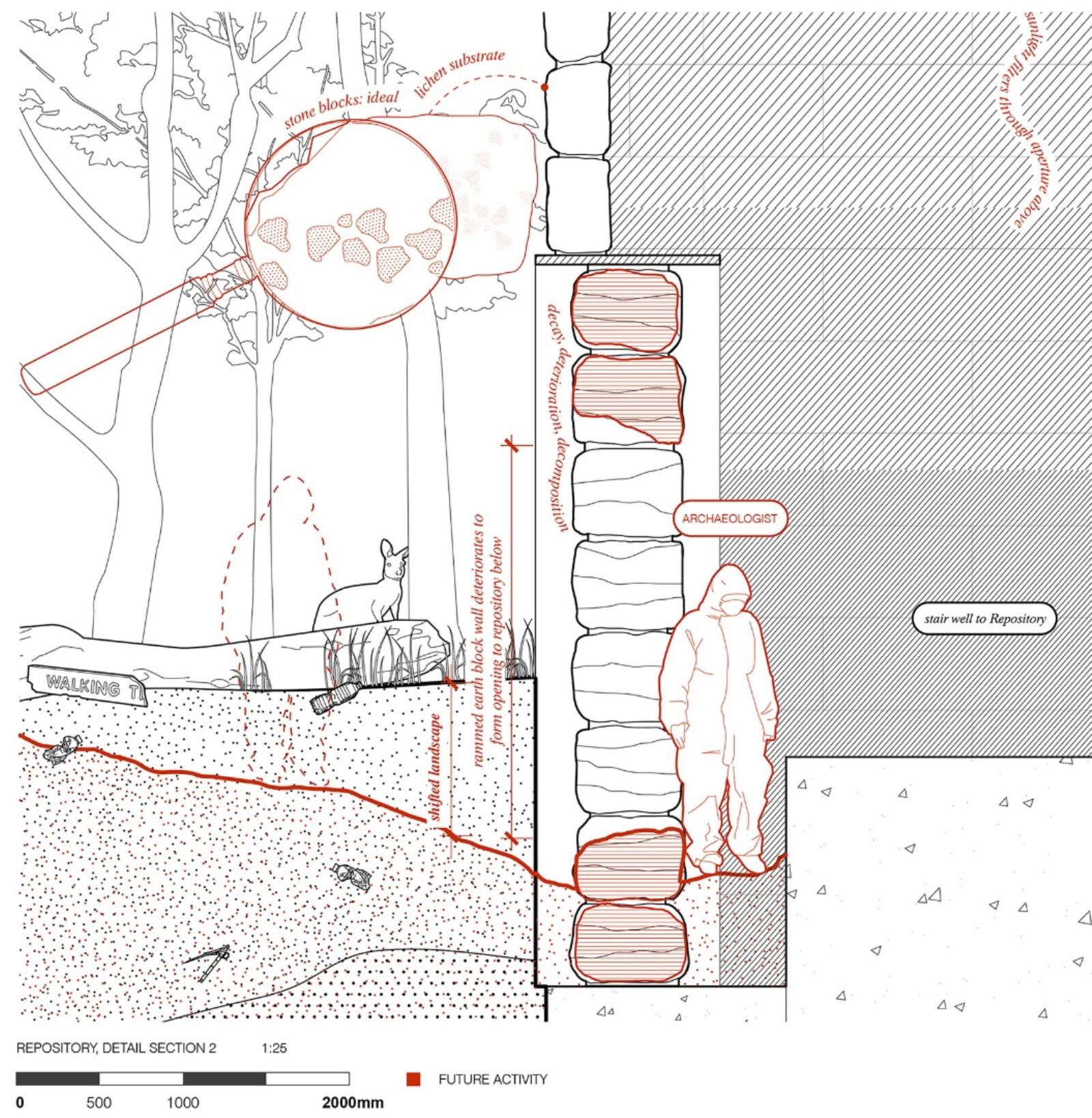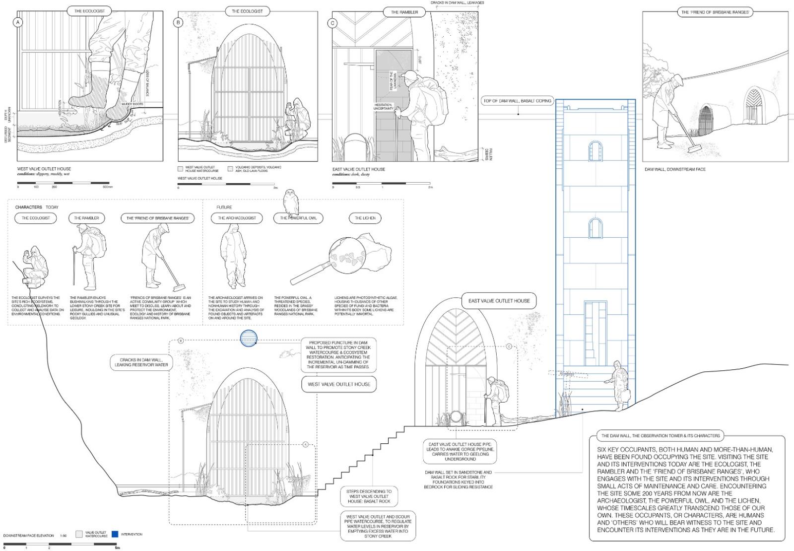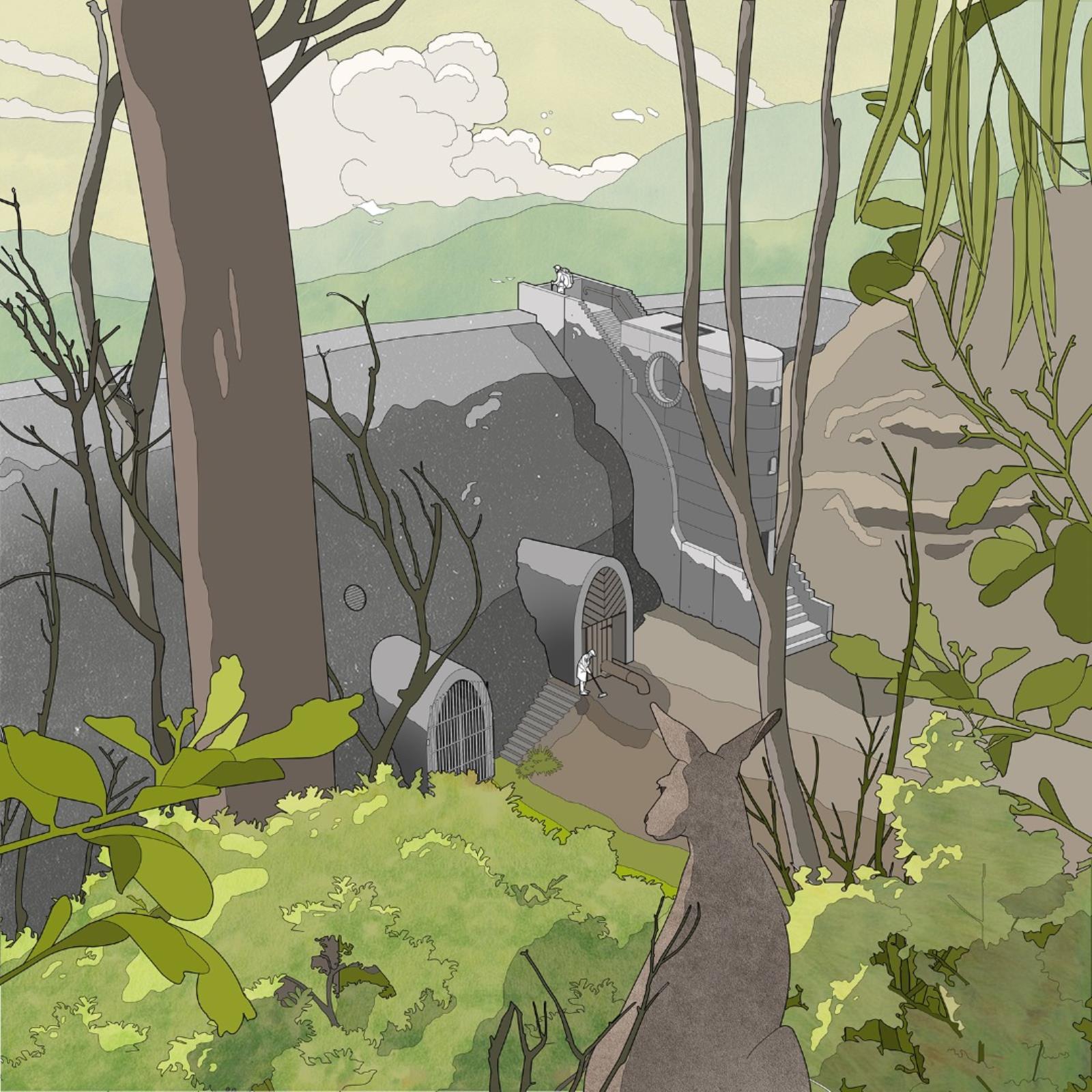 Infrastructural Remains: Caring for Anthropogenic Ruins Part 2 Project 2021 Emilie Evans University of Melbourne | Australia This speculative project renders visible environmental stories of infrastructural care by exploring the possibility of architecture amidst Anthropogenic ruins. Juxtaposing temporalities of the deep past, the present and the deep future, the project situates itself in dialogue with the oldest concrete dam in Australia: Lower Stony Creek Dam, built in 1873 and located on the Victorian Volcanic Plains. Once a site of significant industrial activity, today the Dam Wall is deemed a retired water storage facility and sits in the landscape as a post-industrial relic. A suite of interventions including an Observation Tower (composed of a conglomerate of plastic debris), a Repository (housing relics, from industrial objects to Indigenous lithic artefacts), and a Seed Bank (storing collected seeds of endemic native plant species in an underground vault), respond to the former life of the Dam and speculate upon its more-than-human futures. Multi-species relations, nonhuman agency and more-than-human bodies, like the dammed body of water itself, are foregrounded. Balancing the poetic with the pragmatic, the architectural interventions respond to environmental concerns such as loss of biodiversity and ecological devastation and engender ways in which we might care for infrastructures once they are defunct. In a time of planetary uncertainty architecture becomes the critical tool by which alternative futures might be imagined. Tutor(s) Helene Frichot
