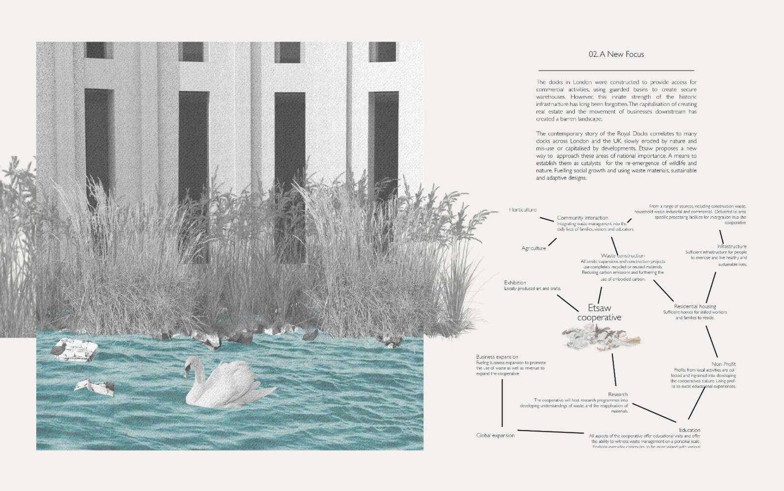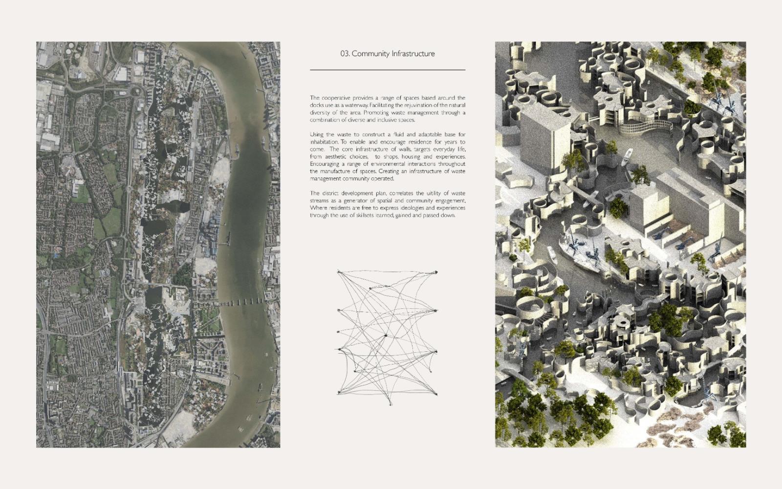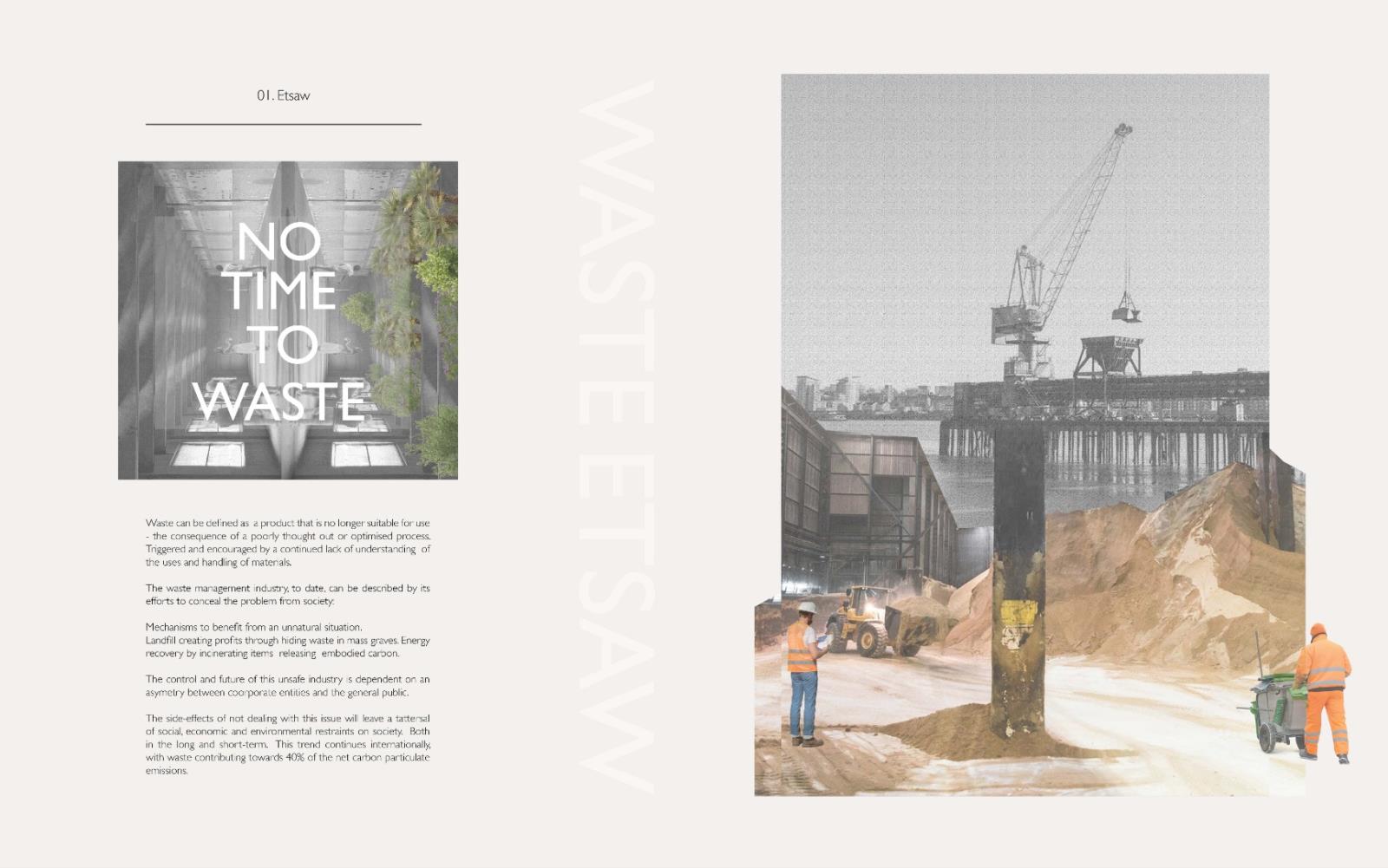Etsaw: Una Citta di Rifiuti Part 1 Project 2022 Drew MacDonell Anglia Ruskin University | UK Global production of waste is creating an unsustainable future for our planet. One that depletes our finite natural resources and negatively impacts the climate. Current trends show that by 2050 continued waste streams will leave the ocean containing more plastic than fish. With no consideration to the global community, large corporations and manufacturers are taking slow steps to correct the problem of waste. This attitude has left international communities to witness environmental deterioration on an alarming scale. Global activity contributing a net 2.01 billion tonnes of waste annually, an ever-increasing statistic.The Etsaw project outlines the building blocks of a regenerative cooperative, aimed at providing an alternative and sustainable approach to developing urban areas. To override the current urban development plan for the Royal Docks, providing an enhanced water-based and adaptable settlement for industry to thrive. Using the history of the area as a catalyst for future opportunities. To create a post-pandemic settlement in the heart of London. Providing necessary domestic improvements to the local Newham community, including a new spectrum of jobs and affordable homes. Extending the already present waste management infrastructure to create self-sustaining communal hubs and districts. To encourage the return of complex biodiversity into London. Tutor(s) Howard Gilby