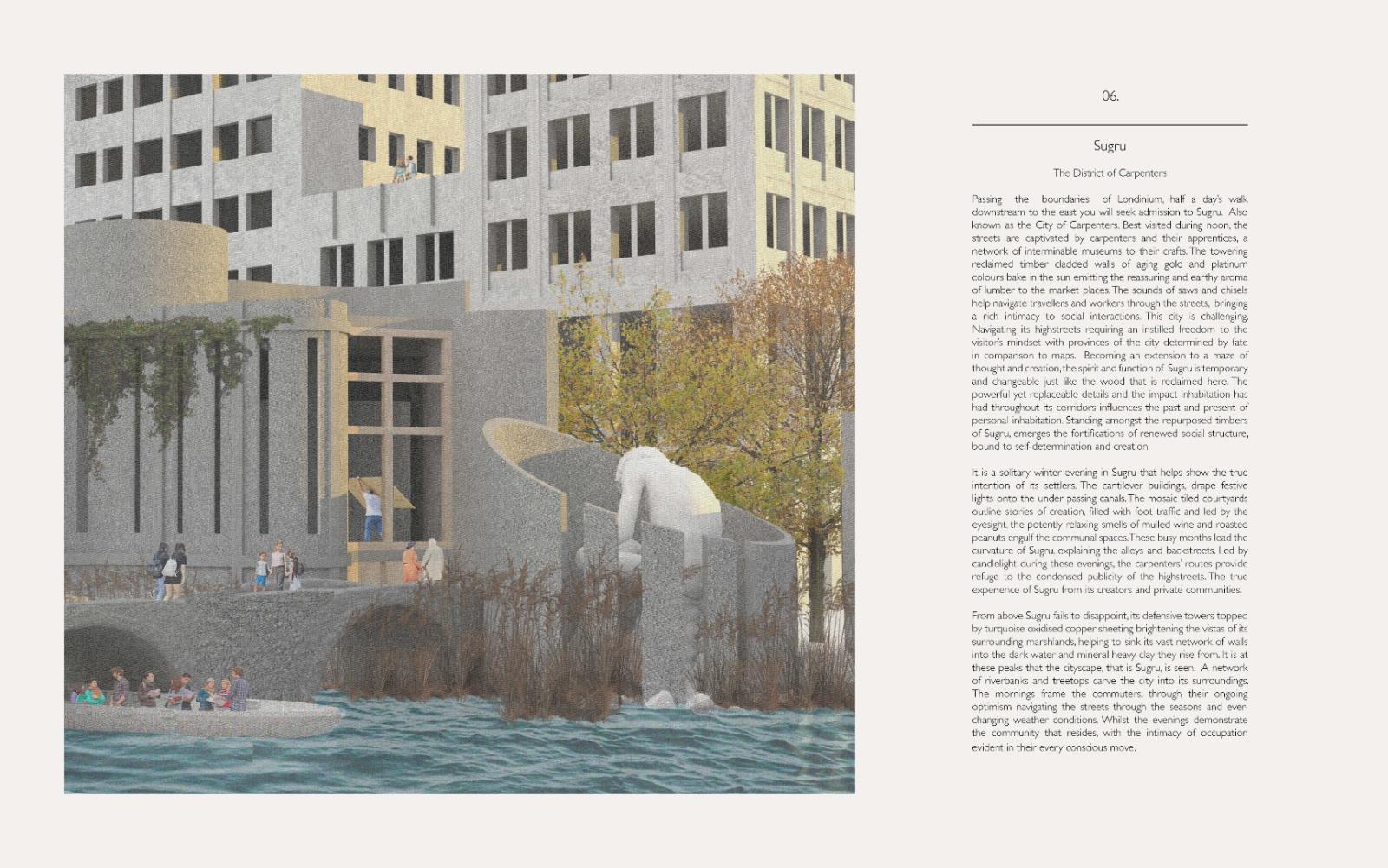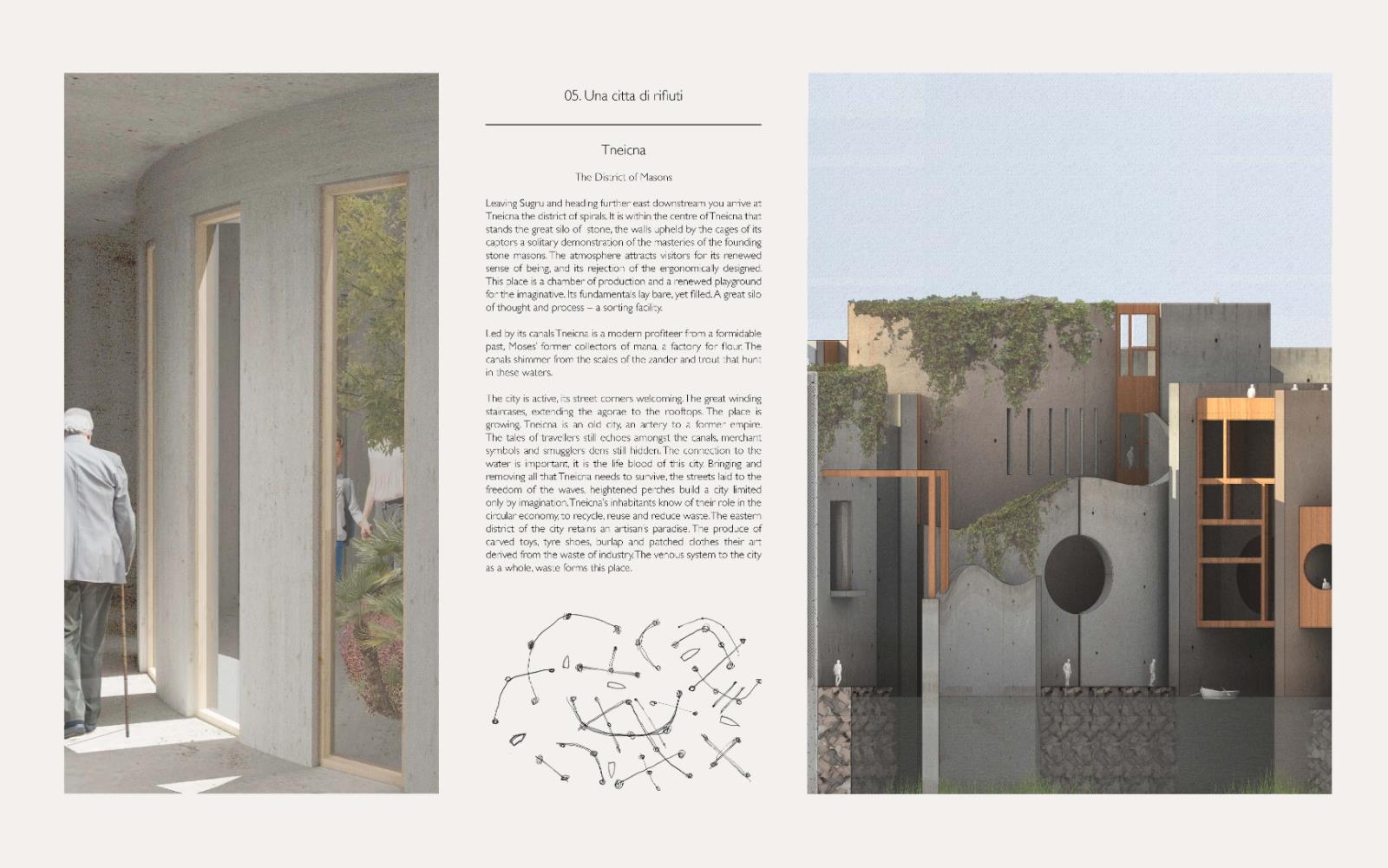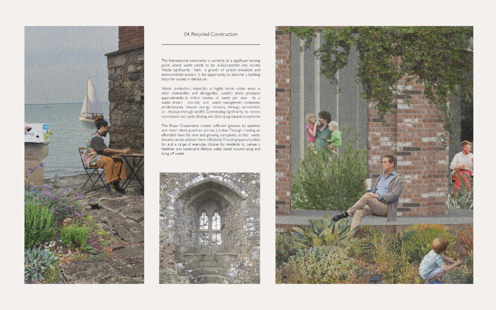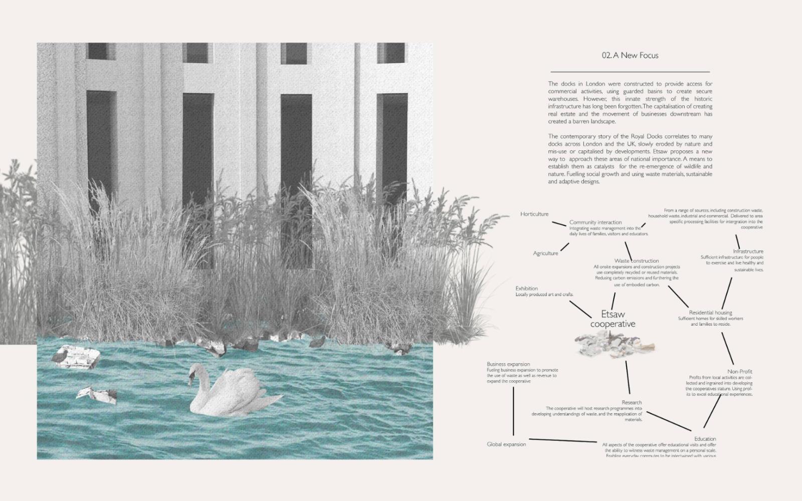 Etsaw: Una Citta di Rifiuti Part 1 Project 2022 Drew MacDonell Anglia Ruskin University | UK Global production of waste is creating an unsustainable future for our planet. One that depletes our finite natural resources and negatively impacts the climate. Current trends show that by 2050 continued waste streams will leave the ocean containing more plastic than fish. With no consideration to the global community, large corporations and manufacturers are taking slow steps to correct the problem of waste. This attitude has left international communities to witness environmental deterioration on an alarming scale. Global activity contributing a net 2.01 billion tonnes of waste annually, an ever-increasing statistic.The Etsaw project outlines the building blocks of a regenerative cooperative, aimed at providing an alternative and sustainable approach to developing urban areas. To override the current urban development plan for the Royal Docks, providing an enhanced water-based and adaptable settlement for industry to thrive. Using the history of the area as a catalyst for future opportunities. To create a post-pandemic settlement in the heart of London. Providing necessary domestic improvements to the local Newham community, including a new spectrum of jobs and affordable homes. Extending the already present waste management infrastructure to create self-sustaining communal hubs and districts. To encourage the return of complex biodiversity into London. Tutor(s) Howard Gilby