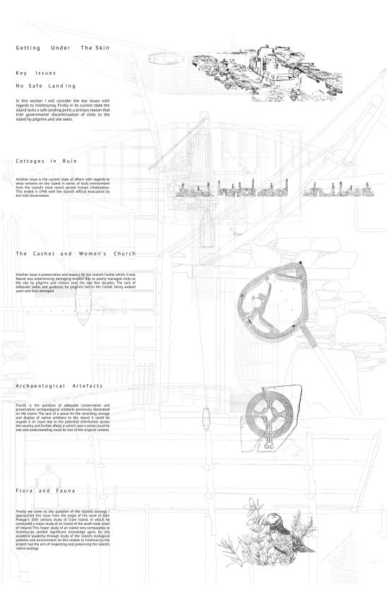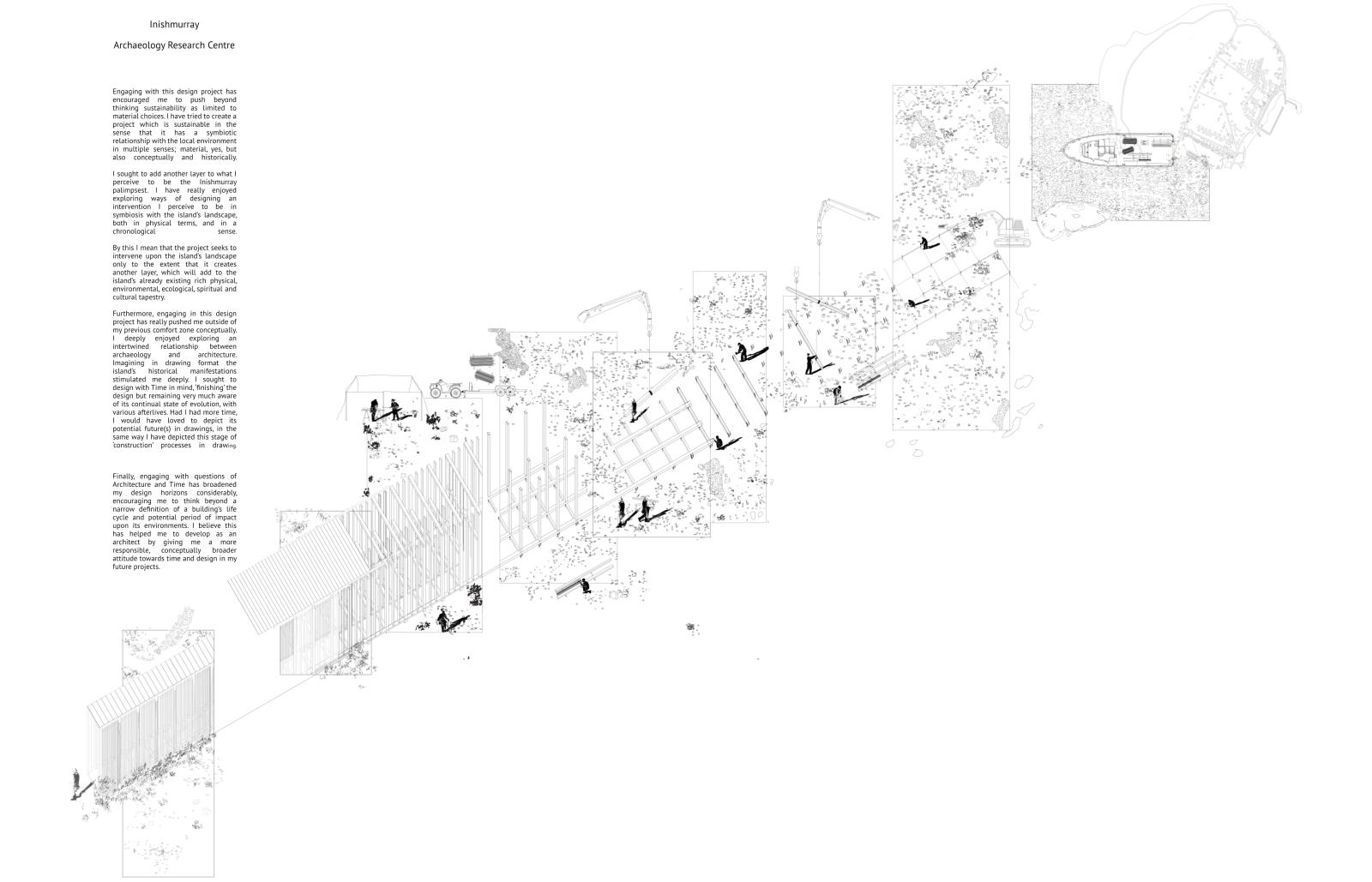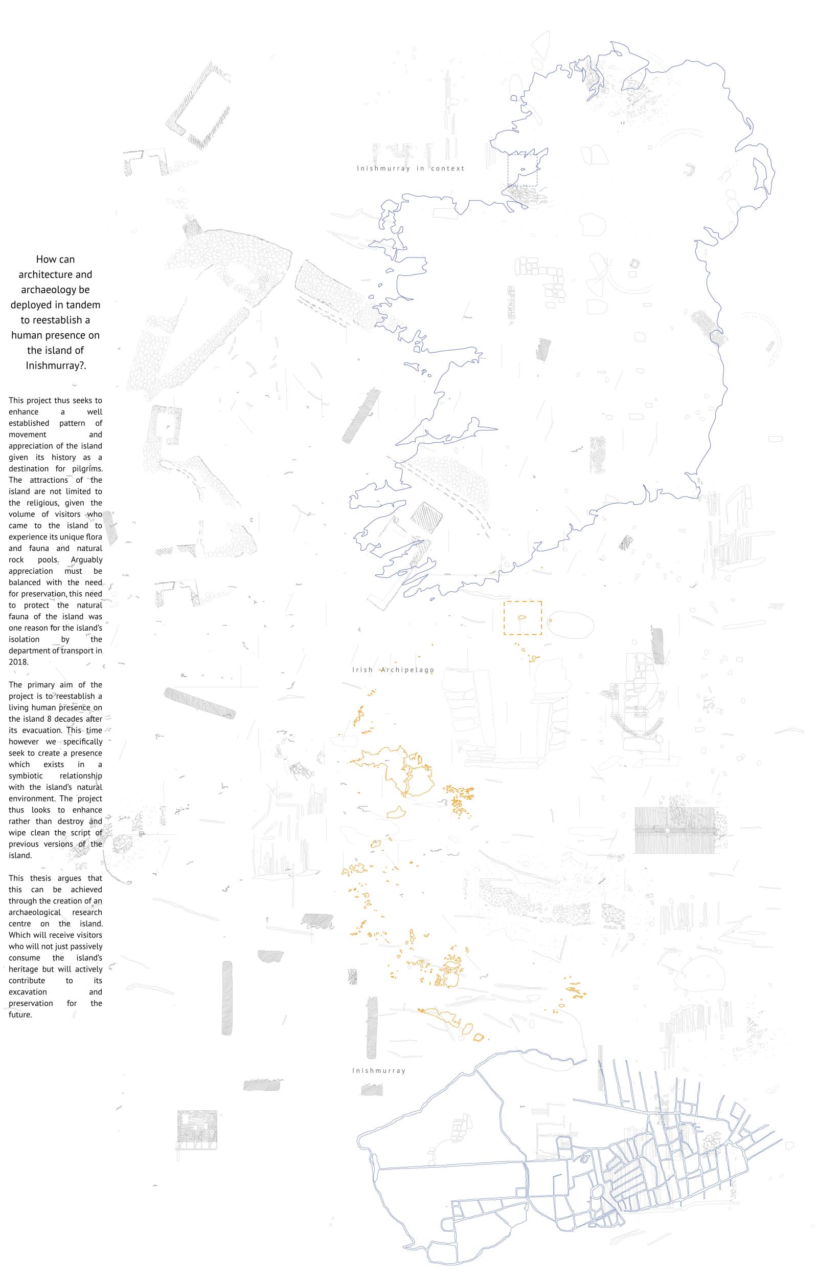 How Can Architecture and Archaeology Be Deployed in Tandem to Reestablish a Human Presence on the Island of lnishmurray? Part 2 Project 2023 Amar Chekchak Ulster University | UK My thesis is a project focused on the historic island of lnishmurray off the northwest coast of Ireland. The island's rich archaeologicaldepth and historical character have been vastly under appreciated, despite the presence of a 6th-century monastic settlement. My goal is to enhance the island's attraction as a destination for pilgrimage and nature enthusiasts while preserving its unique flora, fauna, and ancient structures. Recognising the need for conservation, I aimed to establish a balance between appreciation and preservation.Conceptualising the island as a palimpsest of past states, my project connects past and future through depicting the island's evolution over the centuries. Moreover, it establishes thematic links between archaeology and architecture, both of which interact with existing and potential environments. The central objective is to reestablish a living human presence on the island through an architectural intervention that respects and enhances its natural environment. To achieve this, I propose an archaeological research centre where visitors actively contribute to the excavation and preservation of the island's heritage. Each structure in the design corresponds to an existing element of the island's environment, ensuring a symbiotic relationship that honours and enhances the island's significance for visitors and potential residents alike.Finally, my project aims to honour the island's historical importance while fostering a sustainable human presence that coexists harmoniously with its natural surroundings. Tutor(s) Paul Clarke
