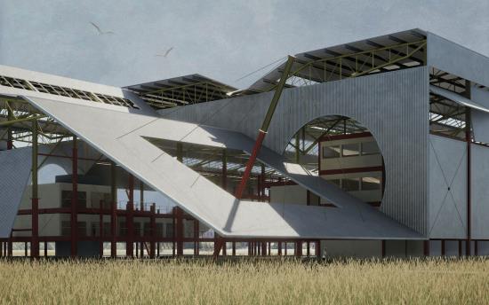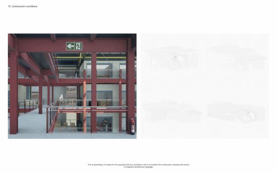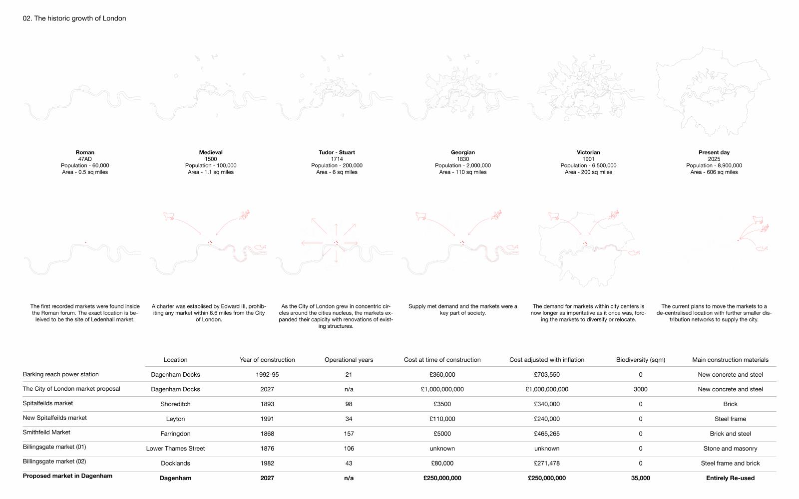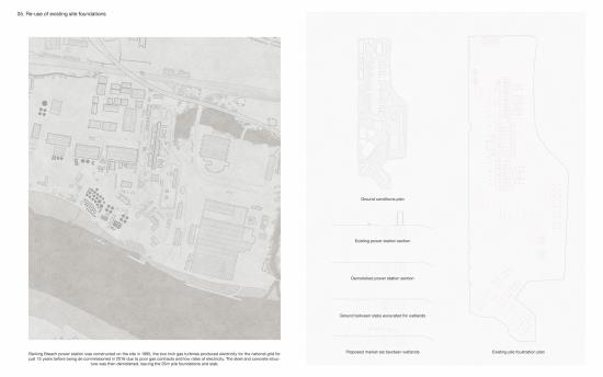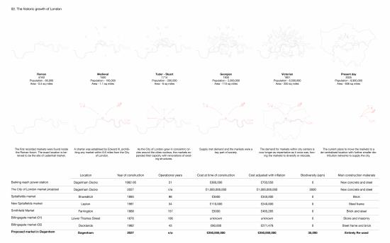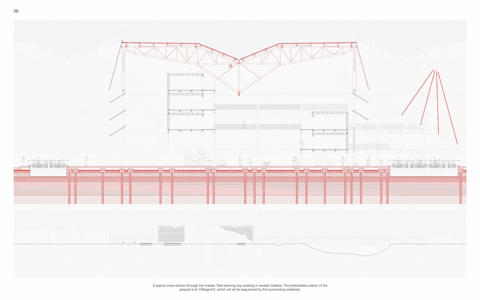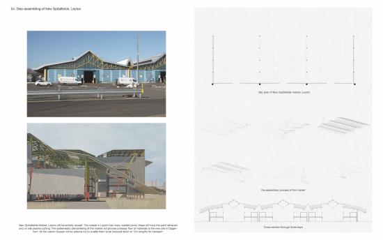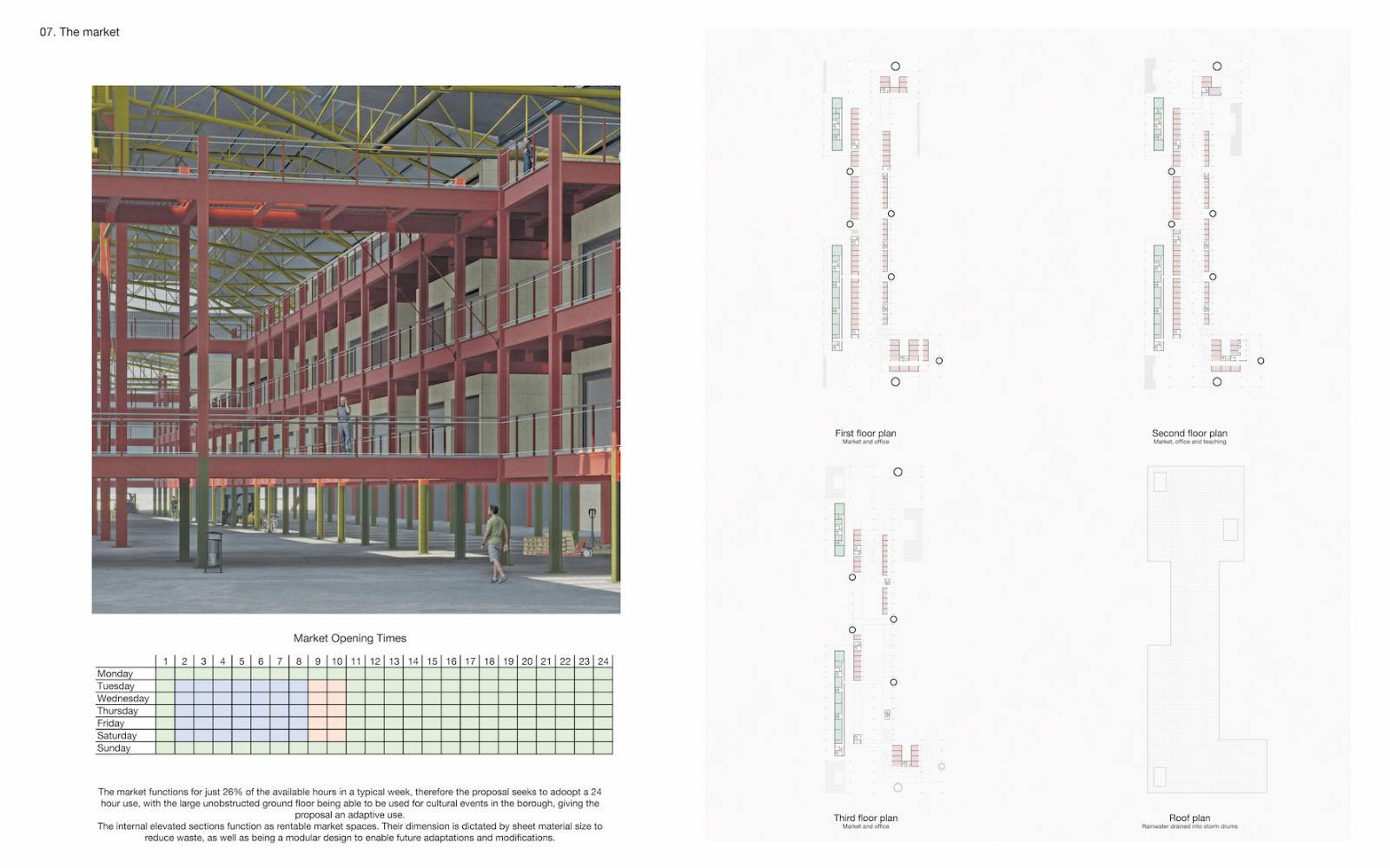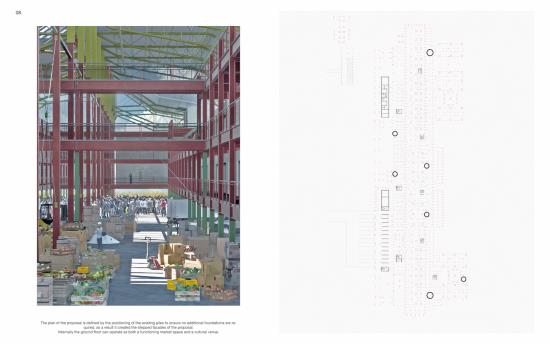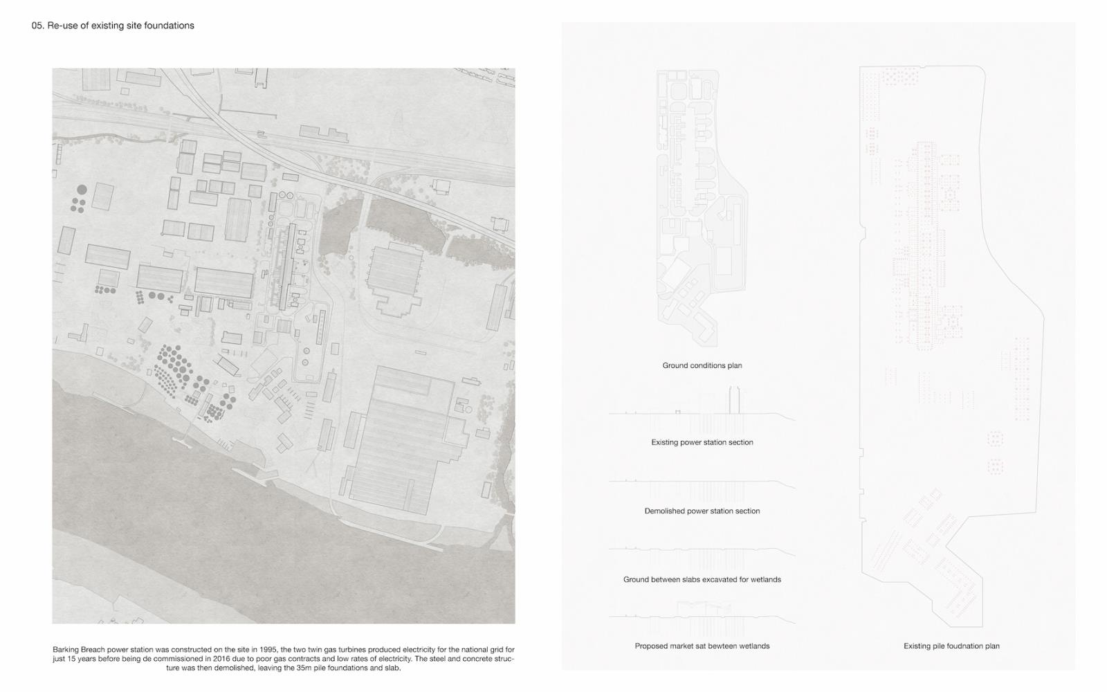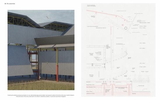 Dis-assemble/Re-assemble: The Temporary Nature of Buildings Part 2 Project 2023 Jacob Lee Kingston University Kingston | UK This project seeks to redefine how we approach land development through a lens of ecology and radical reuse, by reimagining the development of a site in Dagenham, East London, which will soon become home to the City of London's three relocated wholesale markets: Spitalfields, Smithfield and Billingsgate. A new ecological corridor will expand neighbouring Sites of Importance for Nature Conservation (SINCs) and connect cut off residential neighbourhoods to the River Thames, whilst also addressing the growing impermeability of cities, and the resulting risks of pluvial flooding. Existing foundations and ground slab of a now demolished gas power-station are reused to define the limits to the new market footprint, whilst the rest of the site is returned to its historic wetlands condition, to provide local flood mitigation. The new building itself will be constructed by disassembling and moving the existing New Spitalfields market and other decommissioned industrial buildings, to be reassembled on site as a new public architecture that can host markets from 4am to 8am weekdays and be used as a significant new community and events space for the locality and London as whole. Tutor(s) Nicholas Lobo Brennan Astrid Smitham