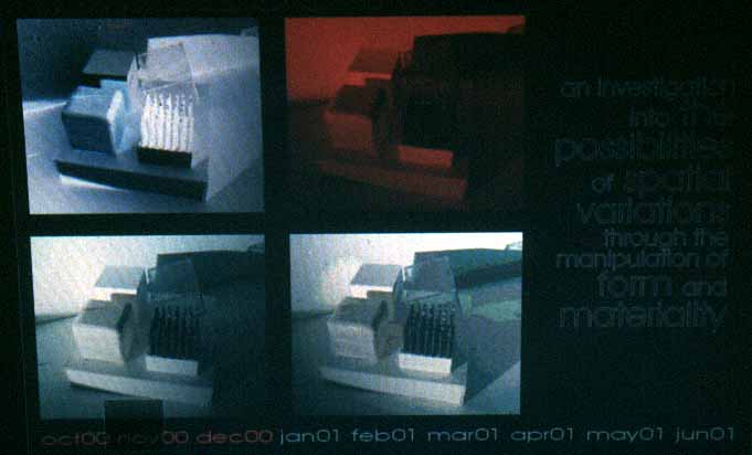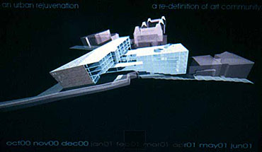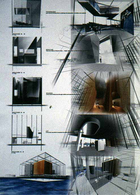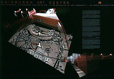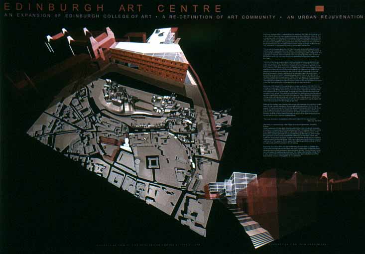 Competition Architecture Part 2 Project 2001 Choon Yen Yap Edinburgh College of Art | UK The work I have presented is the portfolio of my projects undertaken in the school's Competition Unit. The projects are mutually independent of each other.My initial idea for the submission for the RIBA President’s Medal was to choose one particular project and focus on recomposing its presentation on 35mm slides. This approach lead to the exclusion of work which I had found so rewarding: working within the discipline of a widely differentiated range of self selected competition briefs with limited time scales and unique presentation formats.The portfolio is not intended to communicate all the thoughts and ideas about each project but to confirm to this international forum of architectural education the most valuable and exciting discovery I made - that architecture can be explored so interestingly under such circumstances. As a member of the school's Competitions Unit, Yen has operated under circumstances which presuppose an appetite for self management and independent learning while providing a platform for a culture of enquiry and debate.He is a unique student who has revealed a quiet but formidable love of his subject. His capacity to engage in a creative yet critical dialogue with himself combined with exceptional talent has resulted in four superb student competition entries:Edinburgh Art Centre - The re-definition of Art Community: An Urban Rejuvenation.International Association of Collegiate Schools ofArchitecture: Award for ExcellenceExpo Site and UK Pavilion - An atomized concept of Expo as a series of permanent social urban investments along the Tyne in Newcastle and a floating pavilion to represent the UK's achievements in Culture, Science, Technology and Medicine Corus Student ArchitecturalCompetition: Short-listed.Park for the Future - The park as an urban device that synchronizes the different paces of living pattern within a city.Edinburgh School of Architecture and Mackintosh School of Architecture joint one day competition: Short-listed.Scar City - The integration of physical and virtual spaces within the city as a solution for major urban neglect. Tank Publication Architectural competitionYen was also awarded the Year Prize and received the Clason-Harvie Award for the most outstanding workWorking with Yen as his tutor has been a pleasure. I believe that he has the capacity to become an influential architect through his future engagement with the profession. His work speaks for itself.