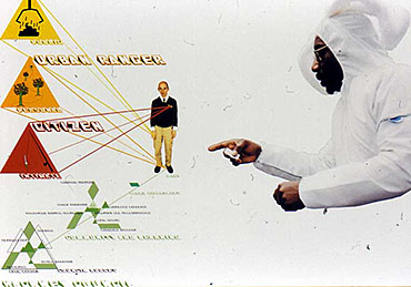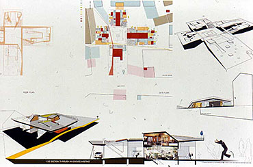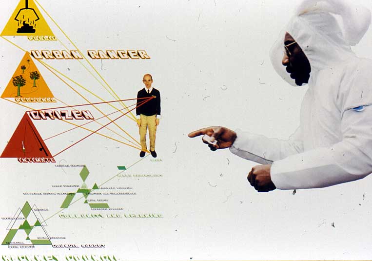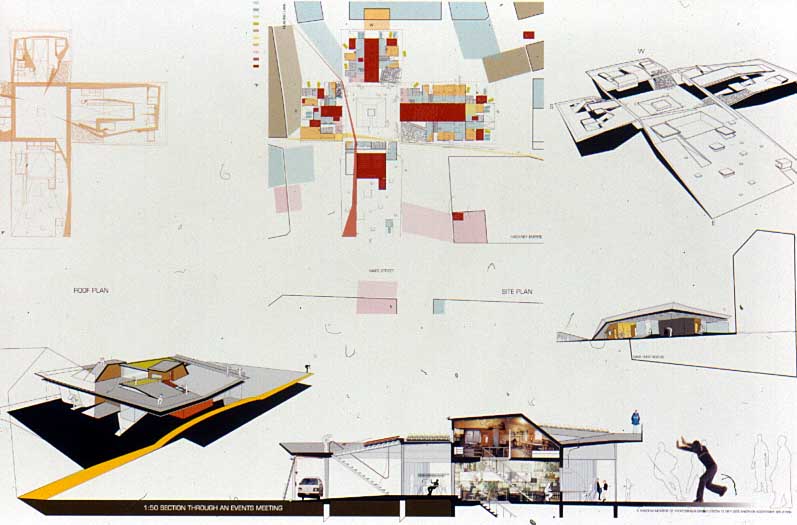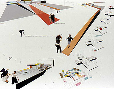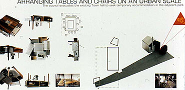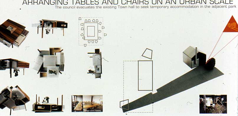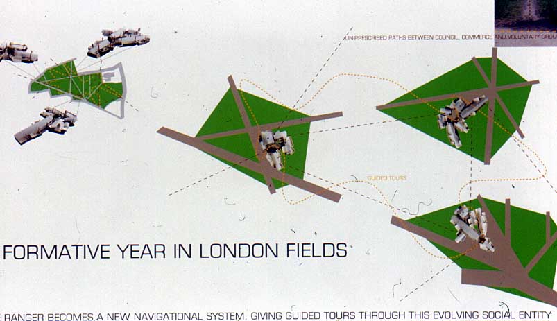 Urban Ranger Part 2 Project 2001 Gregory Epps Royal College of Art | UK RANGERThe 'Urban Ranger' training programme has extended the conventional role of Hackney's park keepers to become events co-ordinators and cultural mediators. Could this system enable the intimate passions and skills of the citizen to enter public space and redefine the identity of an institution?FIELDAn unofficial transaction takes place at Hackney council's periphery. Rangers have the opportunity to appropriate council resources in exchange for hosting events, meetings and training sessions within personalised parks buildings. The first stage of this proposal speculates the council's evacuation of the existing Town hall to seek temporary accomodation in the adjacent park. New public/ private initiatives are envisaged to occur as personal affiliations extend beyond departmental boundaries. The 'Urban Ranger' becomes the new navigational system for the citizen, giving guided tours through this evolving social enity.SQUAREThe experiences gained from the council's formative year in the park have the potential to generate an unexpected programme for the new Town square. The impenetrable 'box' of the old Town hall unfolds, forming a permeable envelope for the new institution. Patrick's insatiable appetite for fancy dress activates the new Town square as a site for an Easter egg hunt that weaves its route through the council hierarchy. By attending subsequent meetings and training sessions, the spectator is invited to become a participator, disseminating council resources, enabling individuals the possibility to redefine the nature of civic space. This student's ability to immerse himself within the culture of the institution and become a working member of their team is a commendable approach. He deconstructs the very idea of the town hall, reconfigures it back to the client and radically questions the very nature of the organisation. He is an exemplary student who selflessly pursues the core issues of the subject above style and graphic representation.