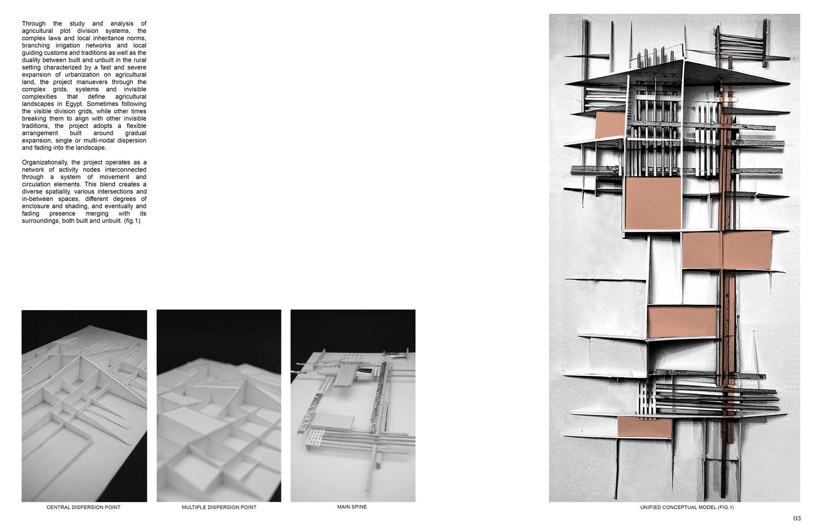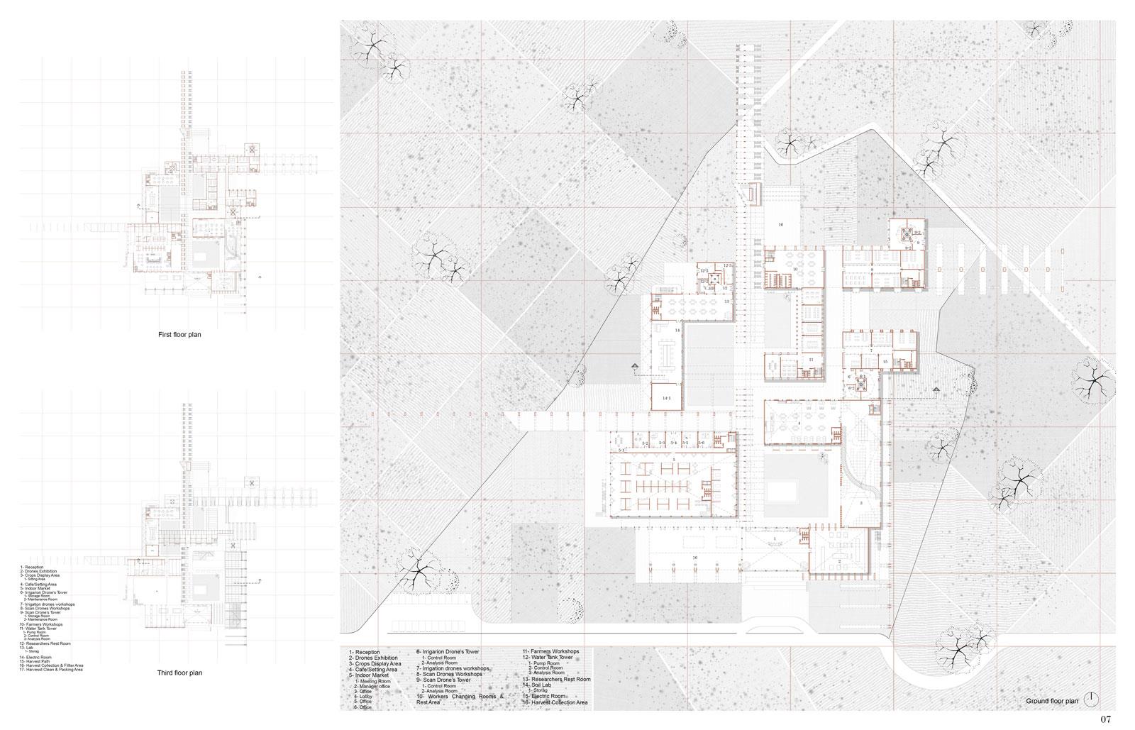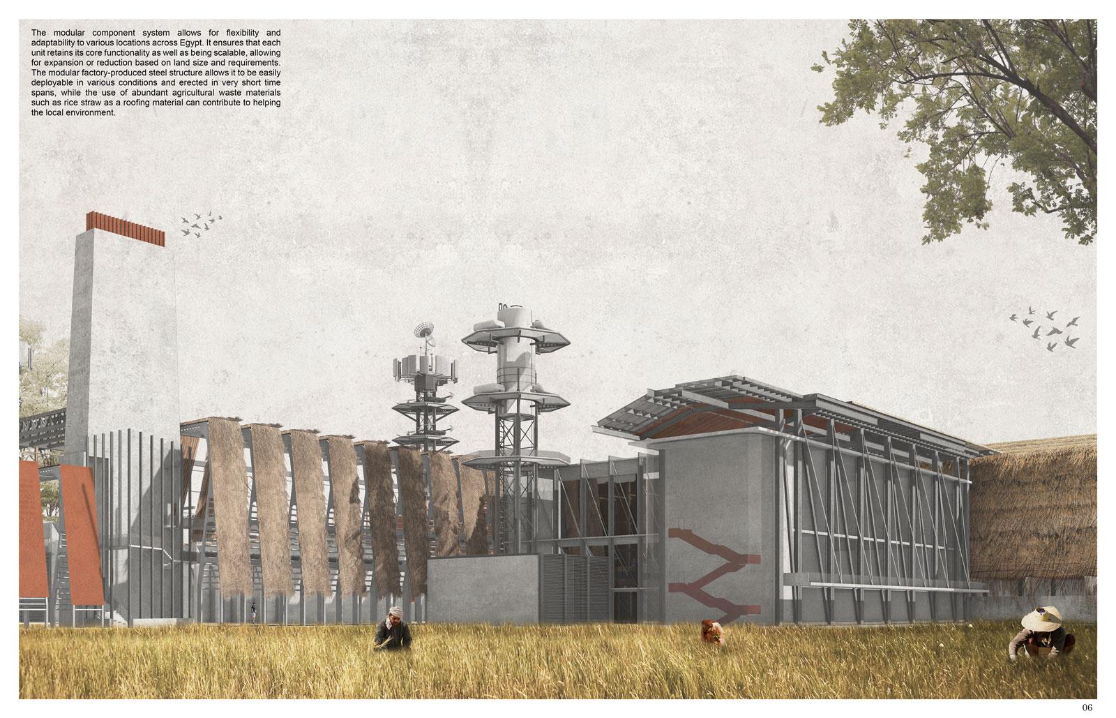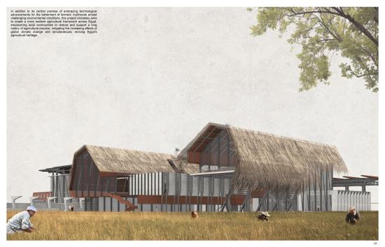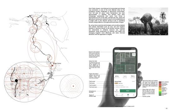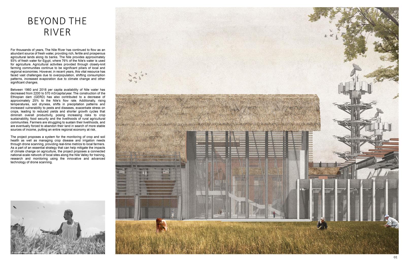 Beyond the River Part 2 Project 2024 Mai Nezar Arab Academy for Science, Technology & Maritime Transport - Smart Village Campus Cairo | Egypt For thousands of years, The Nile River has continued to flow as an abundant source of freshwater, providing rich, fertile and prosperous agricultural lands along its banks. However, in recent years, this vital resource has faced vast challenges due to overpopulation, shifting consumption patterns, and climate change. Rising temperatures, soil dryness, shifts in precipitation patterns and increased vulnerability to pests and diseases, pose increasing risks to crop sustainability, food security and the livelihoods of rural agricultural communities. To help mitigate the impacts of climate change on agricultural activity, the project proposes a decentralised network of sites along the Nile Valley for training, research and agricultural monitoring using the innovative and advanced technology of drone scanning. Recent advancements in drone scanning allow the monitoring of crop and soil health, managing crop disease and providing appropriate irrigation needs replacing water-intensive traditional methods.In addition to its central premise of embracing technological advancements for the betterment of farmers’ livelihoods amidst challenging environmental conditions, this project ultimately aims to create a more resilient agricultural framework across Egypt, empowering local communities to restore and support a long history of agricultural practice, mitigating the increasing effects of global climate change and simultaneously reviving Egypt’s agricultural heritage. Tutor(s) Mennat-Allah El-Husseiny