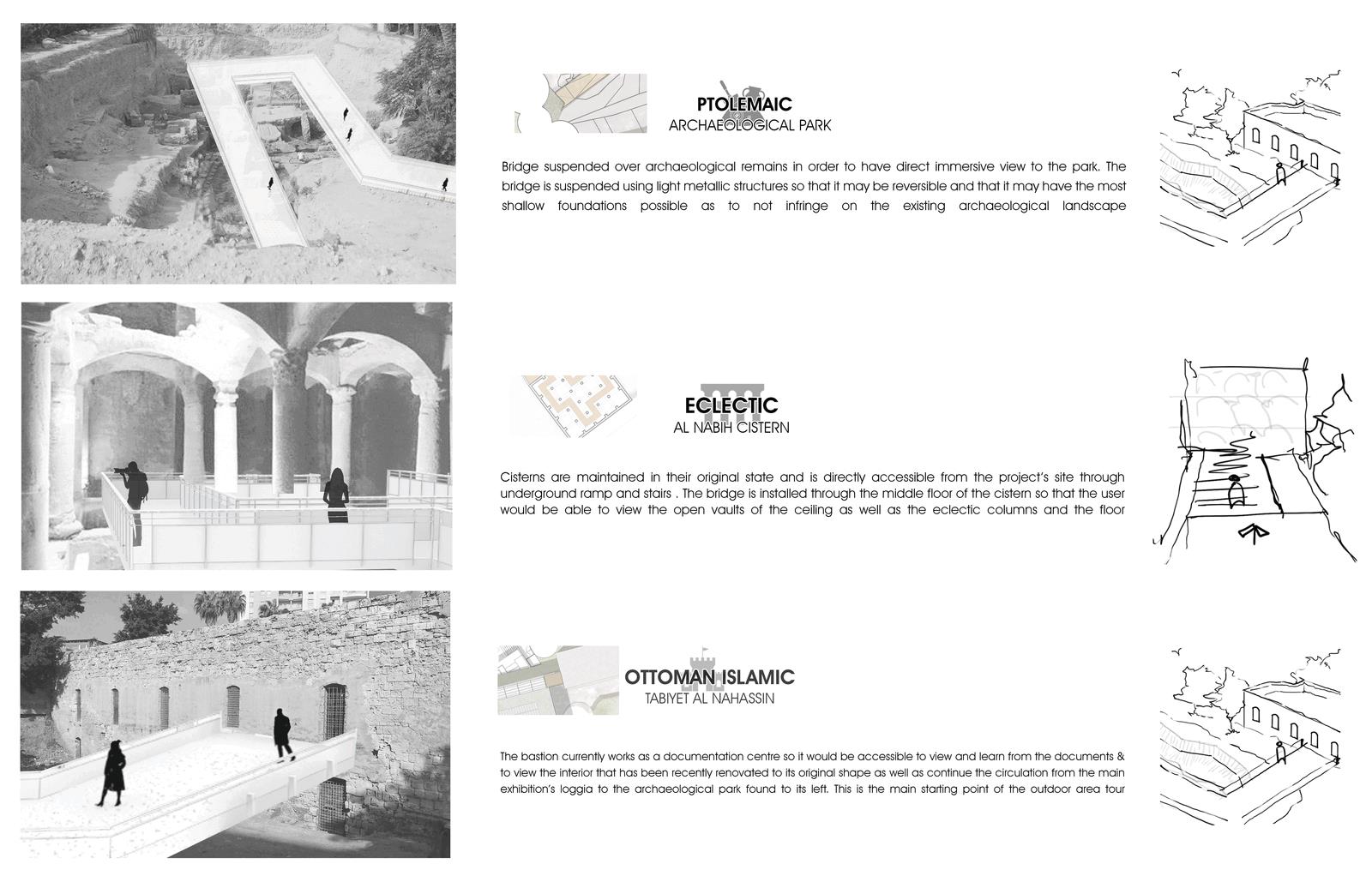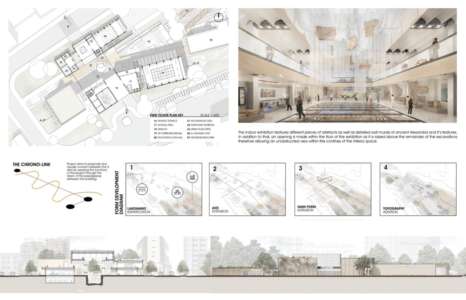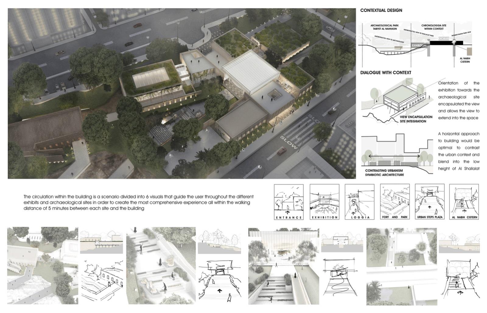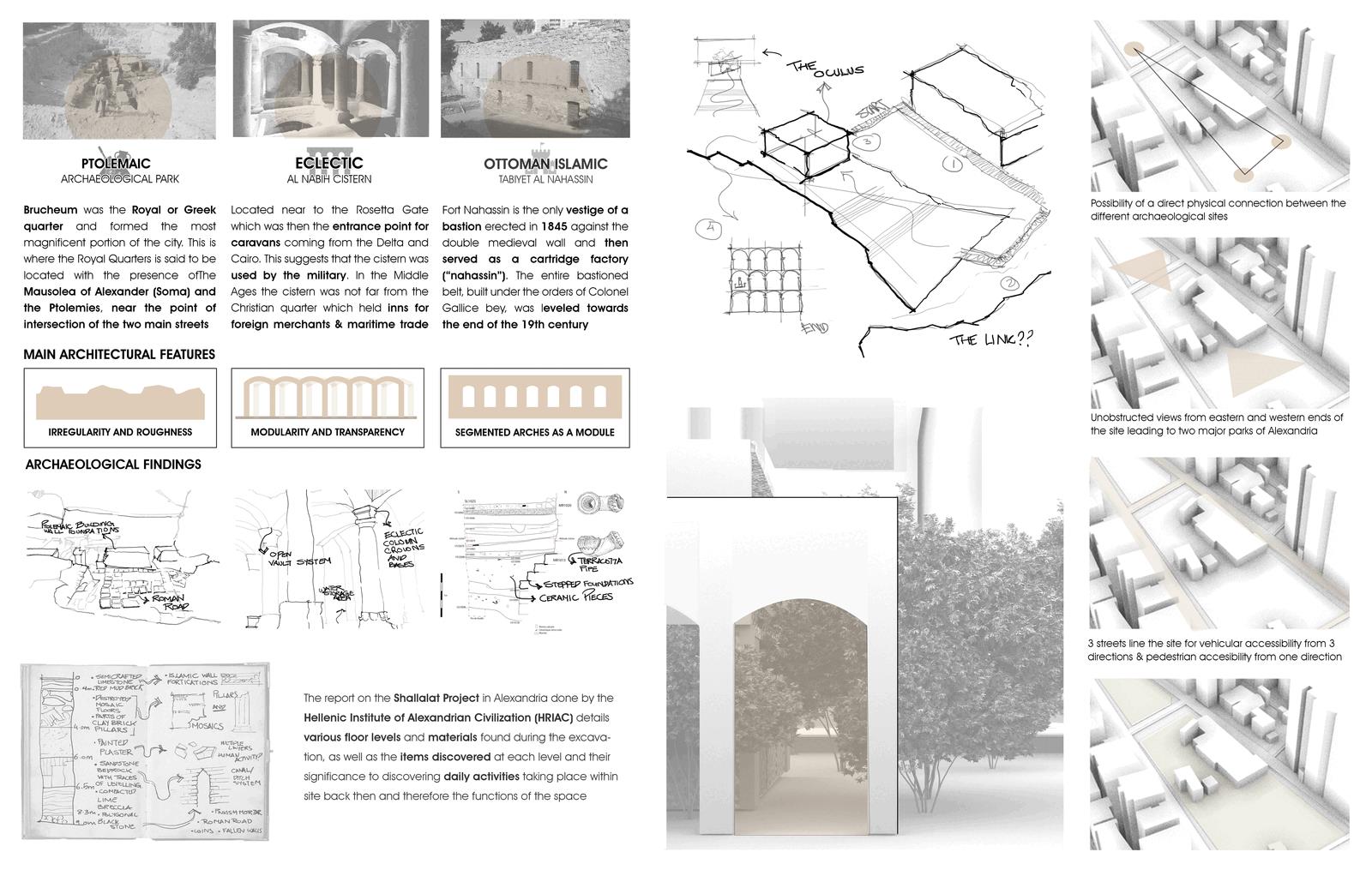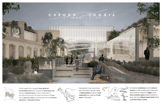 Designed to integrate, Chrono-Loggia Al Shallalat aims to breathe life back into the remaining monuments of Alexandria, buried deep within its core found at the Ancient city’s centre, right in the middle of a public park. Chrono-Loggia is derivative from the words “Chronological” and “Loggia” to depict the flow of time through the use of architectural elements such as the loggia, a Greek terminology for a sheltered corridor that links inside and out. This “Loggia” is used throughout the project as the main area of circulation and the link between the different archaeological sites surrounding the project. The project acts as a visitor’s centre to an already existing array of archaeological sites that is the three surrounding monuments and exhibits the findings that were discovered while excavating the area. It also contains the Oculus, a raised observatory deck through which the entire clearance of the park can be seen as well as deep into the streets of Old Alexandria. The Oculus also acts as an open-air theatre within the public park serving as a facility that is for the people and ensuring activation of the museum area regardless of the museum’s working hours.