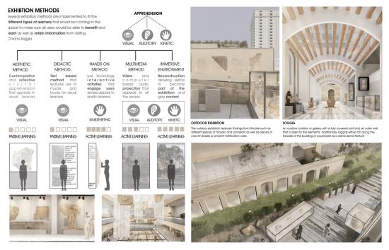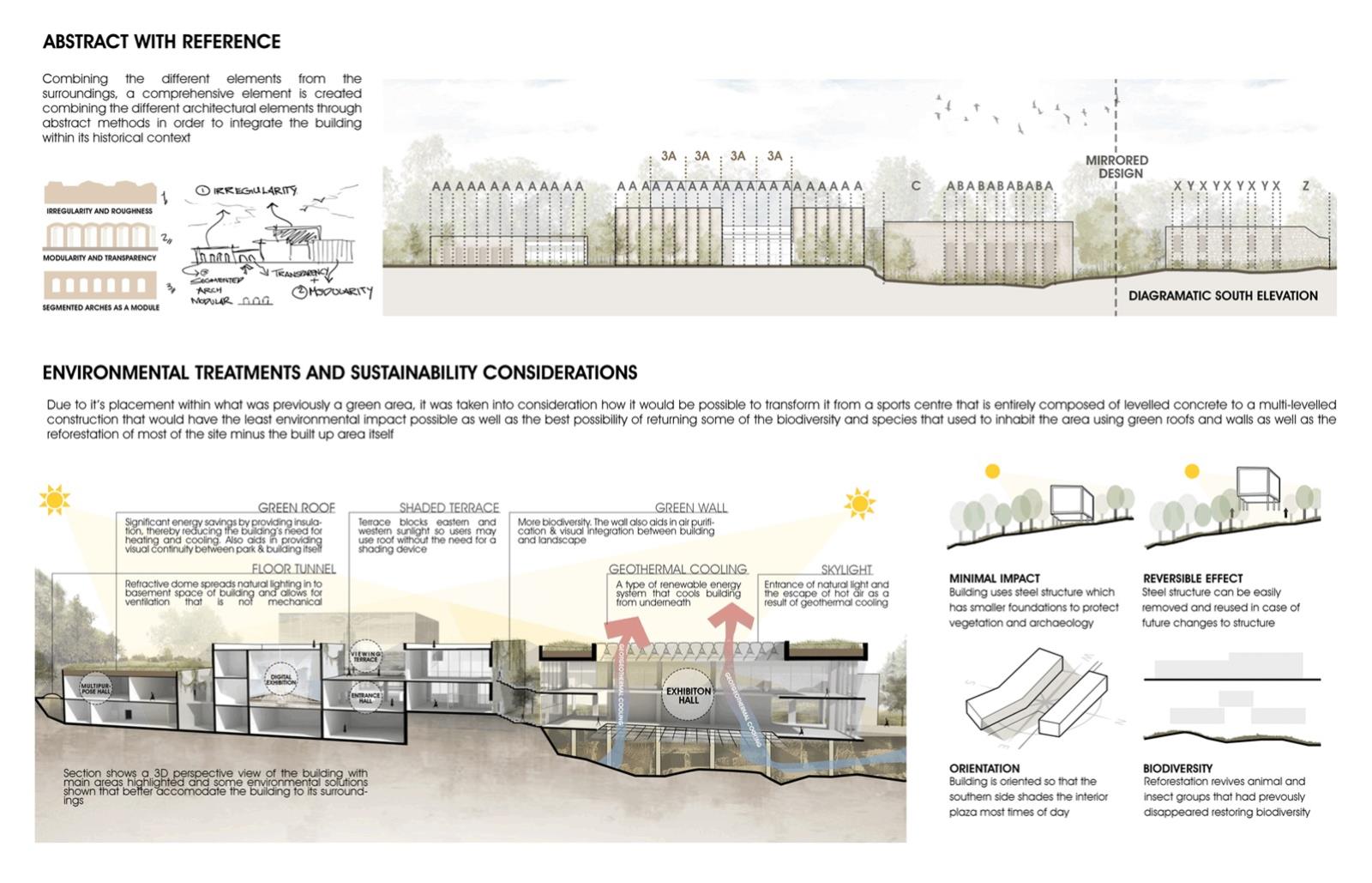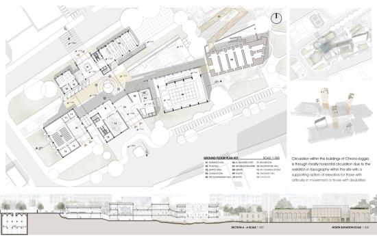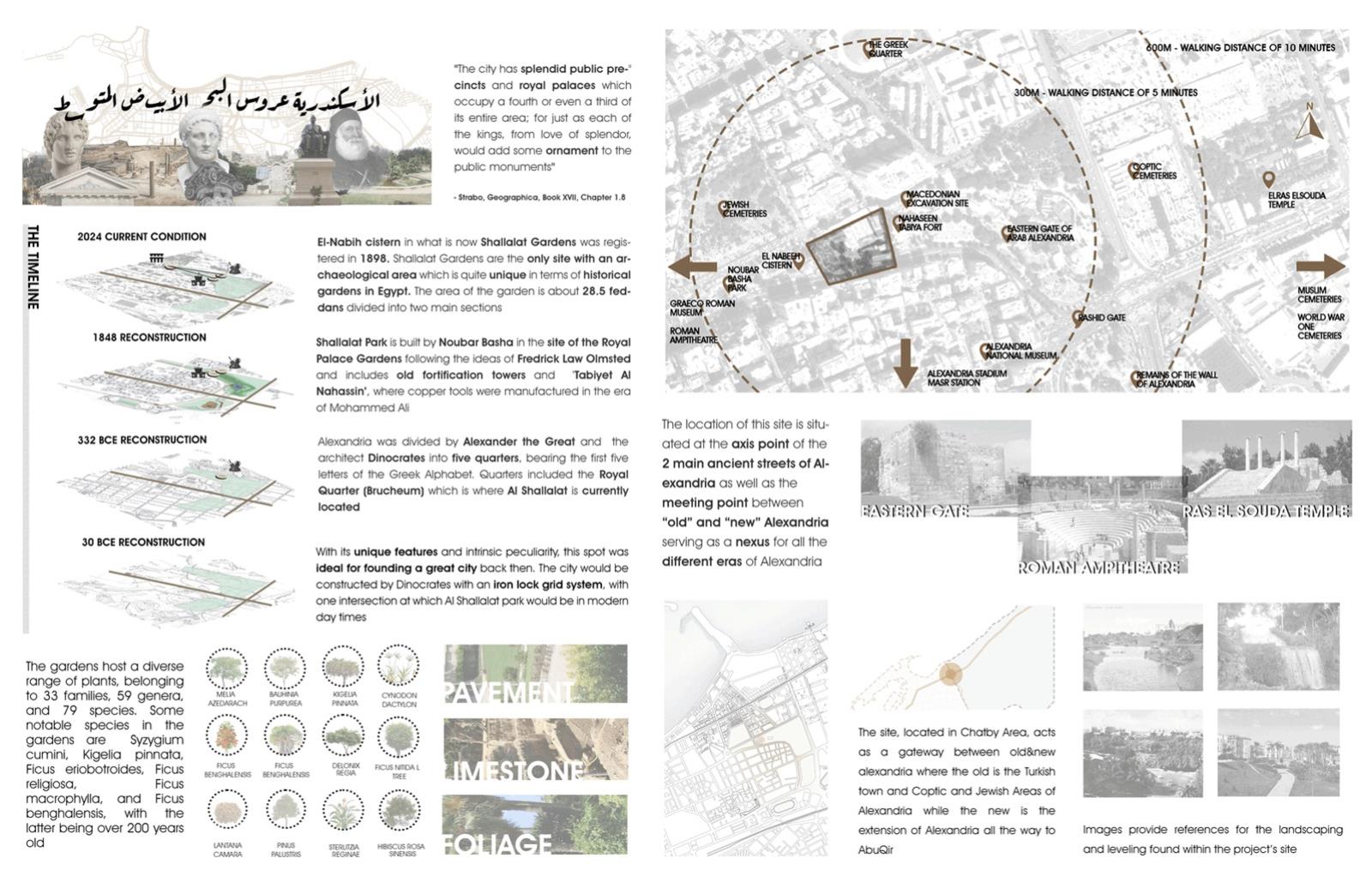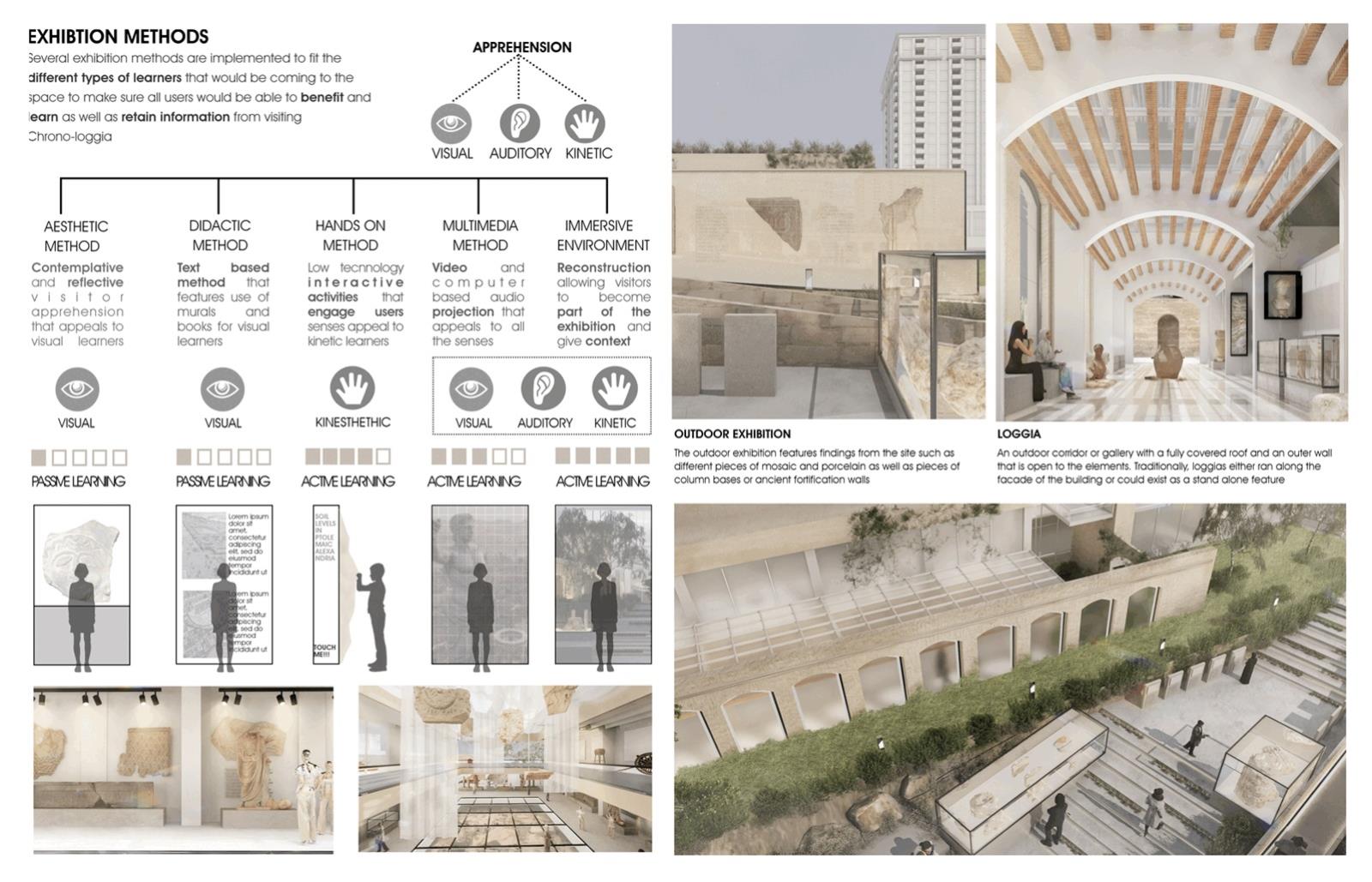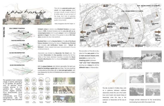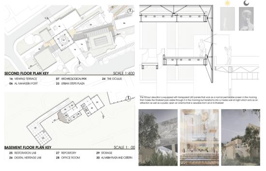Designed to integrate, Chrono-Loggia Al Shallalat aims to breathe life back into the remaining monuments of Alexandria, buried deep within its core found at the Ancient city’s centre, right in the middle of a public park. Chrono-Loggia is derivative from the words “Chronological” and “Loggia” to depict the flow of time through the use of architectural elements such as the loggia, a Greek terminology for a sheltered corridor that links inside and out. This “Loggia” is used throughout the project as the main area of circulation and the link between the different archaeological sites surrounding the project. The project acts as a visitor’s centre to an already existing array of archaeological sites that is the three surrounding monuments and exhibits the findings that were discovered while excavating the area. It also contains the Oculus, a raised observatory deck through which the entire clearance of the park can be seen as well as deep into the streets of Old Alexandria. The Oculus also acts as an open-air theatre within the public park serving as a facility that is for the people and ensuring activation of the museum area regardless of the museum’s working hours.